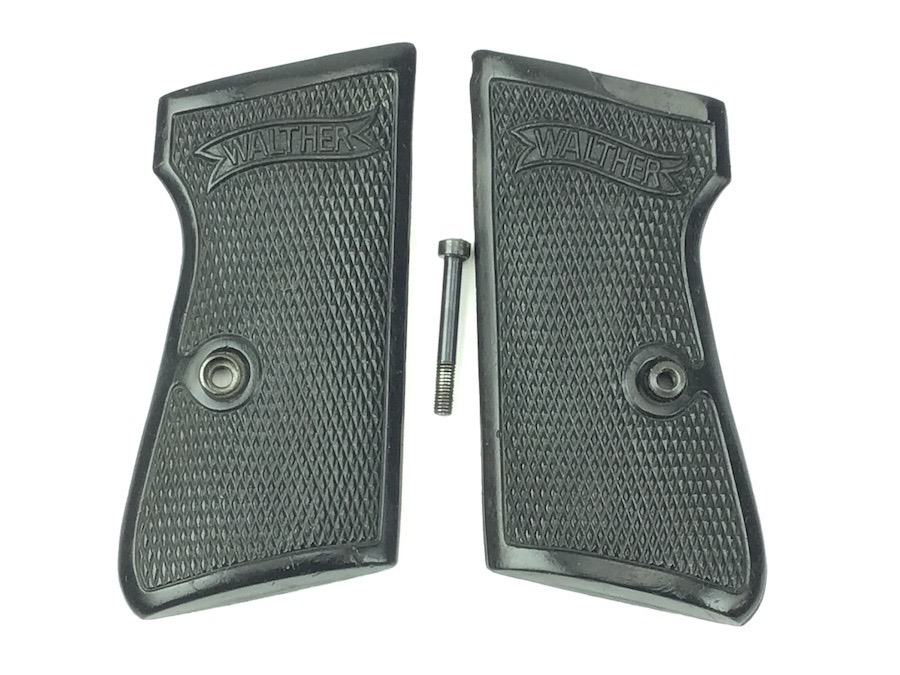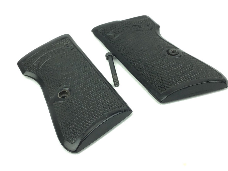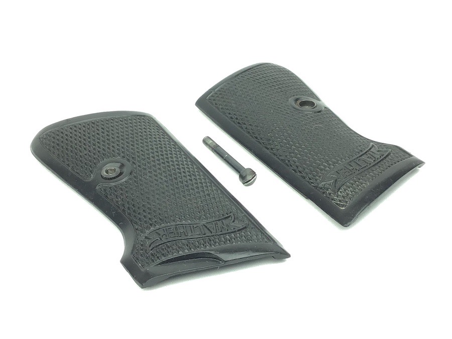 12/12/22 – Original and minty condition. Walther PP Grips and screw. The grips are early wartime variation with internal weights. Nice checkering and Walther logo. No cracks or chips.