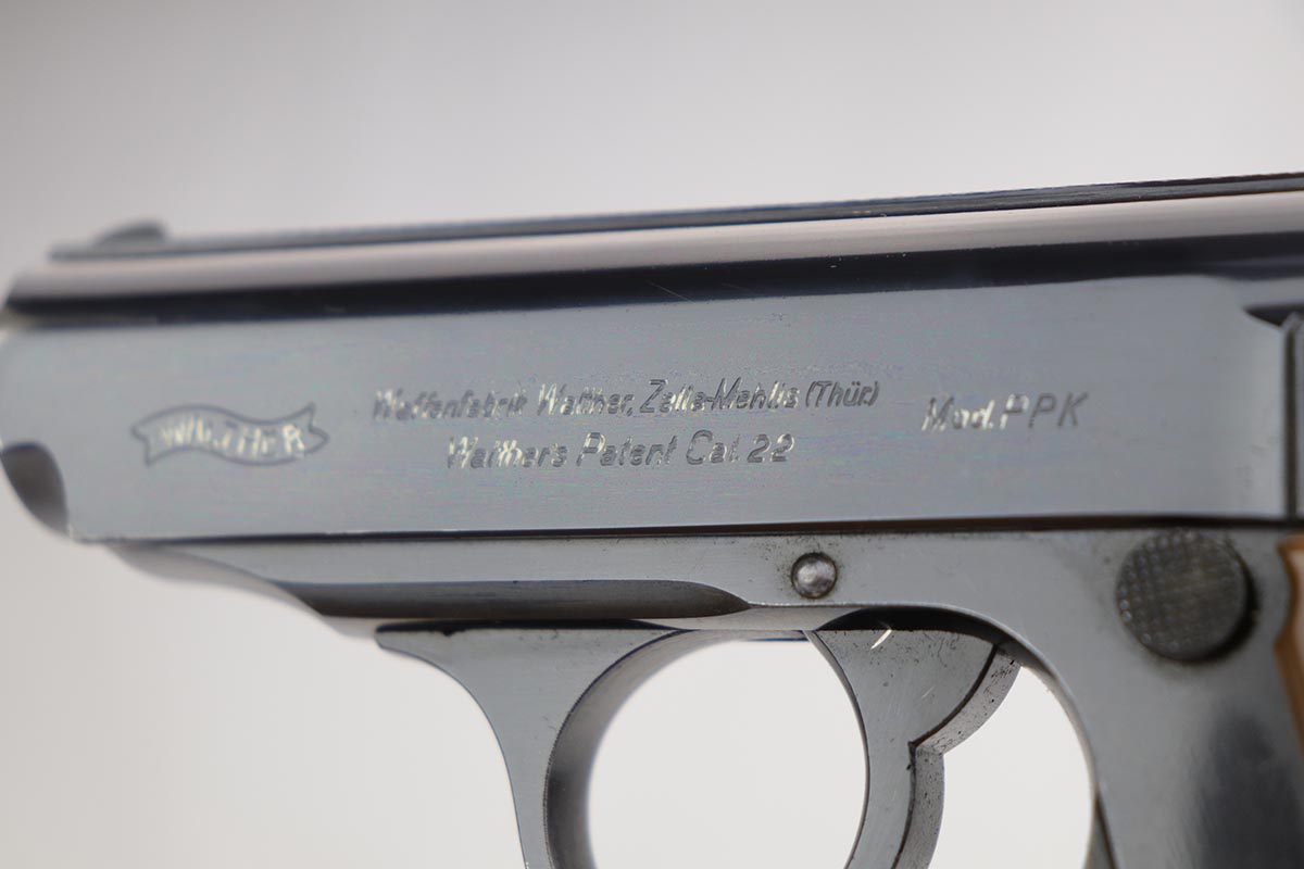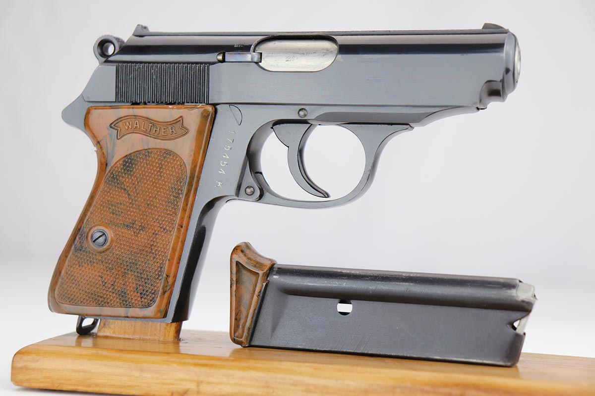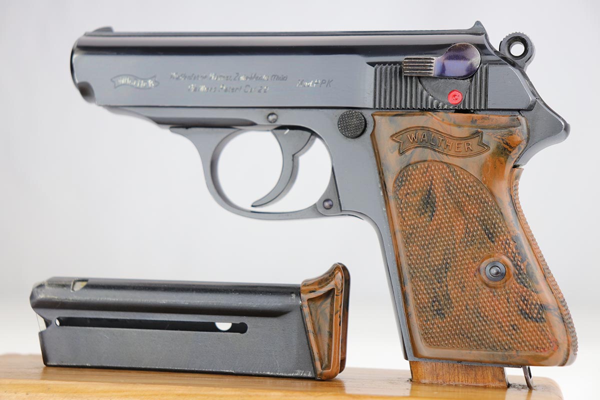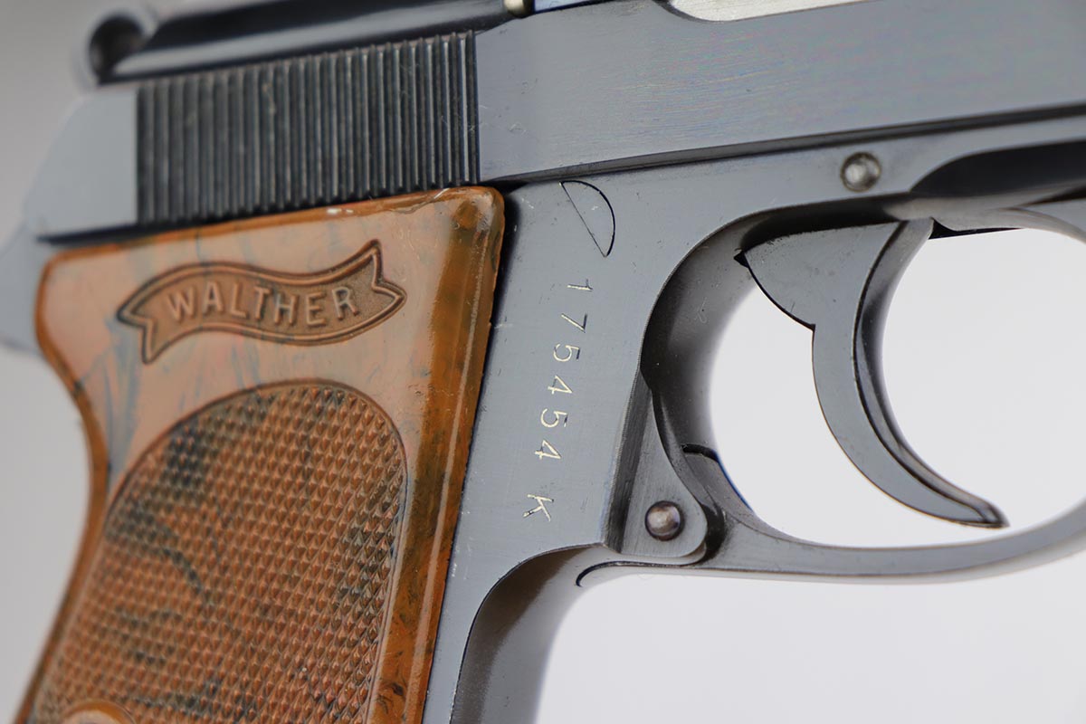 1/3/20 – This is a near-mint Walther PPK from 1938-39, and chambered in .22LR. It has 1-2% wear near the muzzle on either side of the slide, but virtually mint otherwise. All original and correct. Mint bore. Excellent grip with no major cracks or chips. Same goes for the magazine with finger extension, which retails for $400+ on its own. Tough to upgrade this one.