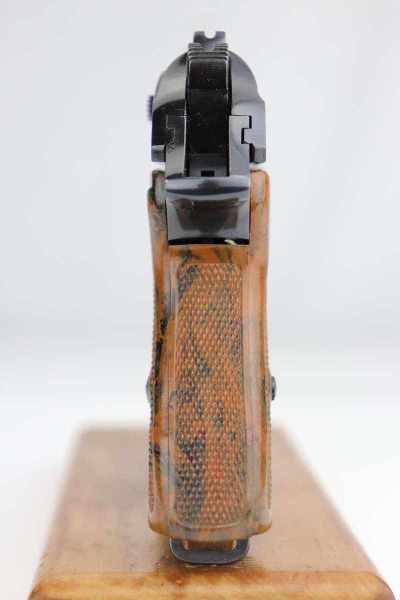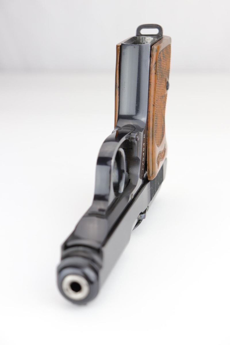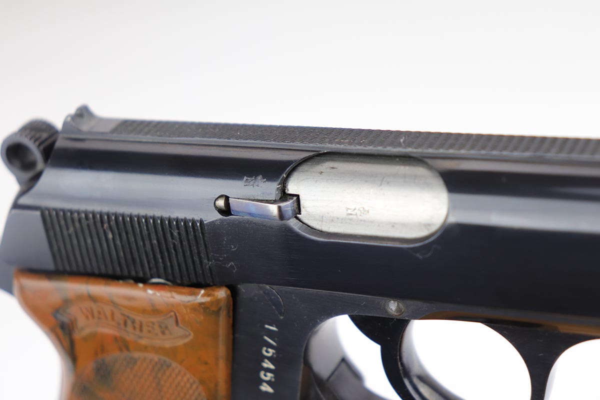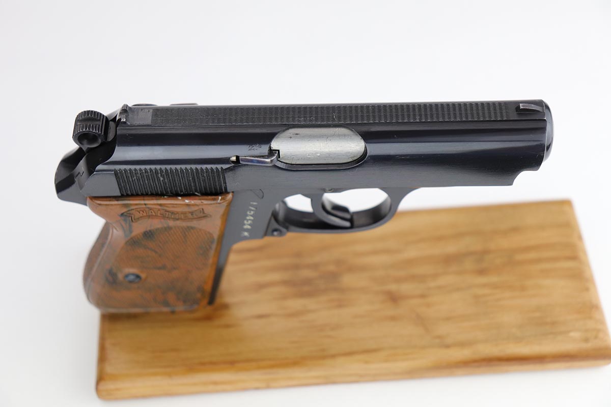 1/3/20 – This is a near-mint Walther PPK from 1938-39, and chambered in .22LR. It has 1-2% wear near the muzzle on either side of the slide, but virtually mint otherwise. All original and correct. Mint bore. Excellent grip with no major cracks or chips. Same goes for the magazine with finger extension, which retails for $400+ on its own. Tough to upgrade this one.