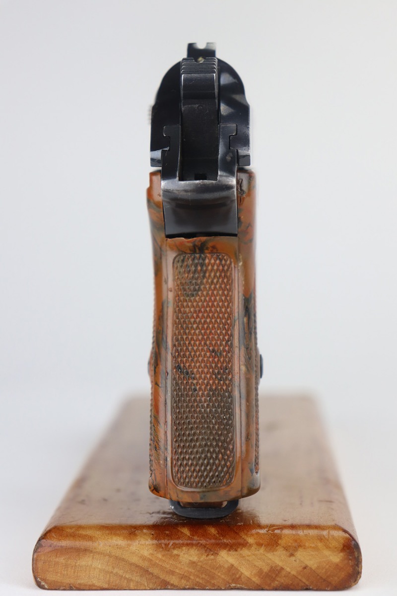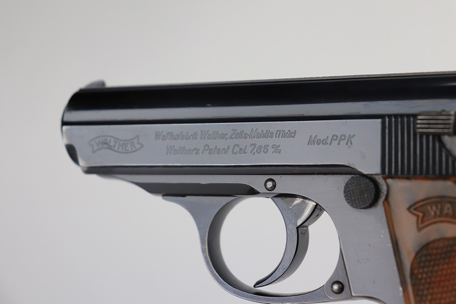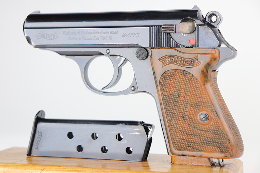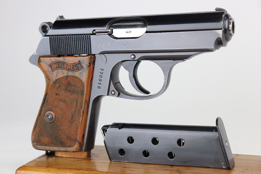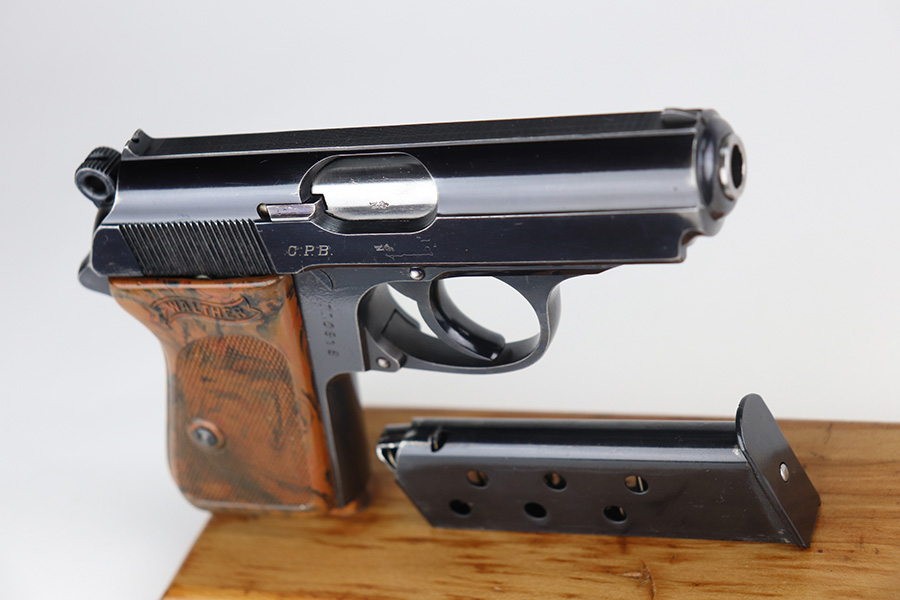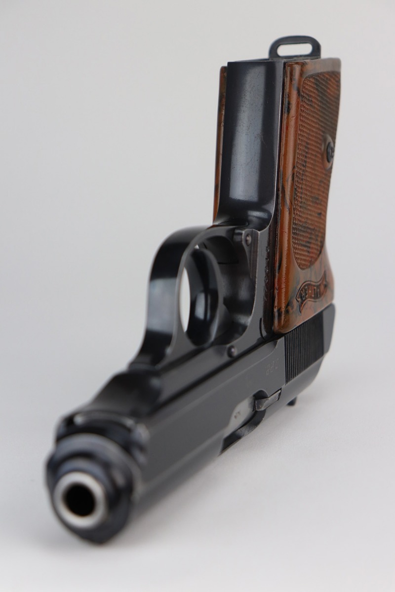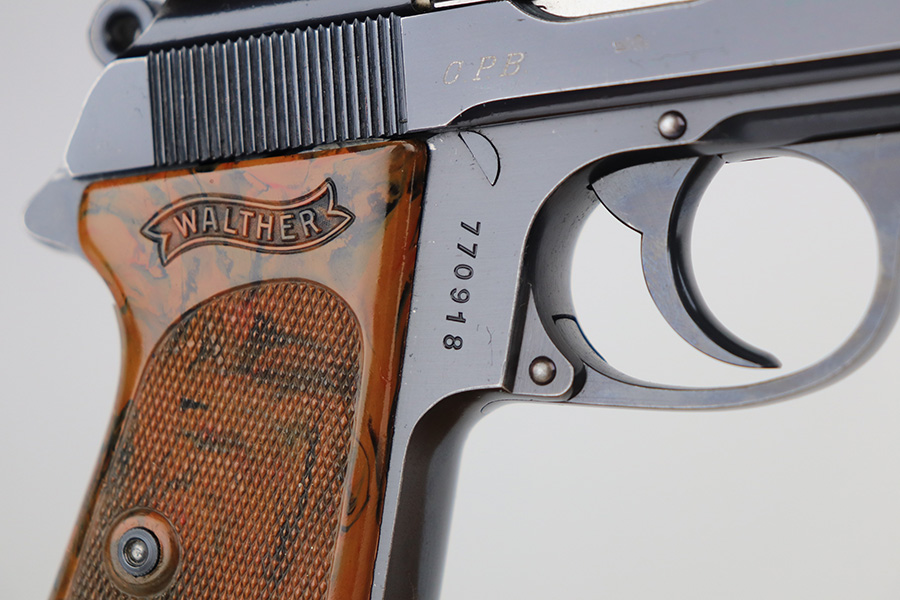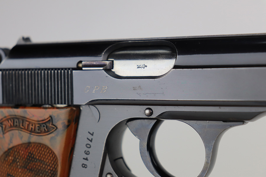 6/22/21 – This is a minty example of a very early Walther PPK manufactured in 1932. The gun is all matching and has the proper “Crown N” proofs. This one also has a post-factory “C.P.B.” marking on the slide. This is a known variation, but there is a lot of debate in the collector community about what it actually stands for. The leading two theories are that it was either issued to a private bank guard or to a police organization. Either way, this is a very scarce variation. The gun has retained about 98% of its original finish. There is just a hint of wear on the high edges of the slide and minor wear around the muzzle. A few very tiny handling marks on the slide and front strap. Comes with an excellent brown grip and a correct Walther banner-only magazine. Mint bore.
