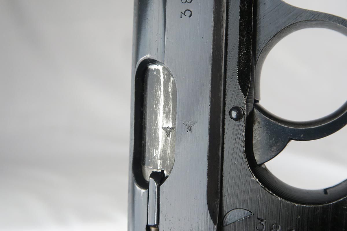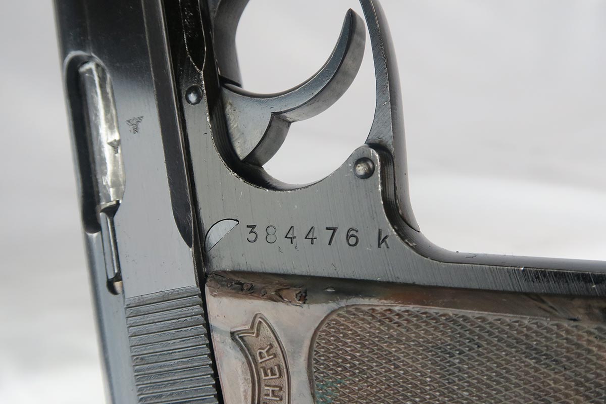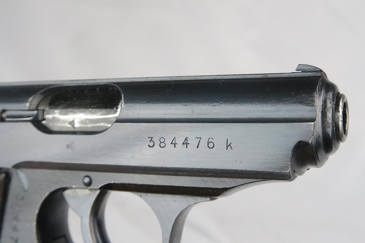 2/6/18 – This is a near-mint Walther PPK from 1942 with scarce duraluminum frame. This hard-to-find pistol also has a similarly rare gray grip, which has no cracks or chips. The original finish to slide and frame is 99% with just a spot of wear on the trigger guard. All matching and original. Excellent bore.