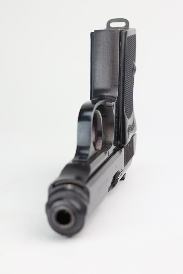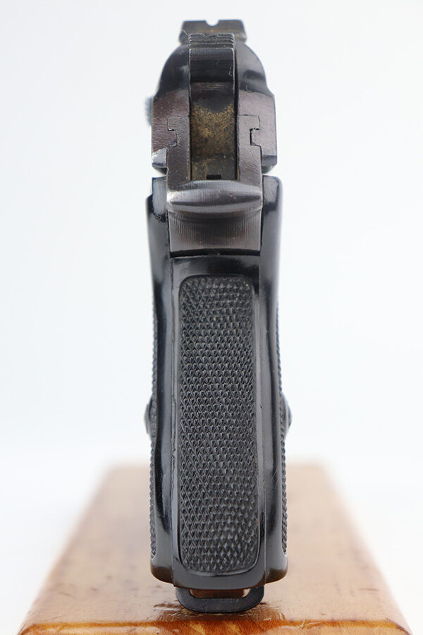 10/9/24 – This is an excellent example of a Walther PPK manufactured in 1943. This gun is all matching and has “Eagle N” proofs. The serial number is the neighborhood of other known SS guns, so this one could be SS as well. There’s no way for us to say for sure without a matching magazine. The pistol has a wartime finger extension magazine in excellent cnodition. The gun has retained about 98% of its original bluing. There is just very minor wear on around the muzzle and a few very small marks on the right side of the slide. Very tiny dots of oxidation on the front strap. Comes with an excellent grip – no chips or cracks. Mint bore.