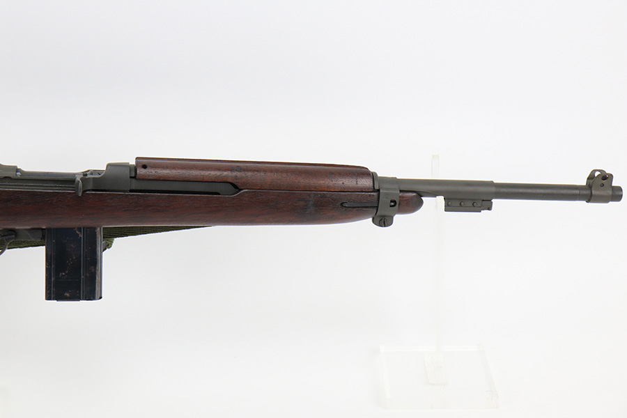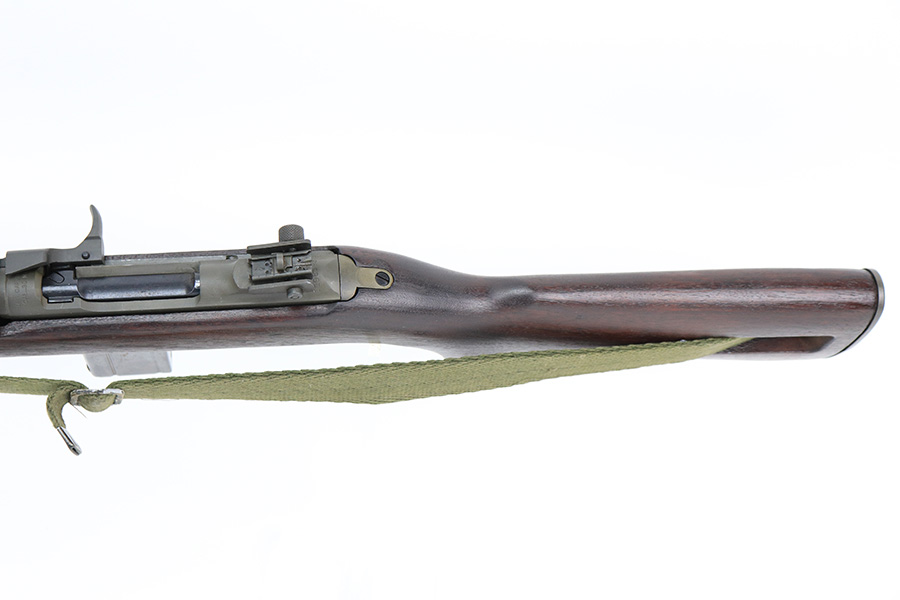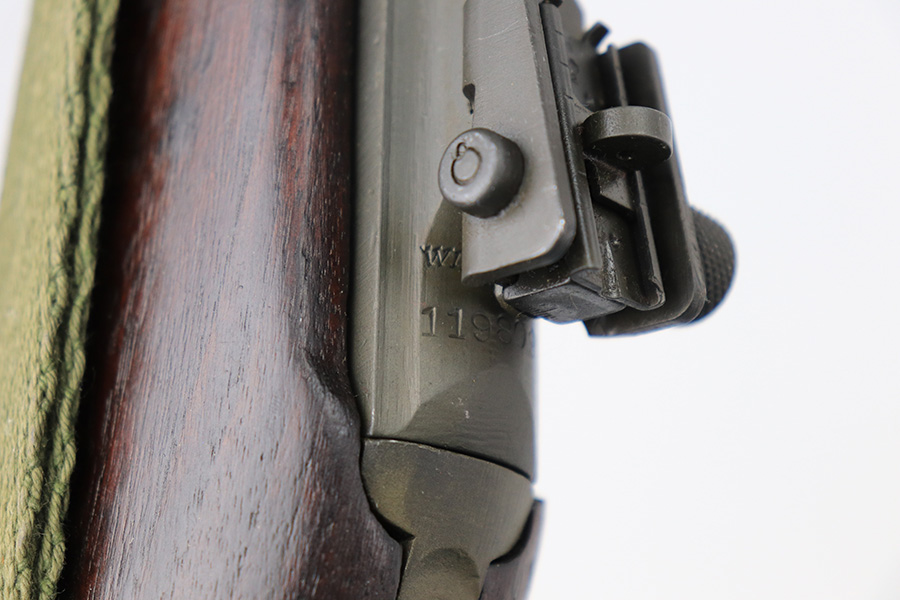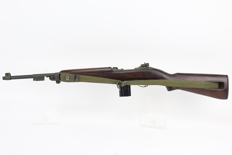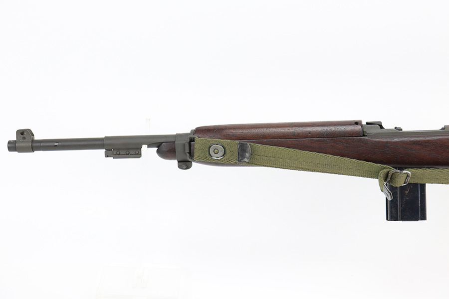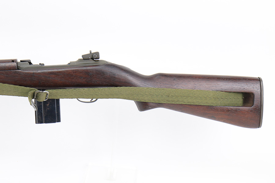 5/24/22 – This is a minty example of a Winchester M1 Carbine issued to the US military in about 1943. The gun has been completely arsenal reworked and refurbished, as evidenced by the “RIA” Rock Island Arsenal rework stamp on the left side of the butt stock. A bayonet lug and adjustable rear sight were added, likely for re-issue in the Korean War. There is almost no actual finish loss, but there is some pin-pricking under the finish along the barrel. Minty wood stock marked “P-J”. Comes with a period-correct magazine and a green canvas sling. Minty bore. Small surface crack on the top of the wrist of the stock.