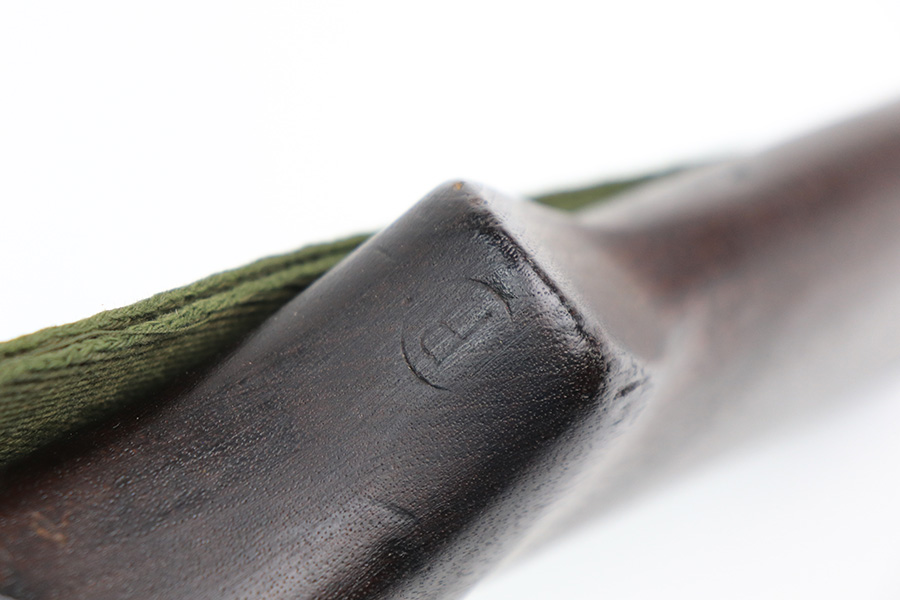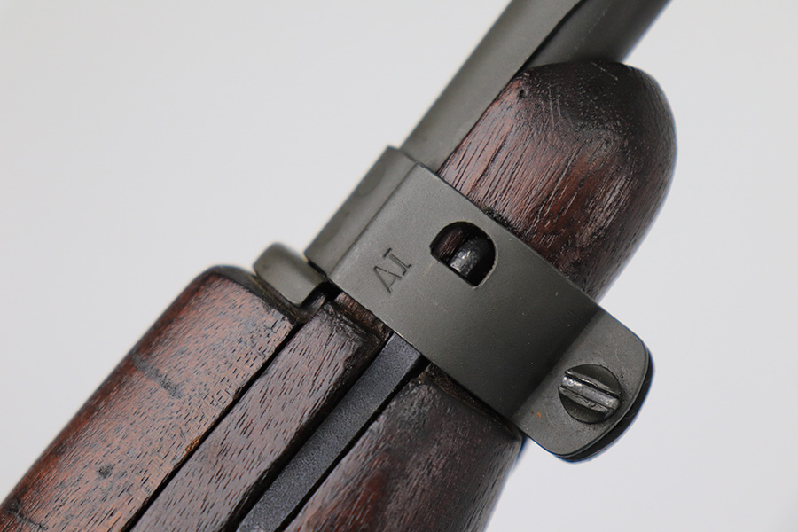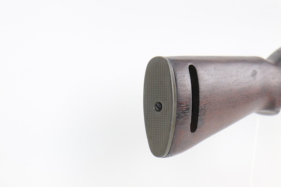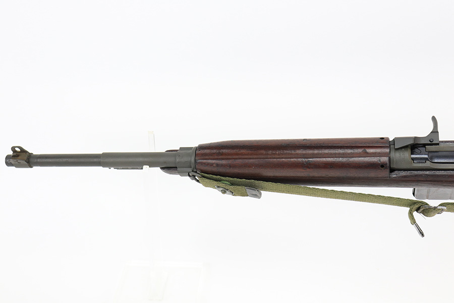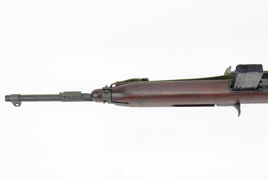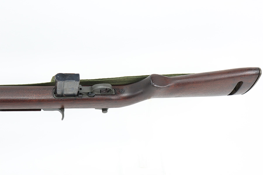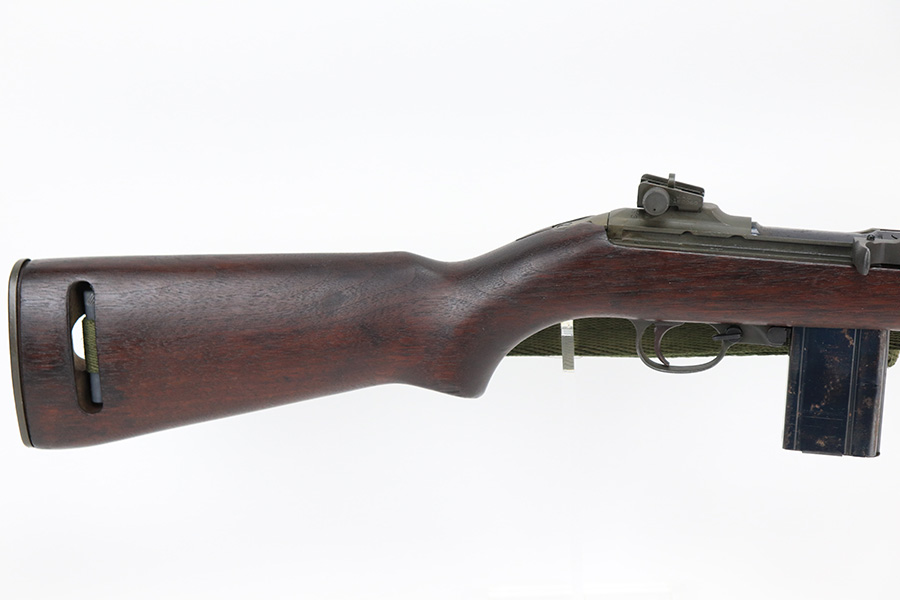 5/24/22 – This is a minty example of a Winchester M1 Carbine issued to the US military in about 1943. The gun has been completely arsenal reworked and refurbished, as evidenced by the “RIA” Rock Island Arsenal rework stamp on the left side of the butt stock. A bayonet lug and adjustable rear sight were added, likely for re-issue in the Korean War. There is almost no actual finish loss, but there is some pin-pricking under the finish along the barrel. Minty wood stock marked “P-J”. Comes with a period-correct magazine and a green canvas sling. Minty bore. Small surface crack on the top of the wrist of the stock.