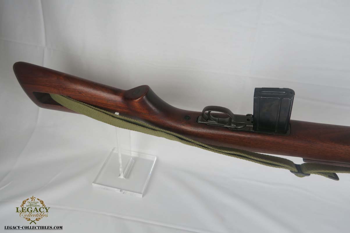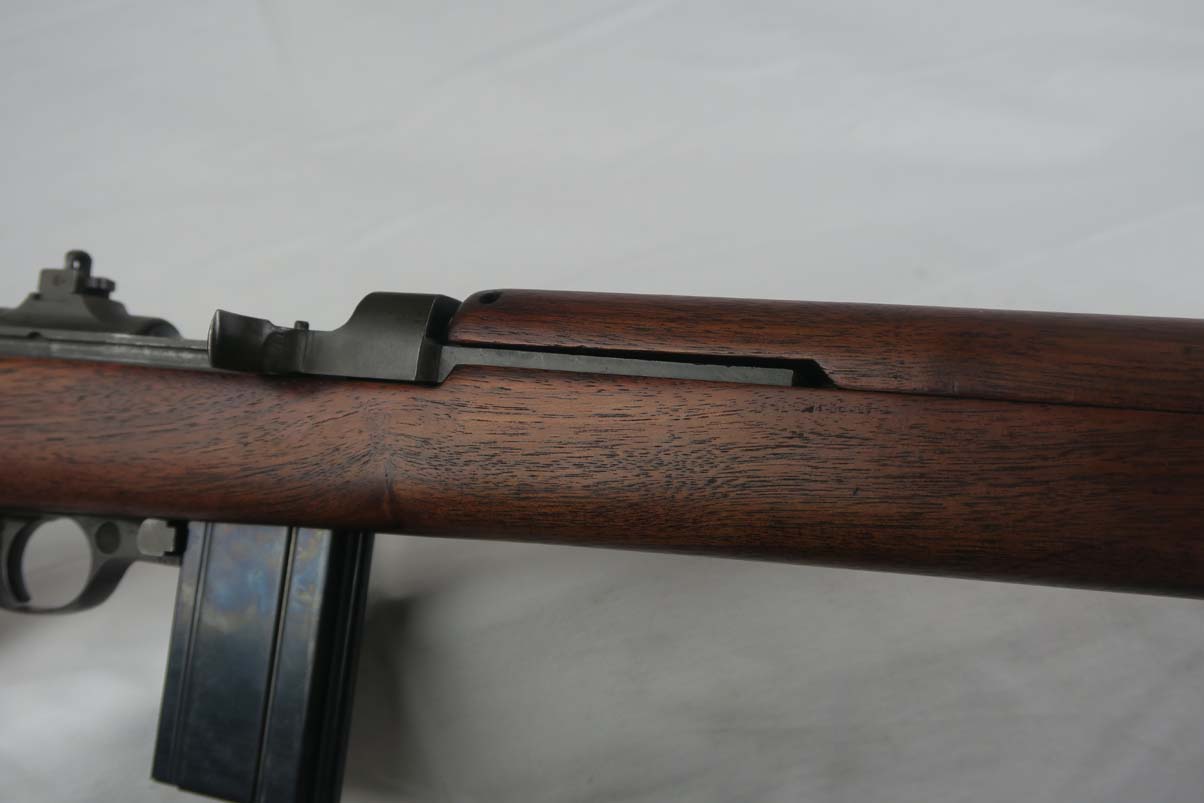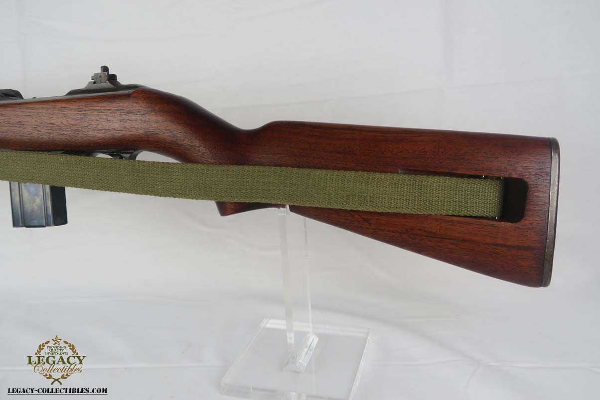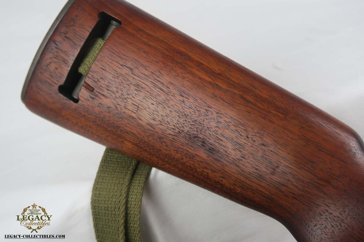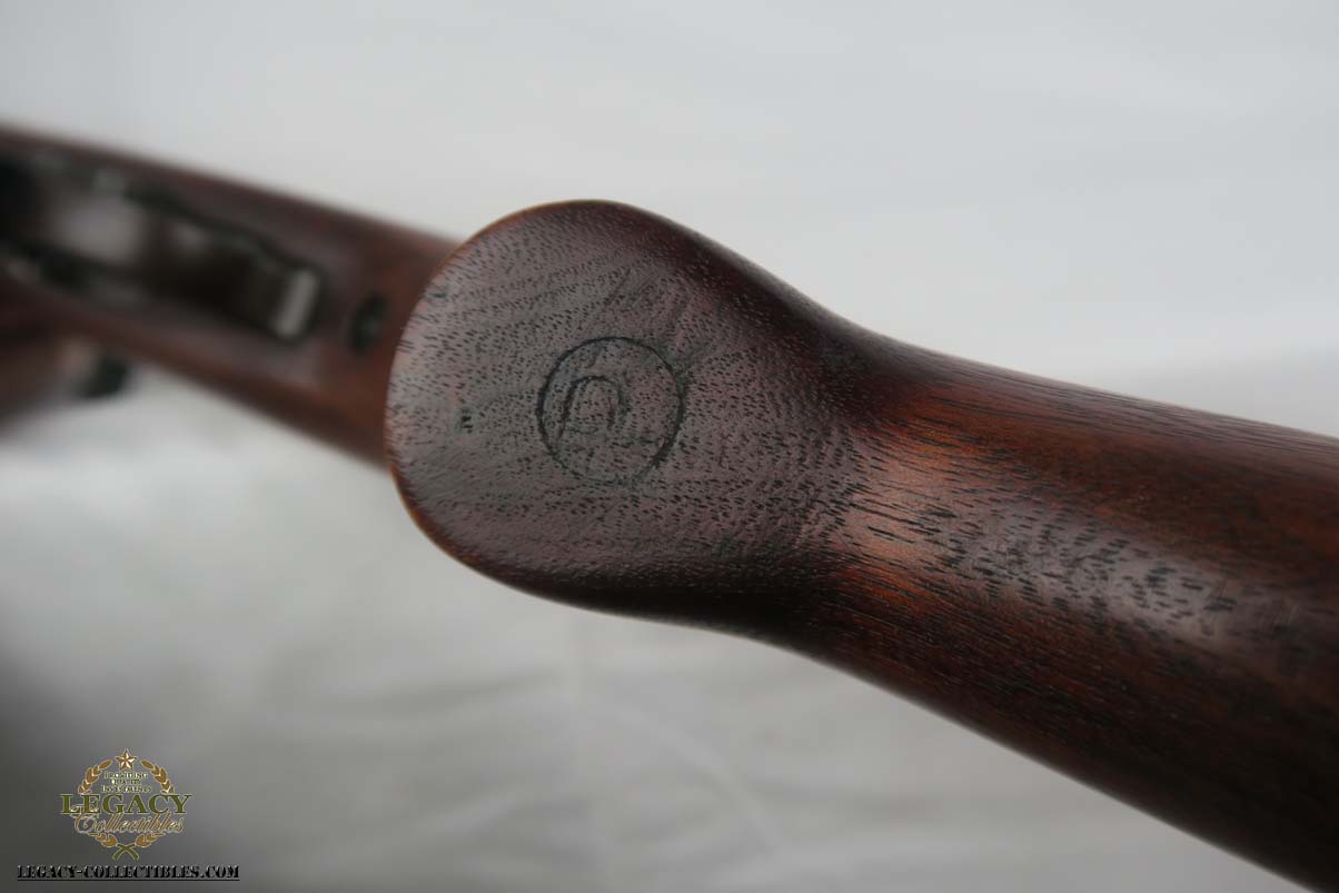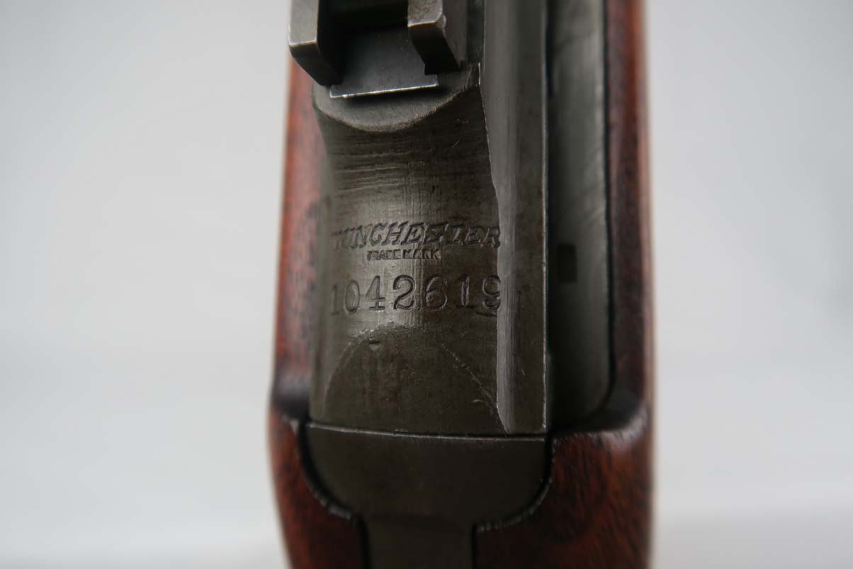 4/25/17 – This is an early Winchester Carbine. Serial is in the 1,042,xxx range, dates it to somewhere in the middle of 1942 (Winchester started producing M1 Carbines with a very small batch in late 1941). All original configuration and finish in near MINT condition. W marked barrel. The stock is an early high wood, with an I cut sling notch. Unfortunately there is a minor indentation on the right hand of the stock where I assume someone removed the cartouche. The large P under the stock grips is still present. All correct WW2 parts including the magazine and sling. The magazine is BW marked. It has an excellent shiny bore. S marked rear site.