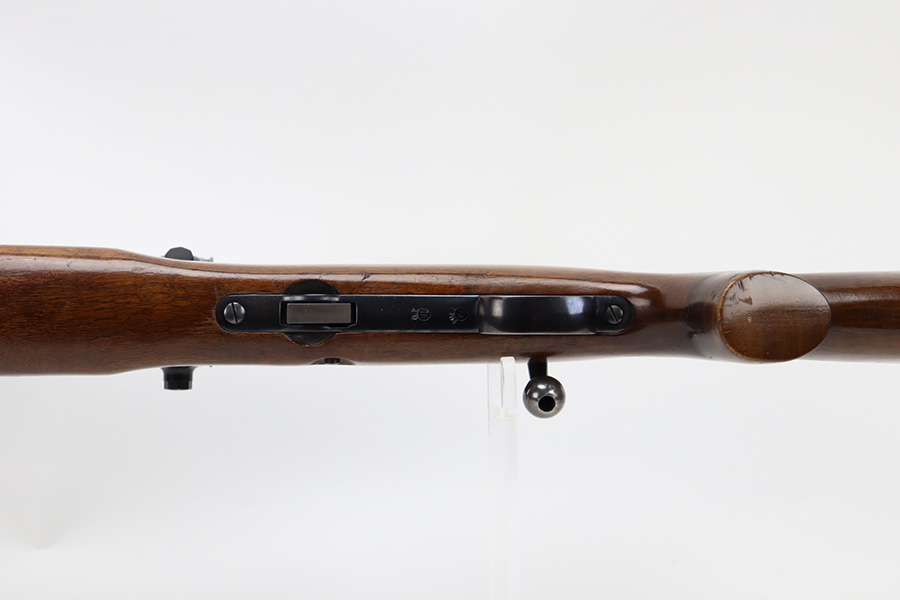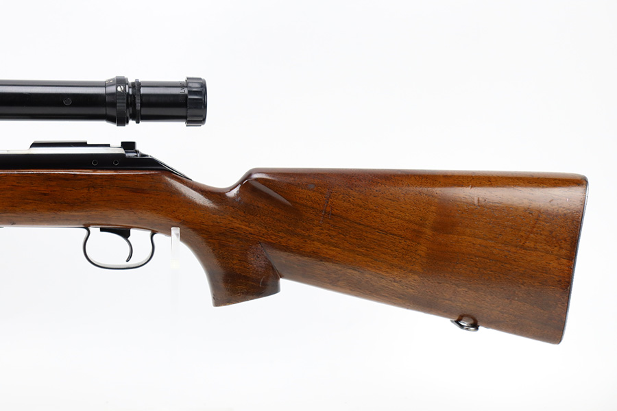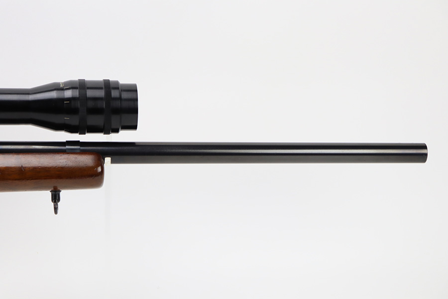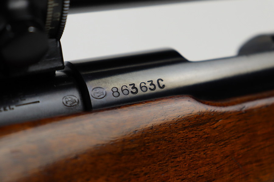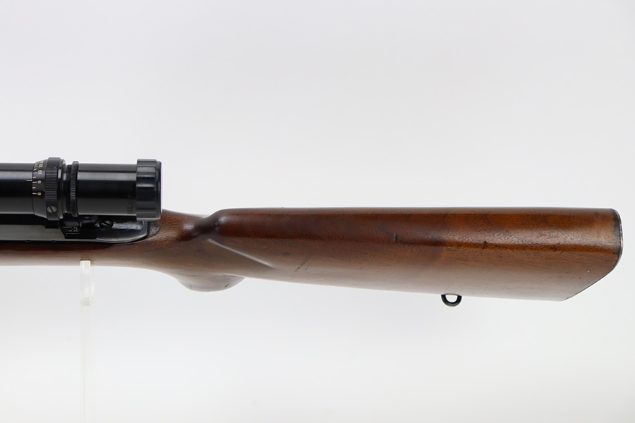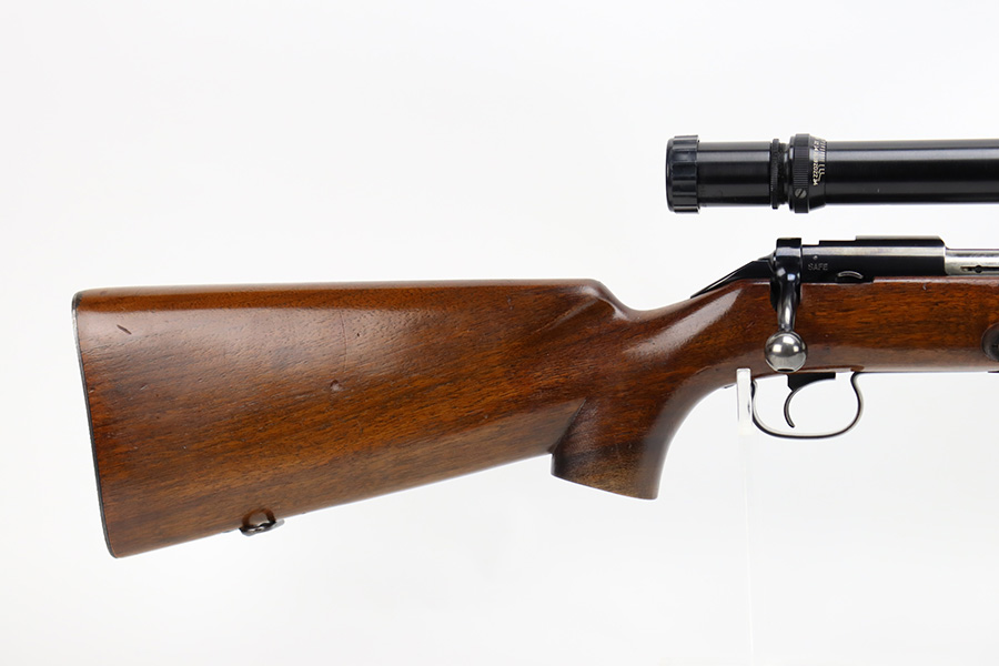1/3/24 – This is a minty Winchester Model 52 bolt action rifle, manufactured in 1956 and chambered in .22 LR. It comes equipped with an excellent Bausch & Lomb rifle scope – excellent optics. The metal parts have retained virtually all of their finish with just some very light freckling on the trigger group. Very nice wood stock with just very light handling marks throughout. Mint bore.