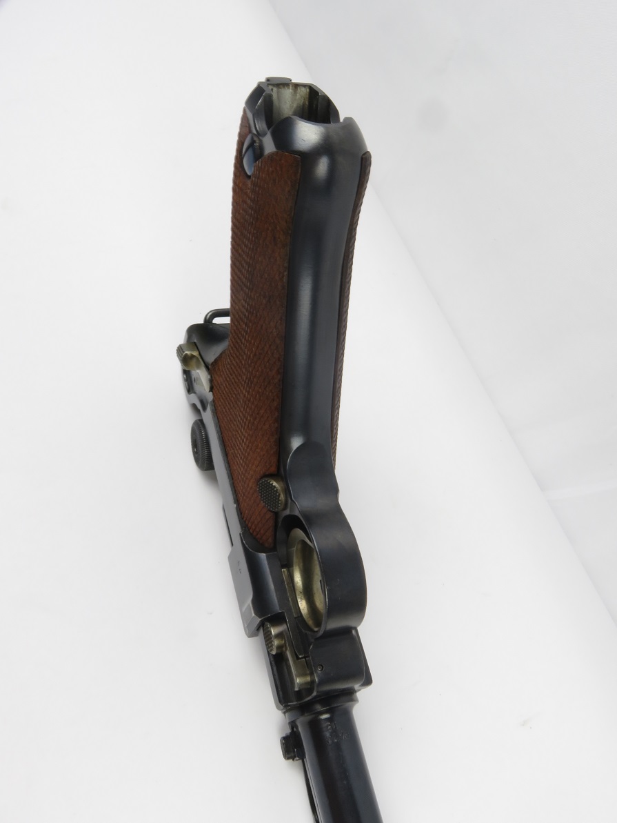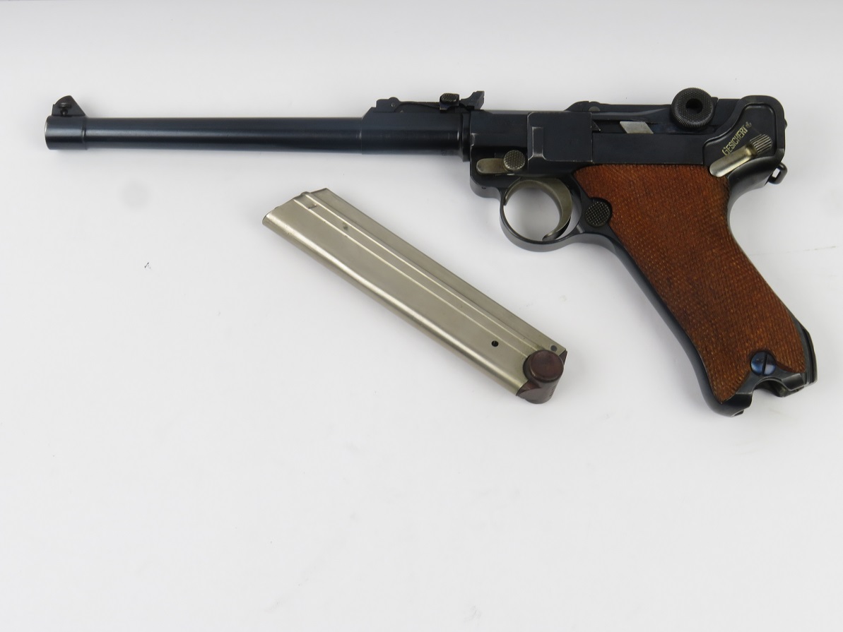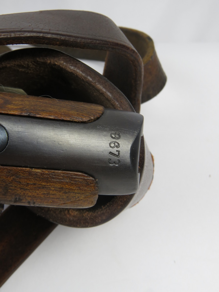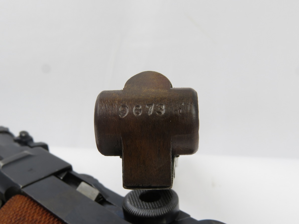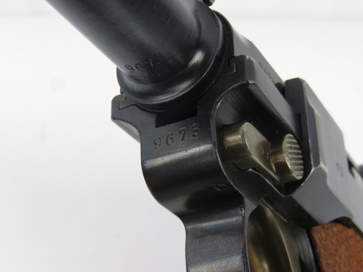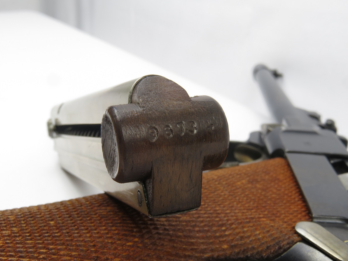 10/16/17 – This is one of the nicest Artillery lugers we have ever offered. The original finish is about 99% overall. The gun is so nice that we first questioned whether this had been restored, but a bright light will reveal some brown patina under the finish. The bore is also minty  which is a sign of original finish/condition of gun overall.  Grips are numbered to the gun and minty as well. Comes with an imperial tool, correct cleaning rod, and 1915 dated holster also all minty condition. The magazine is matching numbered to the gun, as is the stock.  So all numbers and parts are original and matching to this gun. Only two “issues” to point out. The closure strap on the cup is partially ripped and then glued so you definitely don’t want to pull on that. Also the stock does not have an imperial proof on it. So either it was skipped or the matching hardware on the stock was swapped.  (if you have an Imperial proofed stock you could swap it back)  Either way this issue creates a bit of a distraction. So while this Rig is easily worth 7500, we are listing at a significant discount. Priced to sell!