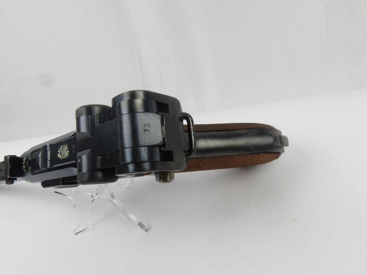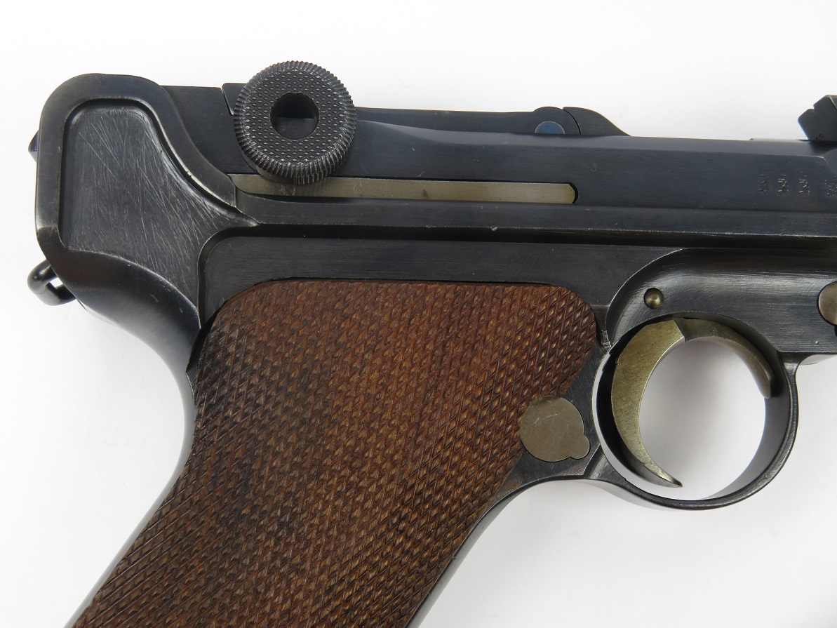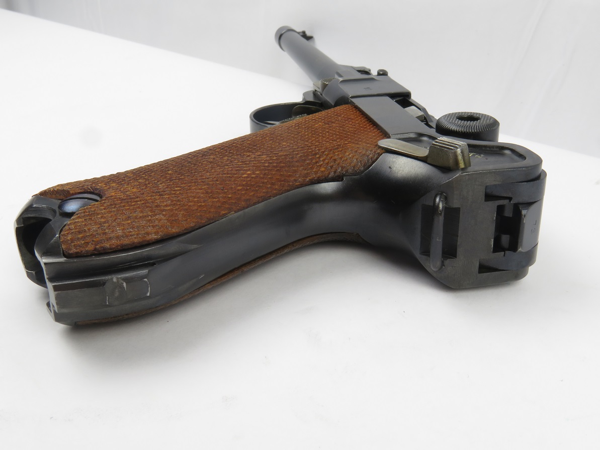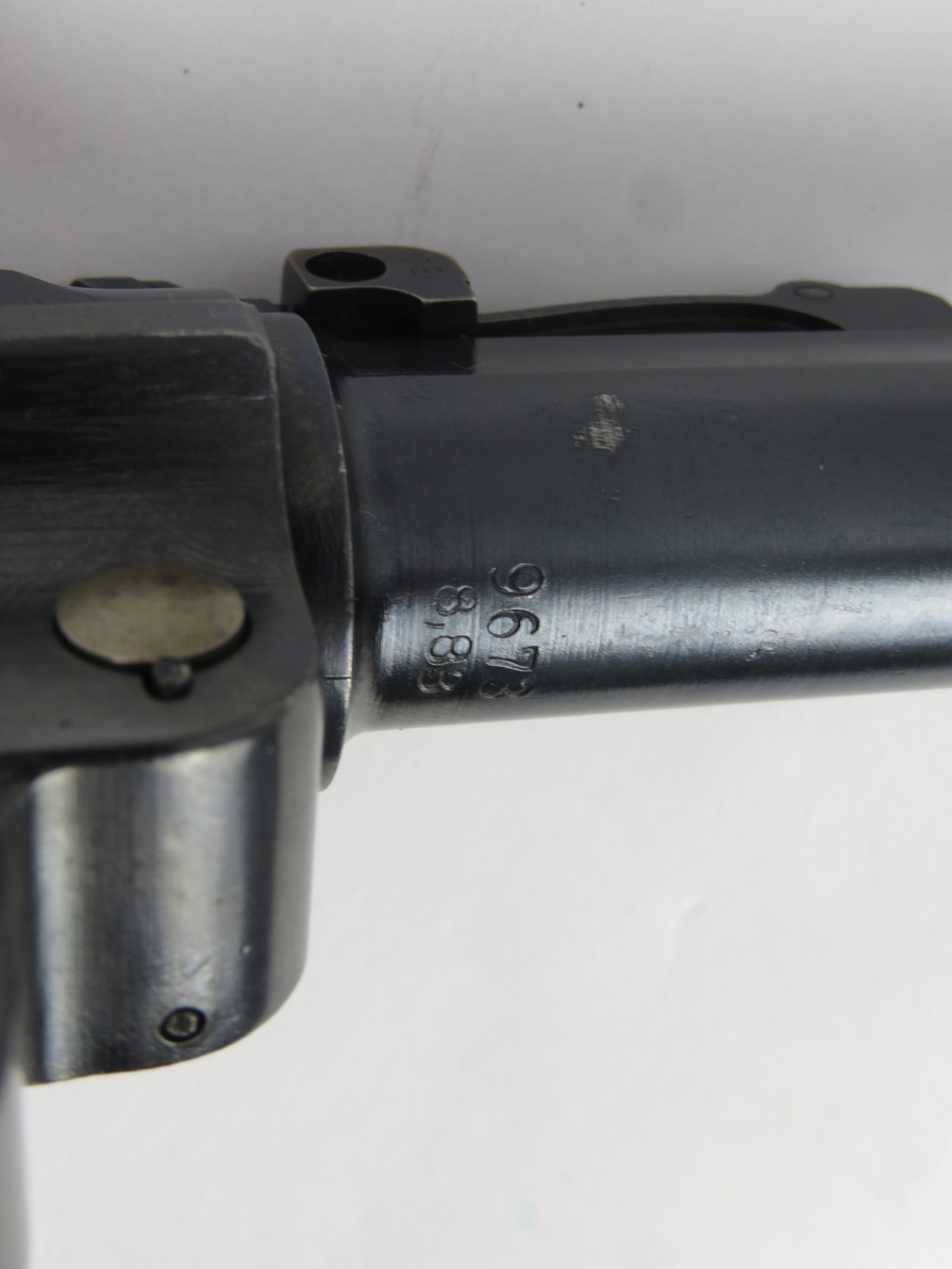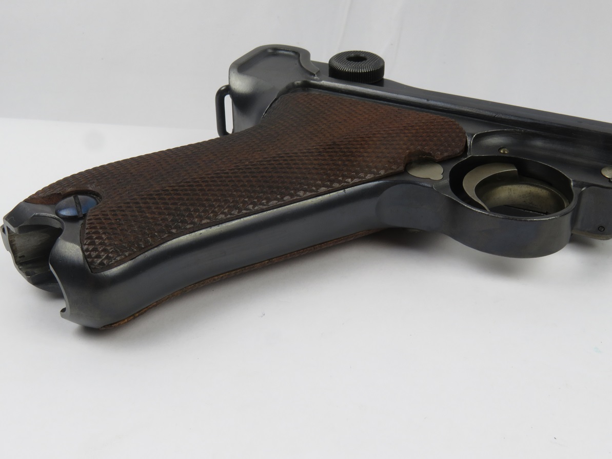 10/16/17 – This is one of the nicest Artillery lugers we have ever offered. The original finish is about 99% overall. The gun is so nice that we first questioned whether this had been restored, but a bright light will reveal some brown patina under the finish. The bore is also minty  which is a sign of original finish/condition of gun overall.  Grips are numbered to the gun and minty as well. Comes with an imperial tool, correct cleaning rod, and 1915 dated holster also all minty condition. The magazine is matching numbered to the gun, as is the stock.  So all numbers and parts are original and matching to this gun. Only two “issues” to point out. The closure strap on the cup is partially ripped and then glued so you definitely don’t want to pull on that. Also the stock does not have an imperial proof on it. So either it was skipped or the matching hardware on the stock was swapped.  (if you have an Imperial proofed stock you could swap it back)  Either way this issue creates a bit of a distraction. So while this Rig is easily worth 7500, we are listing at a significant discount. Priced to sell!