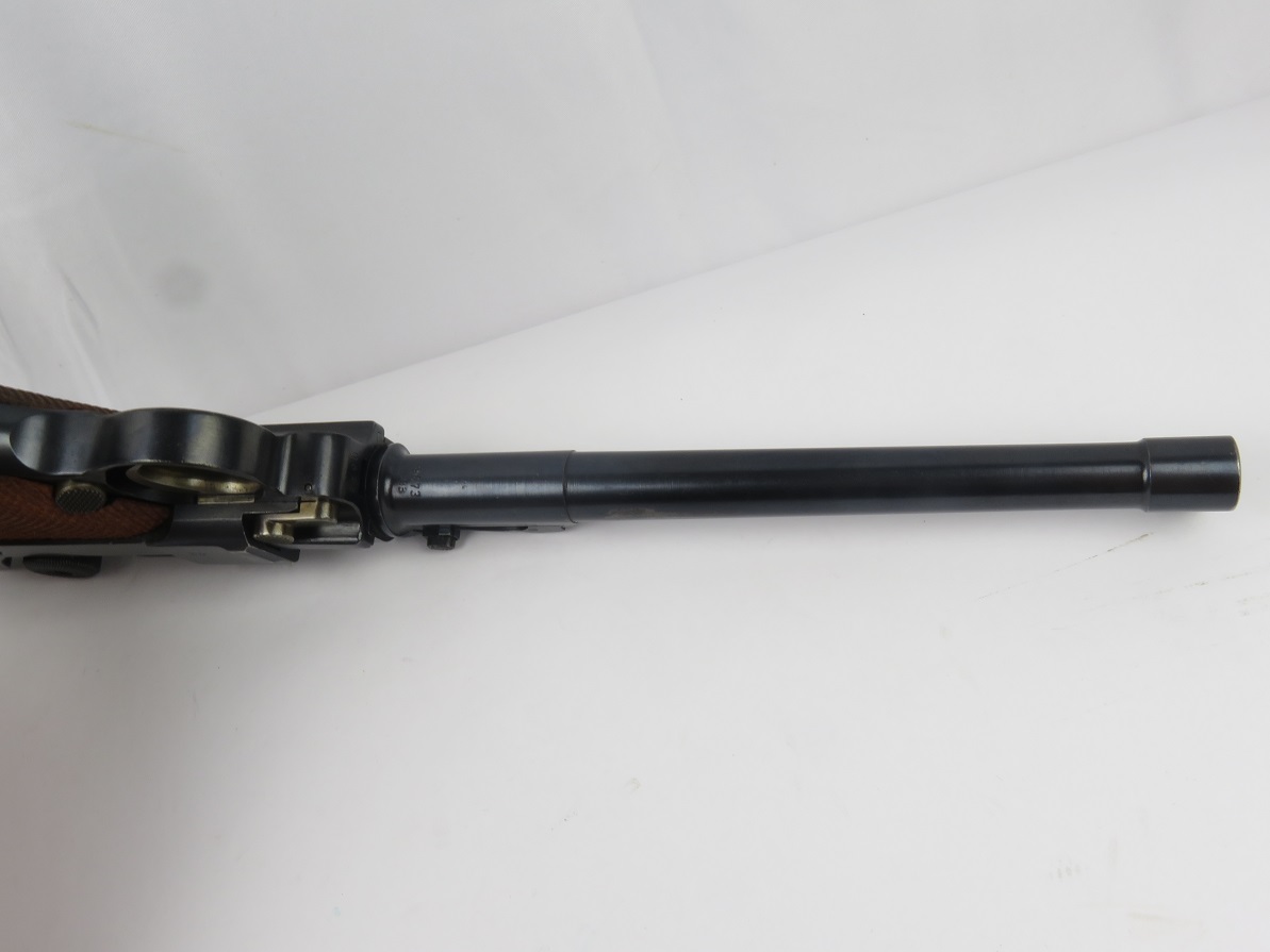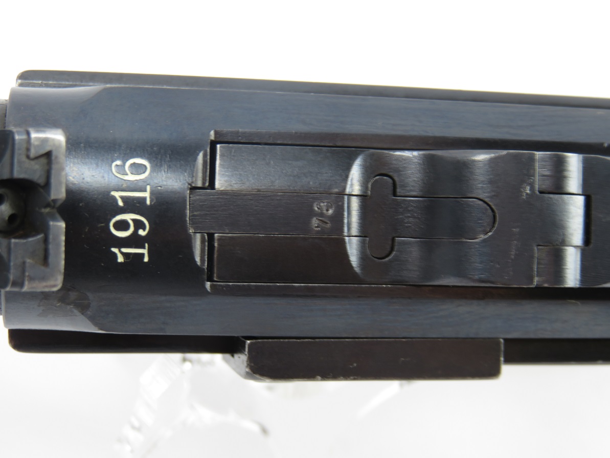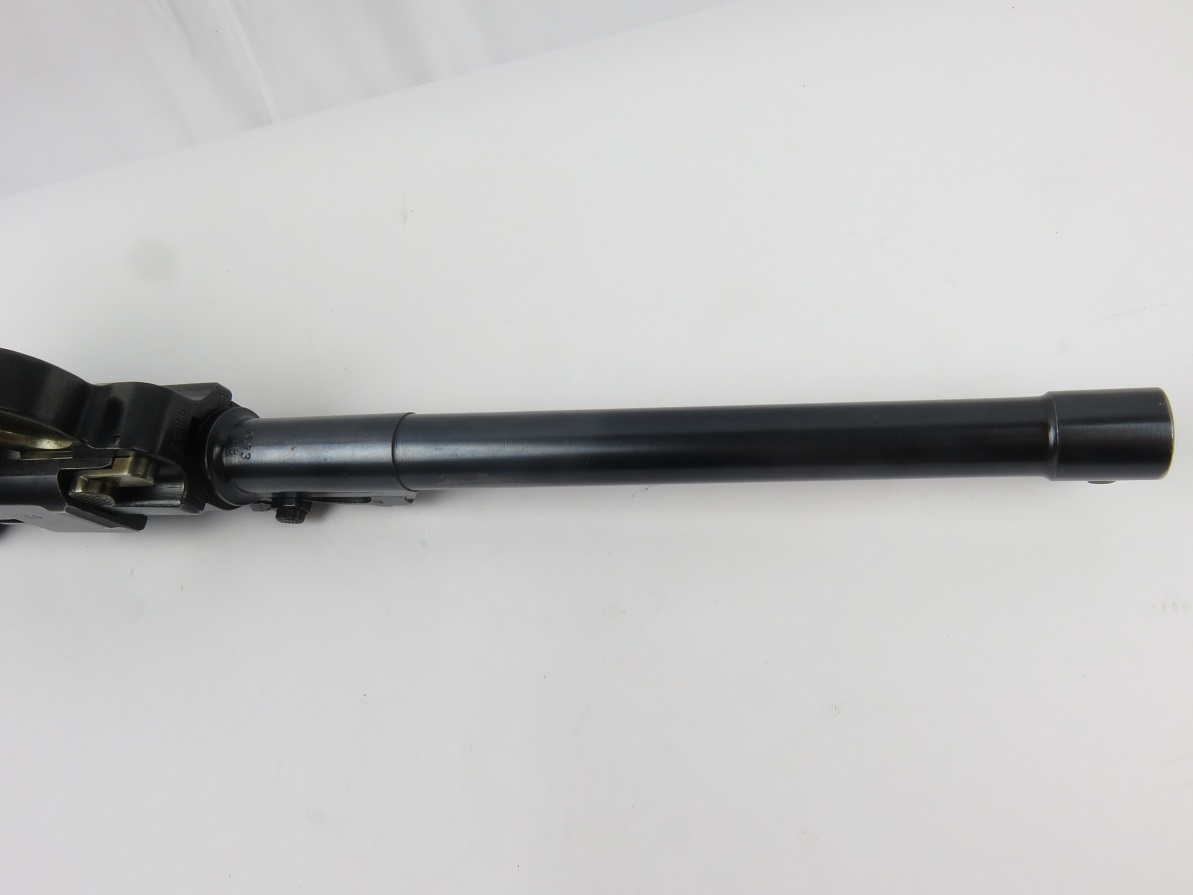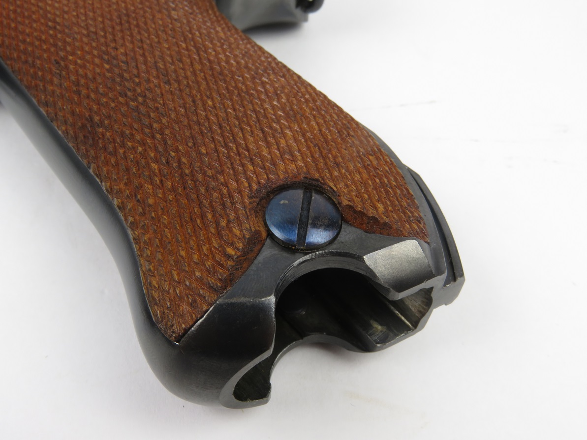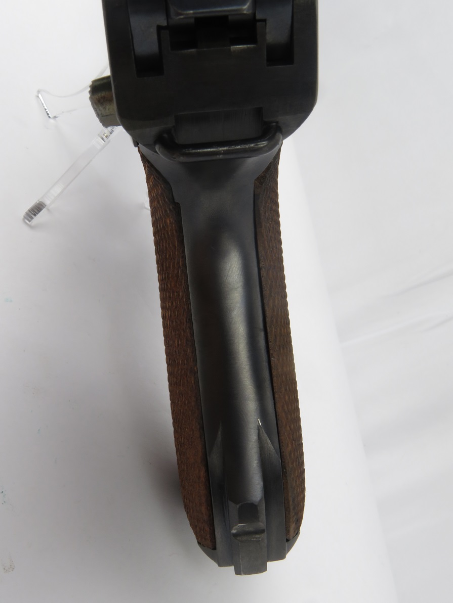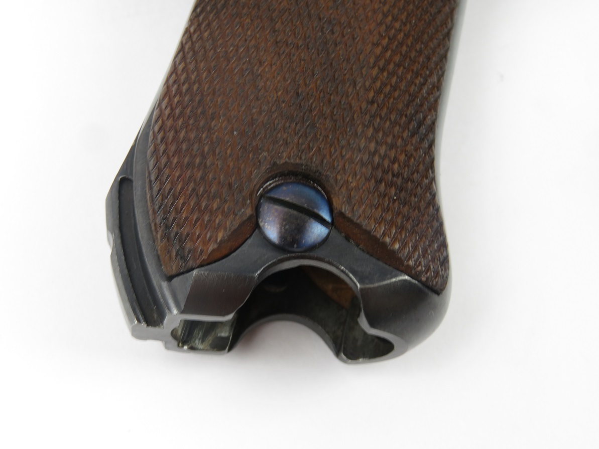 10/16/17 – This is one of the nicest Artillery lugers we have ever offered. The original finish is about 99% overall. The gun is so nice that we first questioned whether this had been restored, but a bright light will reveal some brown patina under the finish. The bore is also minty  which is a sign of original finish/condition of gun overall.  Grips are numbered to the gun and minty as well. Comes with an imperial tool, correct cleaning rod, and 1915 dated holster also all minty condition. The magazine is matching numbered to the gun, as is the stock.  So all numbers and parts are original and matching to this gun. Only two “issues” to point out. The closure strap on the cup is partially ripped and then glued so you definitely don’t want to pull on that. Also the stock does not have an imperial proof on it. So either it was skipped or the matching hardware on the stock was swapped.  (if you have an Imperial proofed stock you could swap it back)  Either way this issue creates a bit of a distraction. So while this Rig is easily worth 7500, we are listing at a significant discount. Priced to sell!