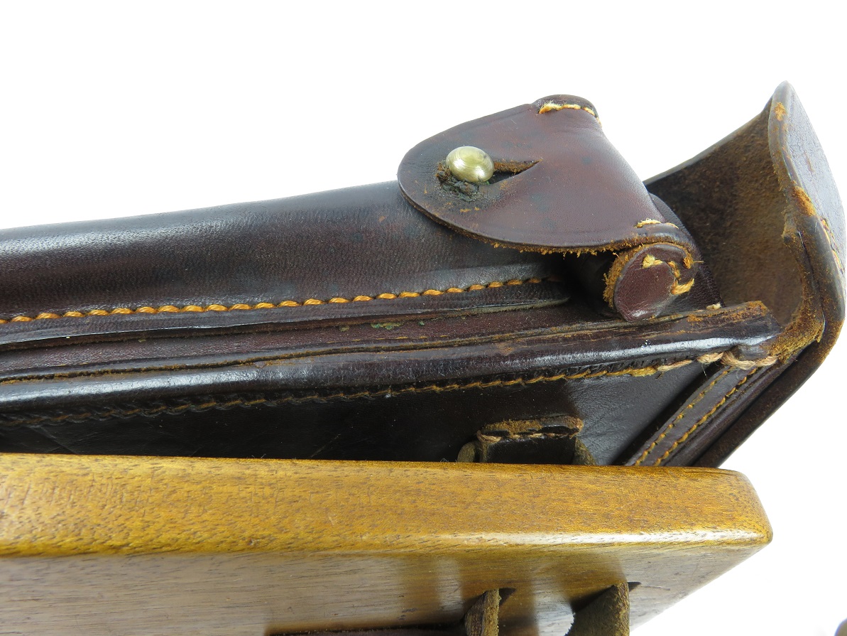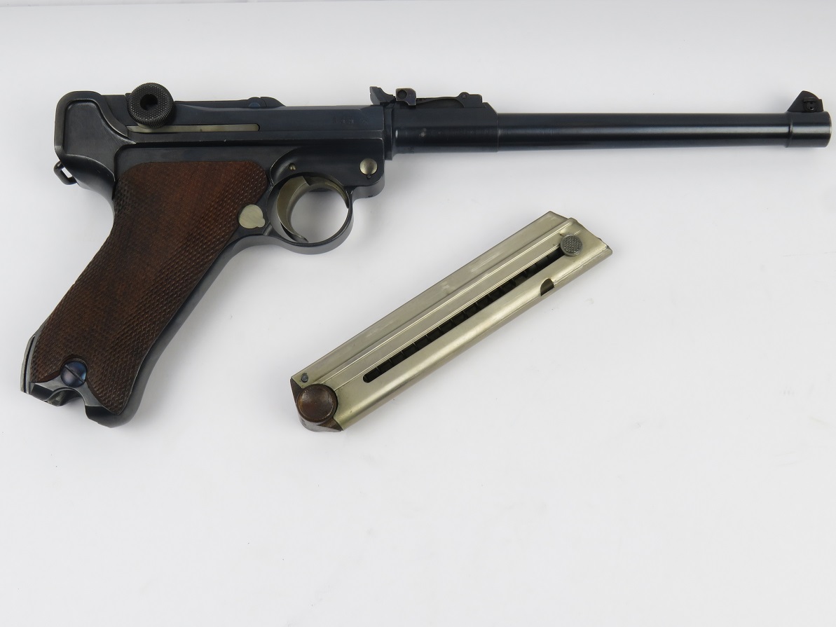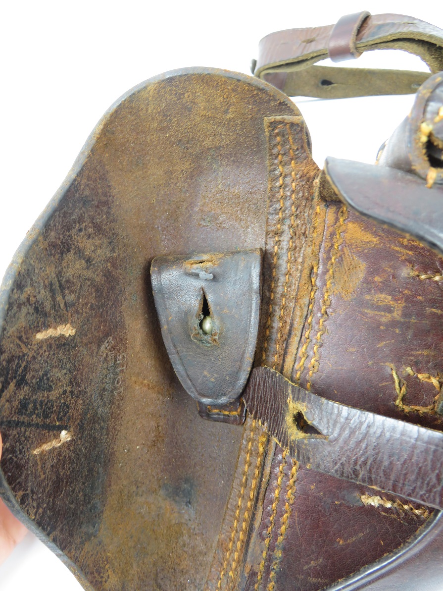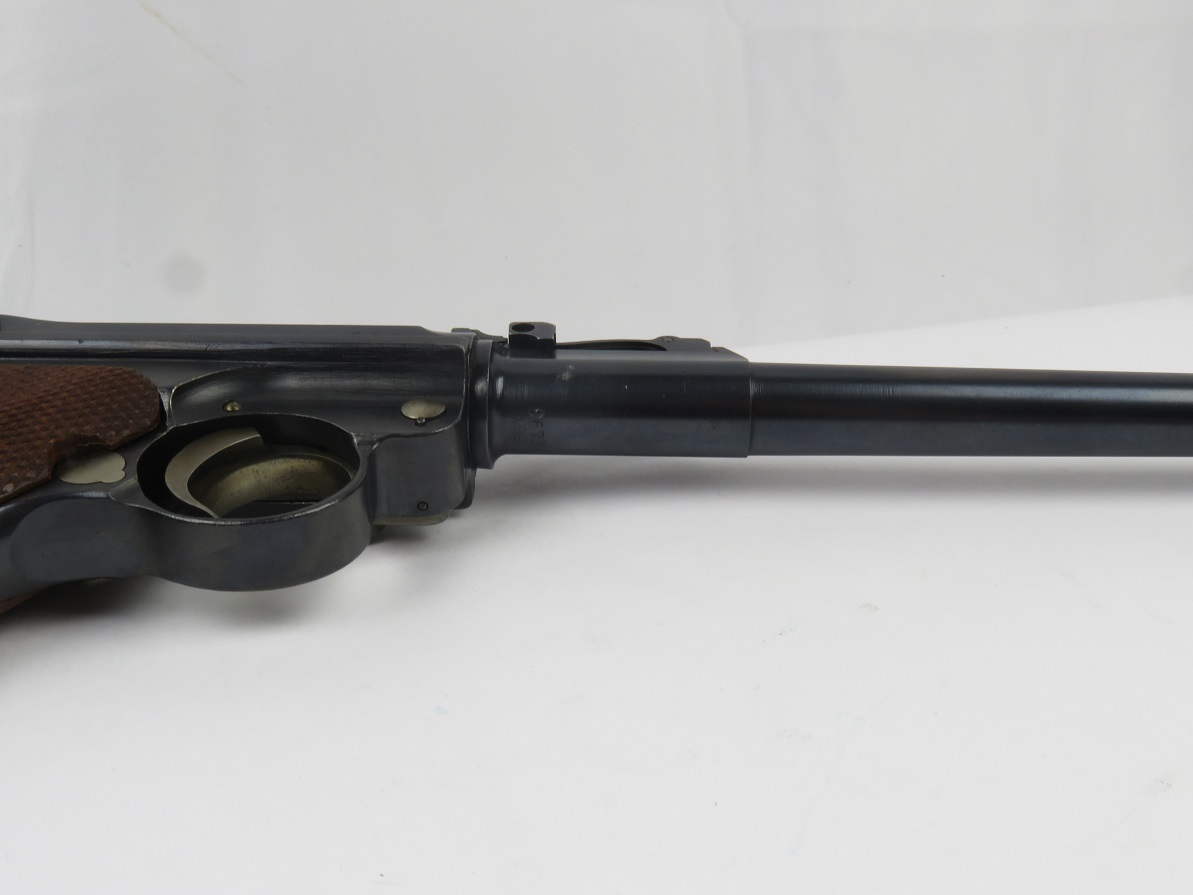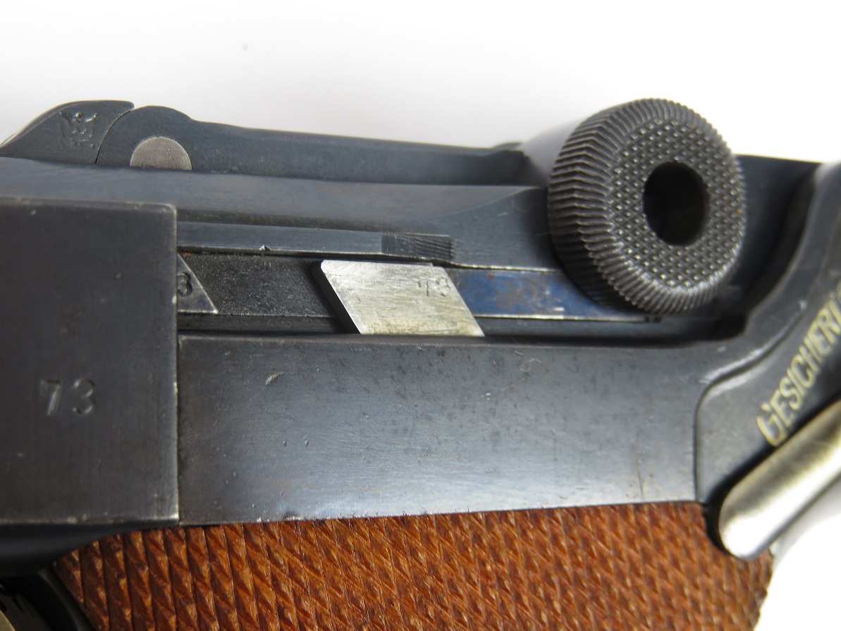 10/16/17 – This is one of the nicest Artillery lugers we have ever offered. The original finish is about 99% overall. The gun is so nice that we first questioned whether this had been restored, but a bright light will reveal some brown patina under the finish. The bore is also minty  which is a sign of original finish/condition of gun overall.  Grips are numbered to the gun and minty as well. Comes with an imperial tool, correct cleaning rod, and 1915 dated holster also all minty condition. The magazine is matching numbered to the gun, as is the stock.  So all numbers and parts are original and matching to this gun. Only two “issues” to point out. The closure strap on the cup is partially ripped and then glued so you definitely don’t want to pull on that. Also the stock does not have an imperial proof on it. So either it was skipped or the matching hardware on the stock was swapped.  (if you have an Imperial proofed stock you could swap it back)  Either way this issue creates a bit of a distraction. So while this Rig is easily worth 7500, we are listing at a significant discount. Priced to sell!