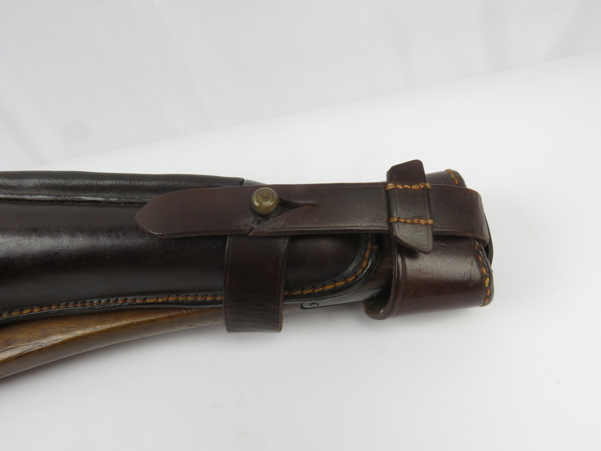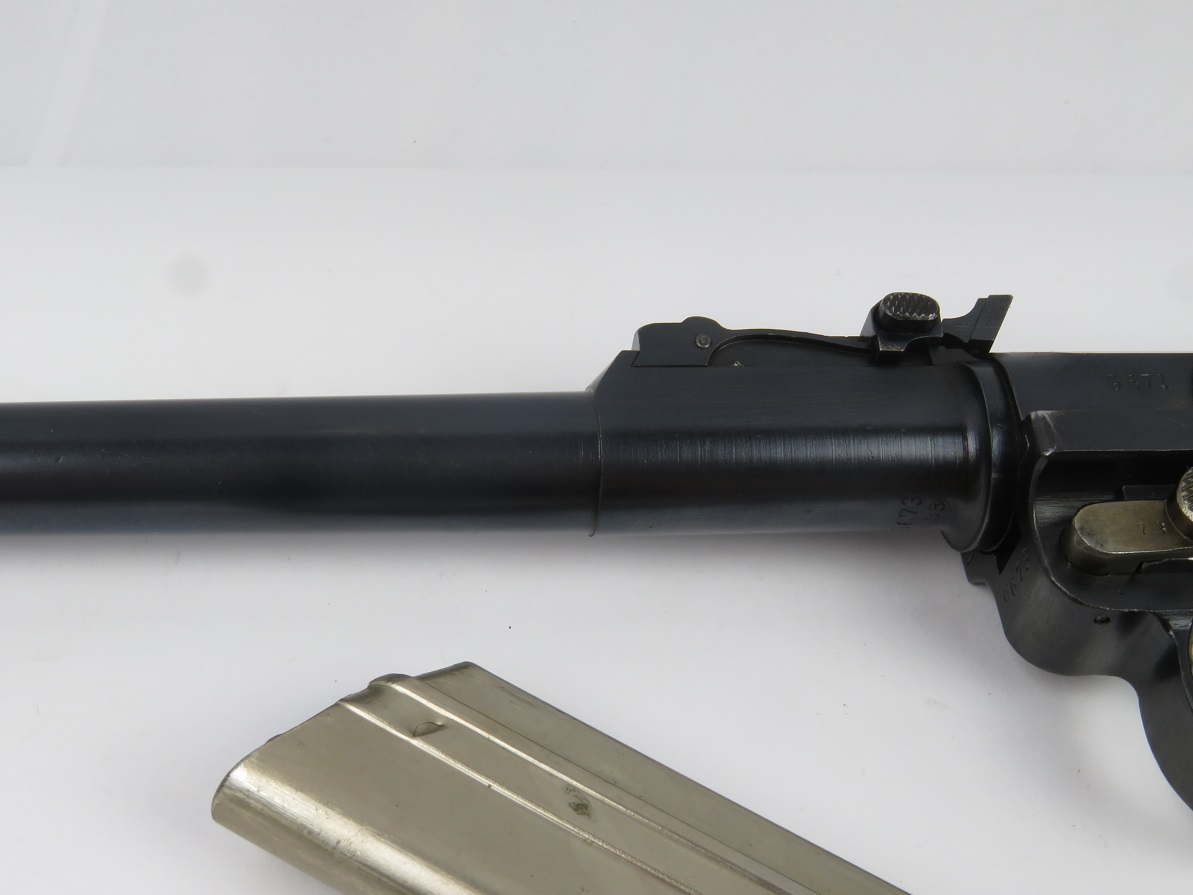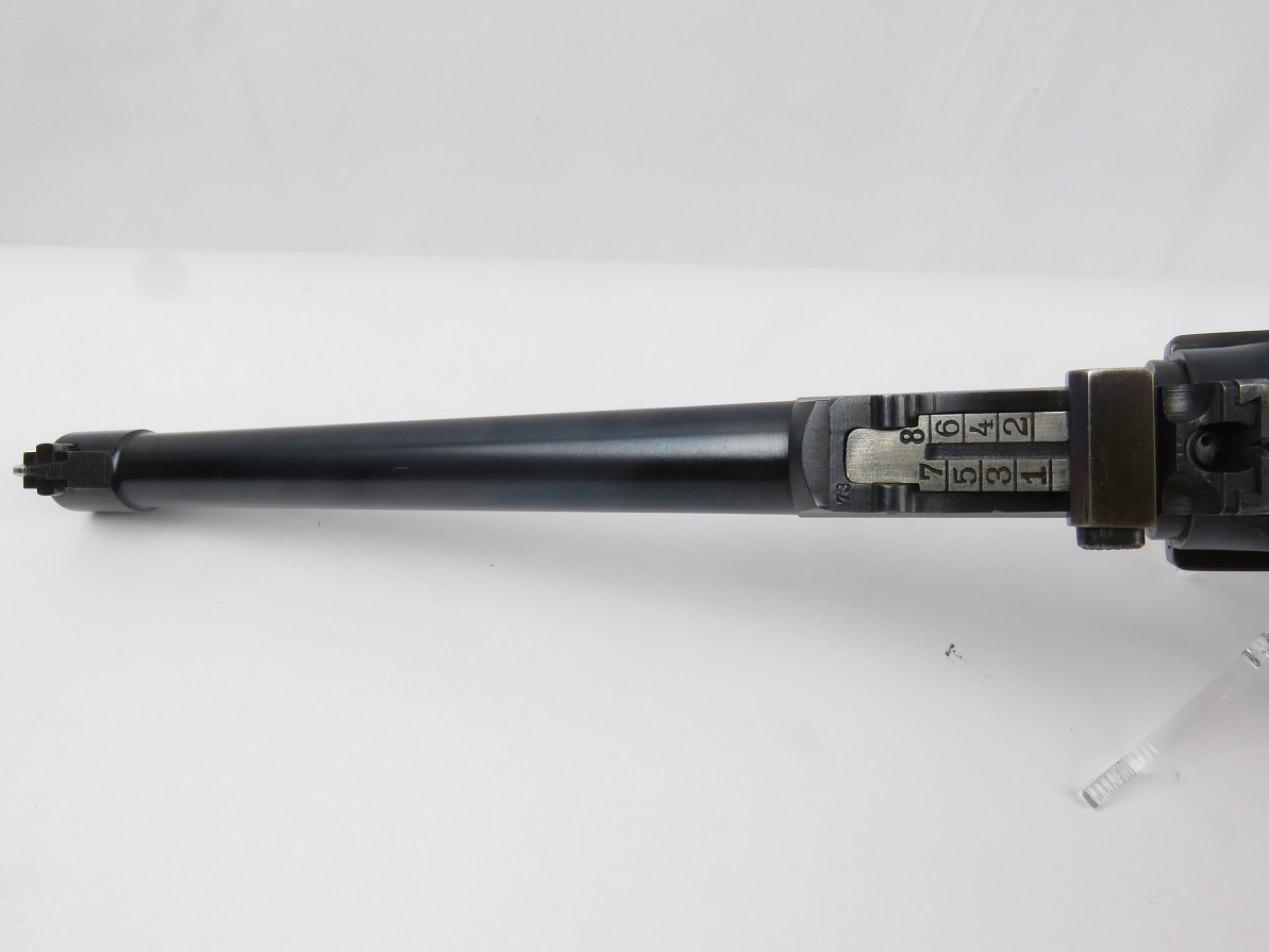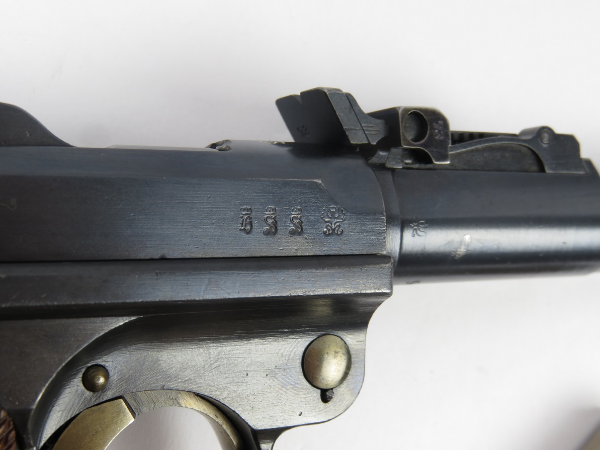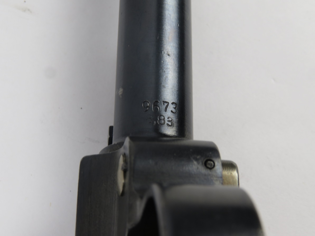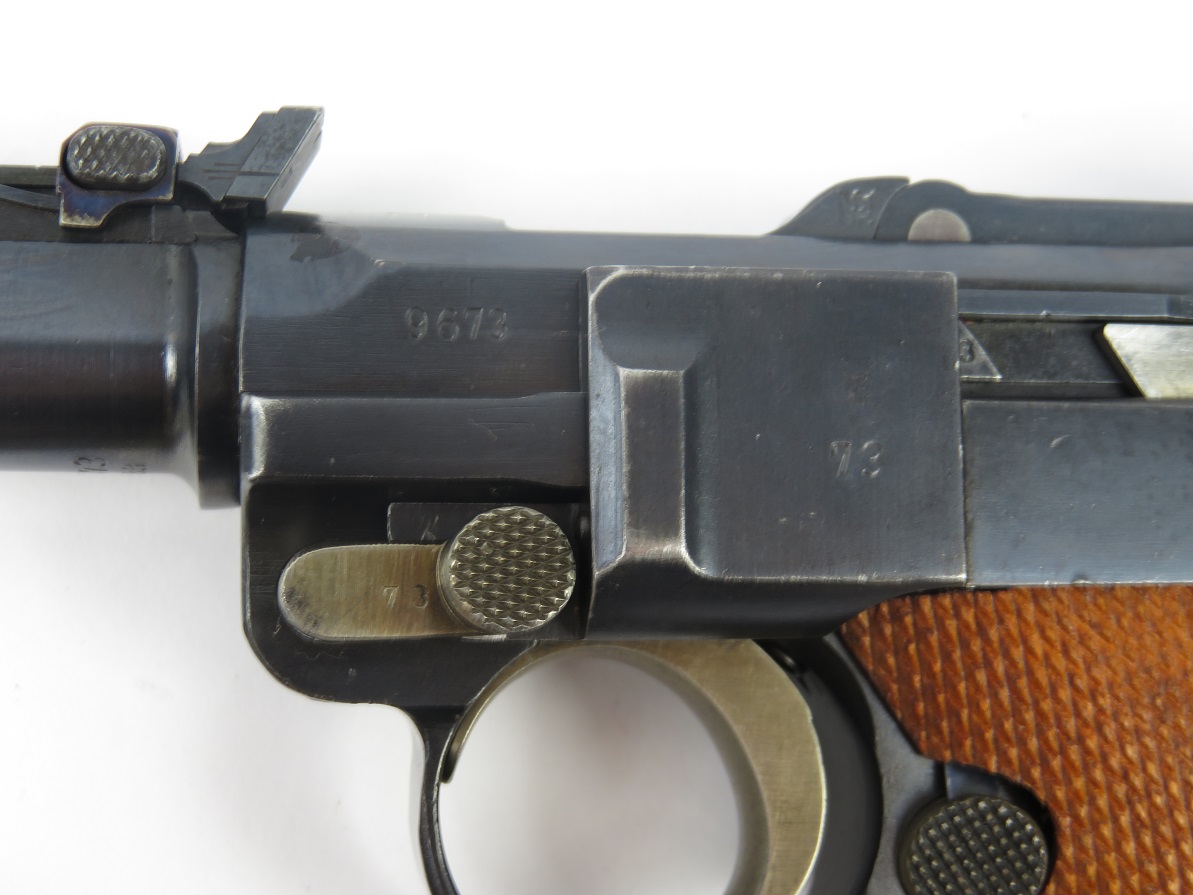 10/16/17 – This is one of the nicest Artillery lugers we have ever offered. The original finish is about 99% overall. The gun is so nice that we first questioned whether this had been restored, but a bright light will reveal some brown patina under the finish. The bore is also minty  which is a sign of original finish/condition of gun overall.  Grips are numbered to the gun and minty as well. Comes with an imperial tool, correct cleaning rod, and 1915 dated holster also all minty condition. The magazine is matching numbered to the gun, as is the stock.  So all numbers and parts are original and matching to this gun. Only two “issues” to point out. The closure strap on the cup is partially ripped and then glued so you definitely don’t want to pull on that. Also the stock does not have an imperial proof on it. So either it was skipped or the matching hardware on the stock was swapped.  (if you have an Imperial proofed stock you could swap it back)  Either way this issue creates a bit of a distraction. So while this Rig is easily worth 7500, we are listing at a significant discount. Priced to sell!