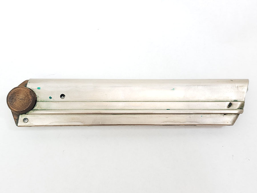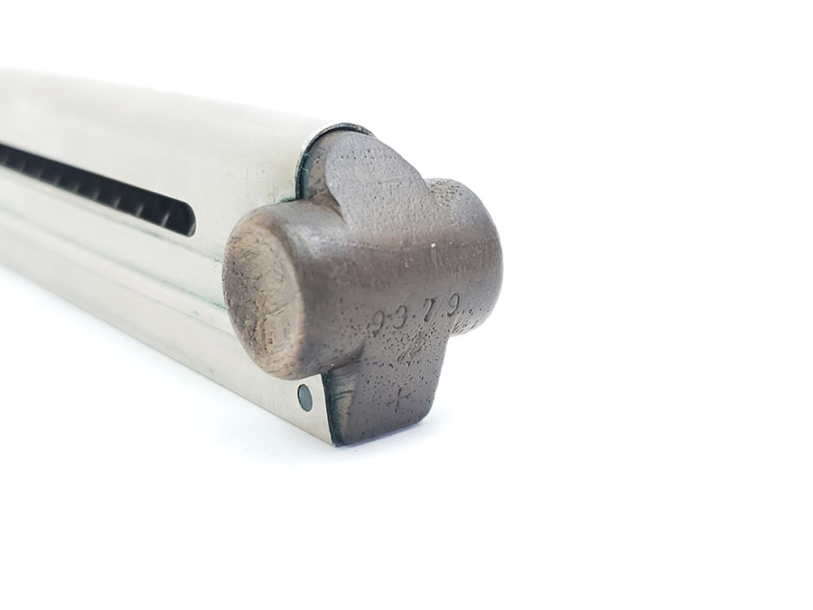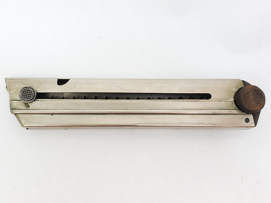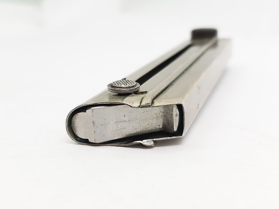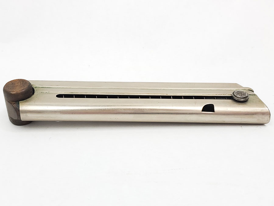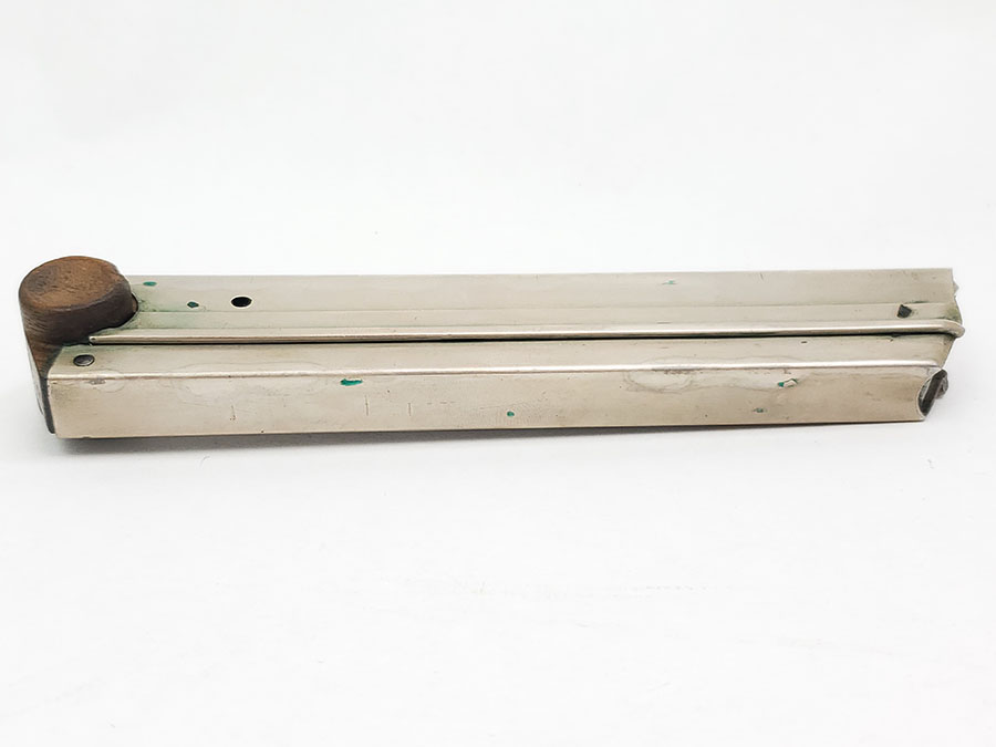 7/23/20 – This is a beautiful, nearly impossible to upgrade WW1 luger magazine. The magazine has minimal to no wear on the tube, a strong spring, and a clean wood base. The base is serial numbered 9379k with a “+” sign. No other markings.