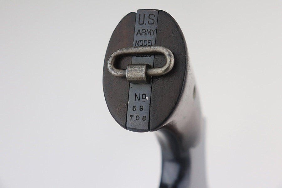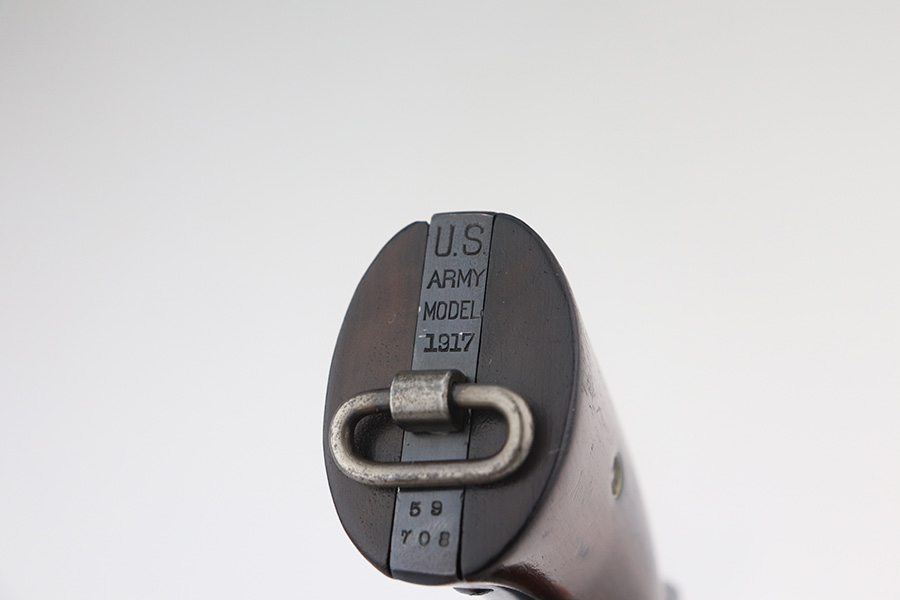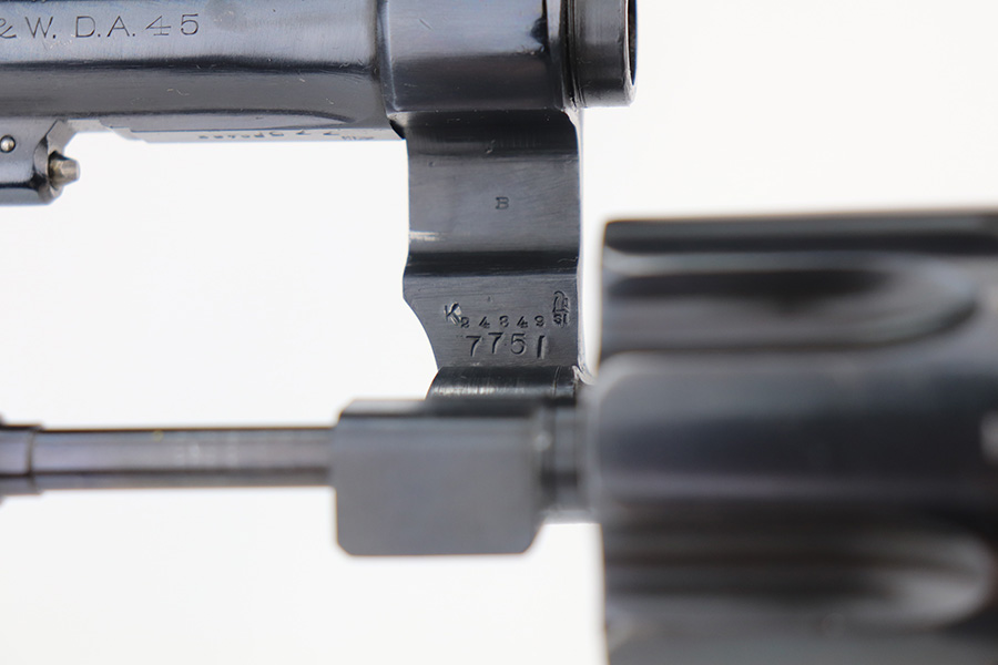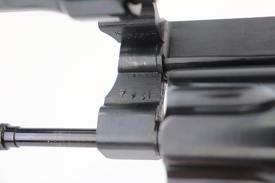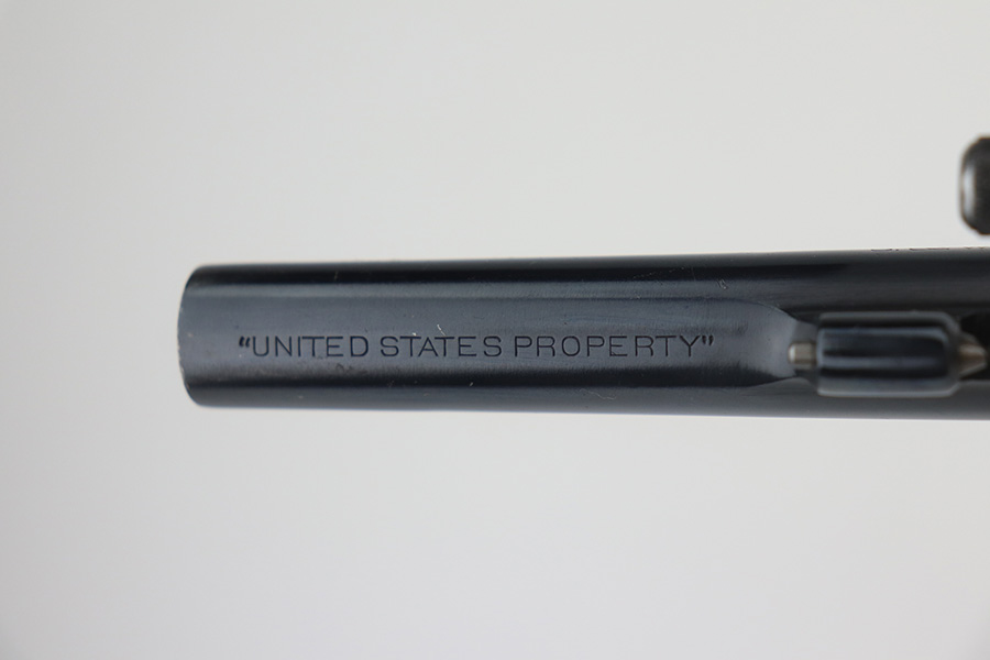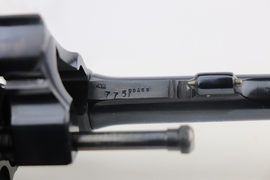 5/27/21 – This is a minty example of a Smith & Wesson Model 1917 revolver issued to the US military during WW1. The gun is matching, has the proper flaming bomb an eagle head proofs. “US Property” marking on the underside of the barrel. It has retained about 98% of its bluing. There is just a hint of wear around the muzzle and high edges of the cylinder. Roll mark on the cylinder. There are a few very light scratches here and there and minor swirly discoloration on the right side of the frame. The cylinder is tight and the action is smooth. Excellent wood grips. The bore is excellent – shiny with strong rifling.