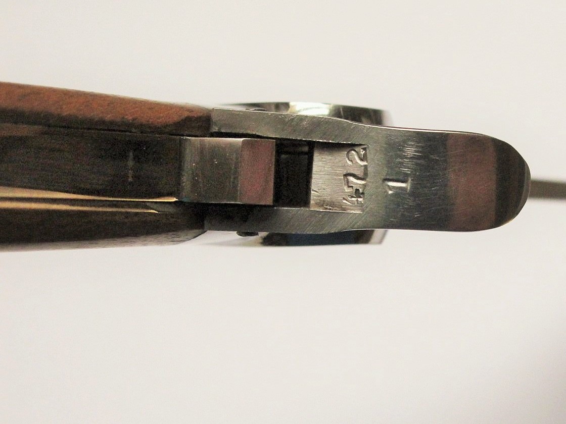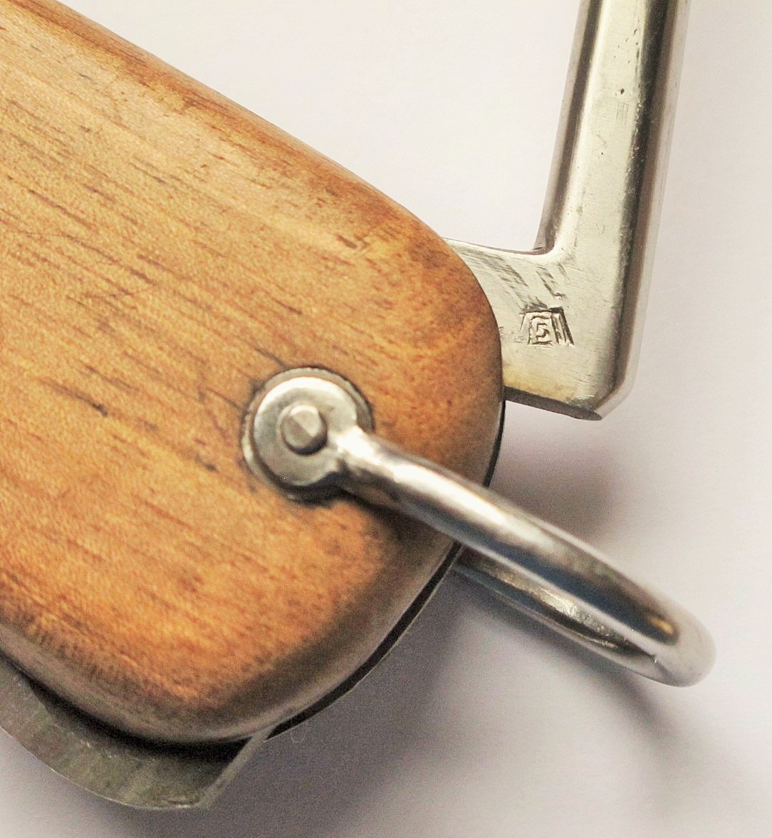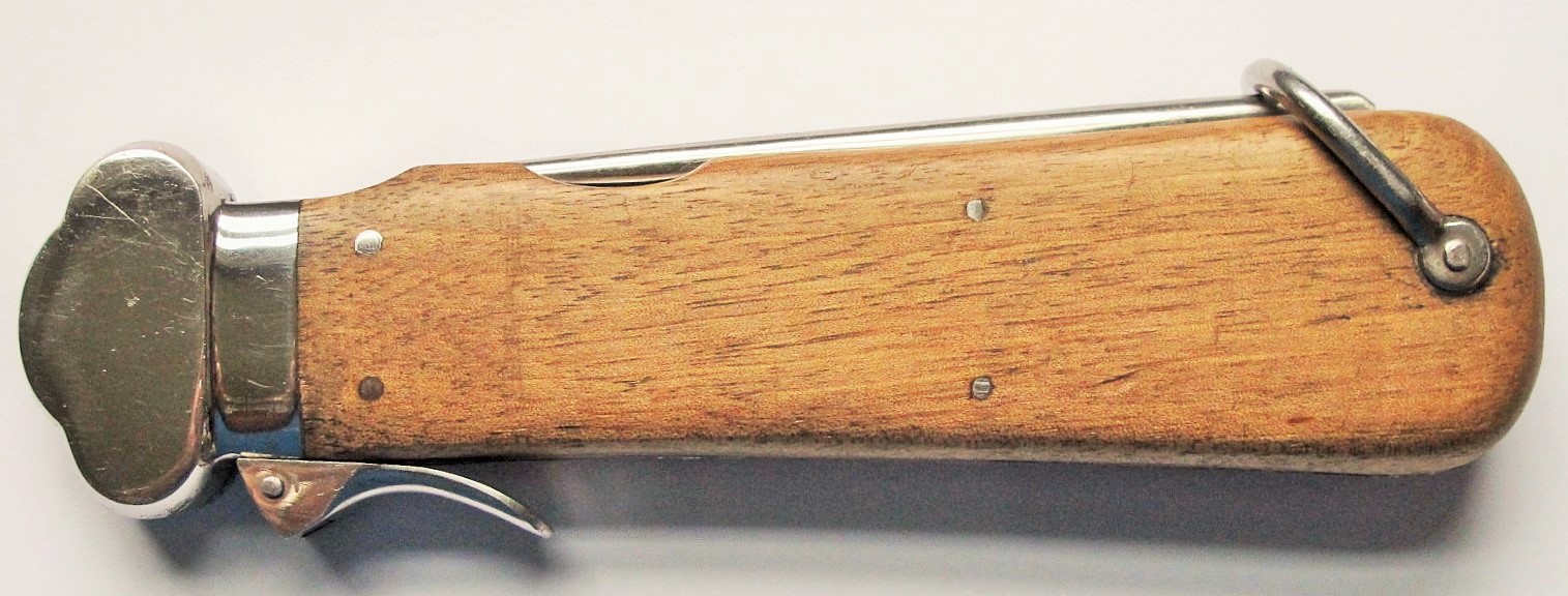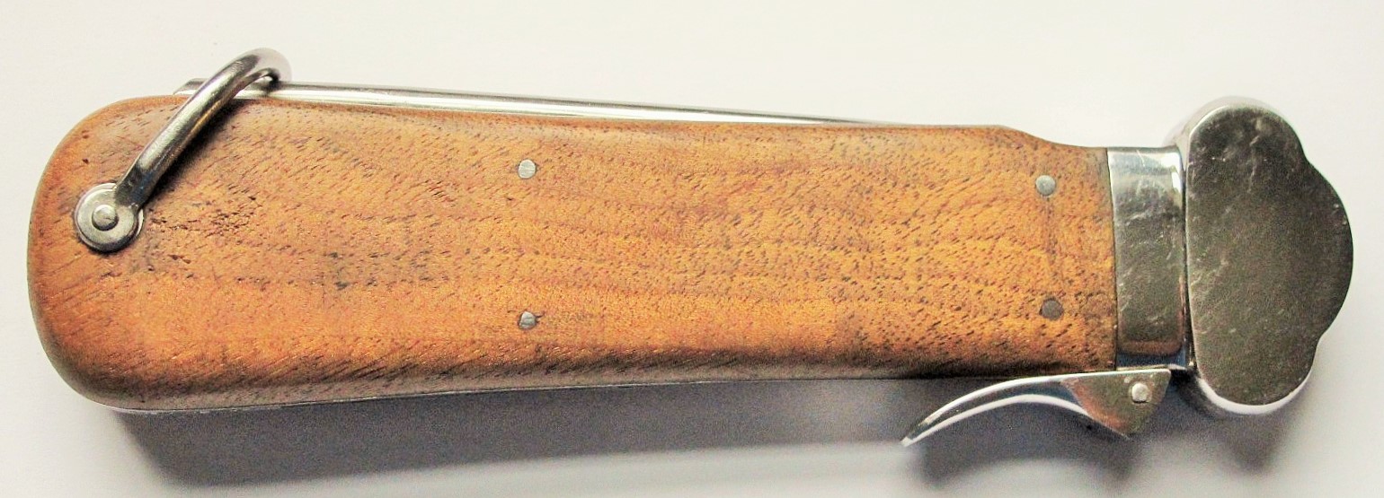 11/20/17 – This is an original WW2 era production gravity knife. These knives were used by Luftwaffe pilots and can open if the latch is opened and the knife is turned upside down. This allows for opening with one hand. This gravity knife is in minty condition with a beautiful, unsharpened blade and excellent wood handle. The maker stamp is on one side of the blade and crisp. There is also a drop-down “pick” piece that comes down the base end of the knife. Guaranteed original and authentic.