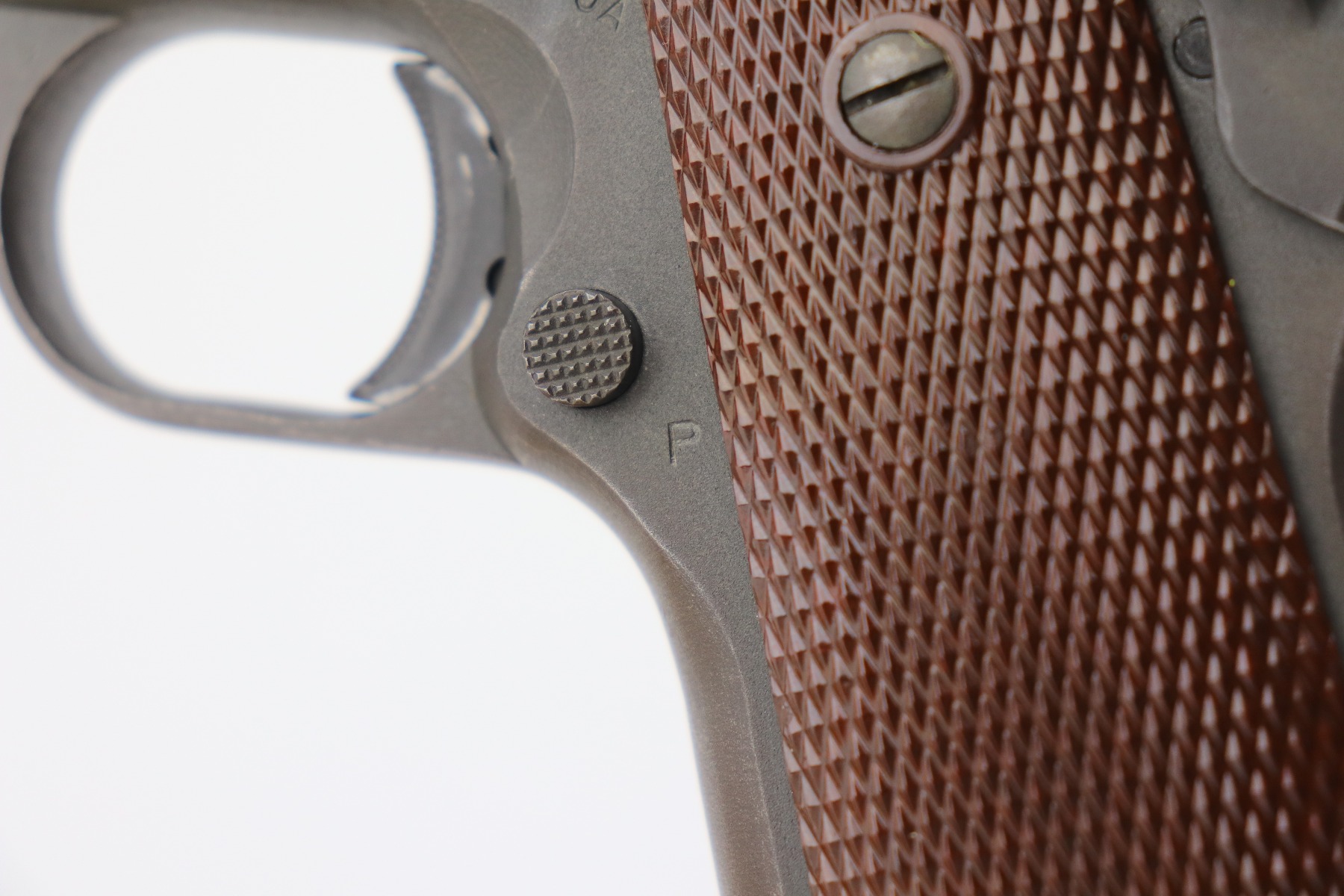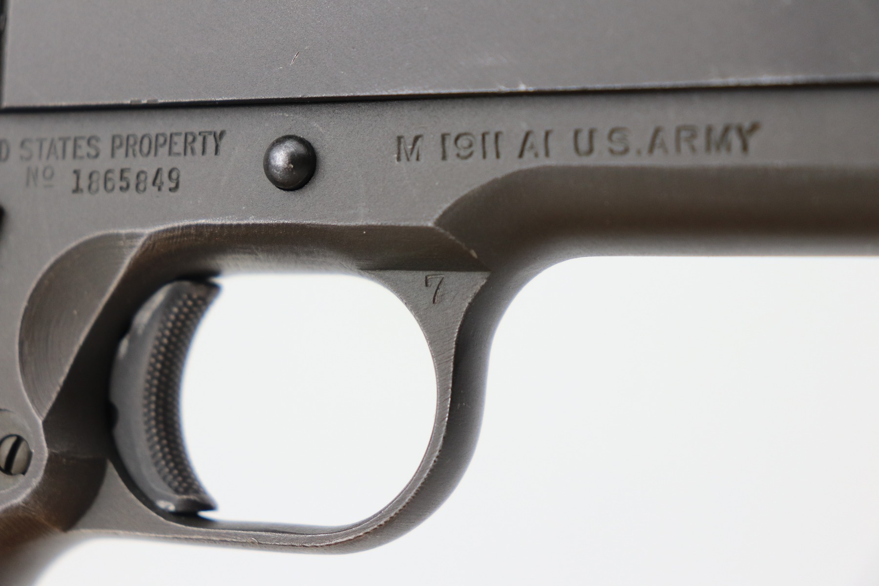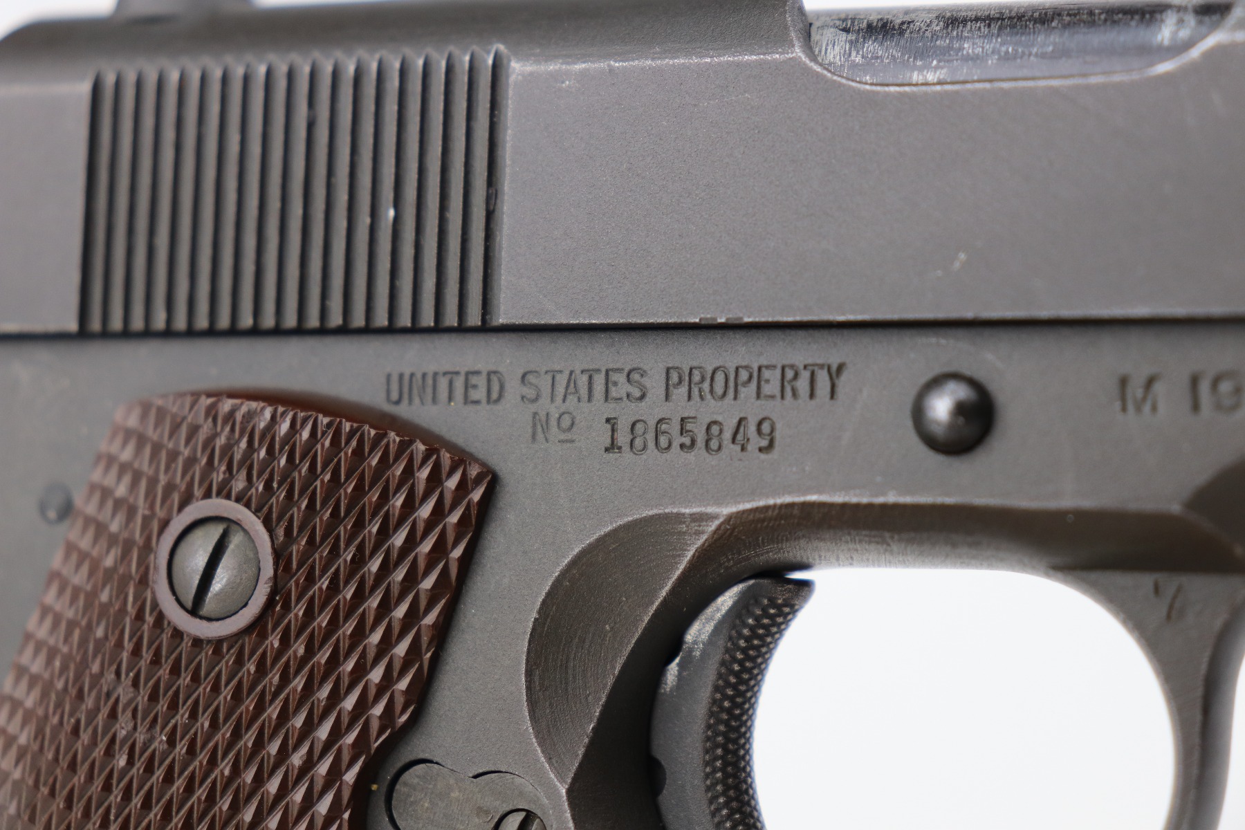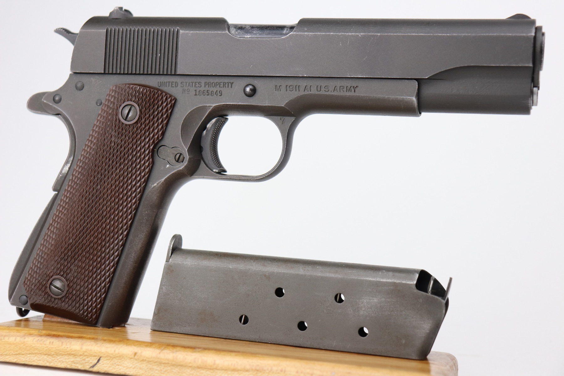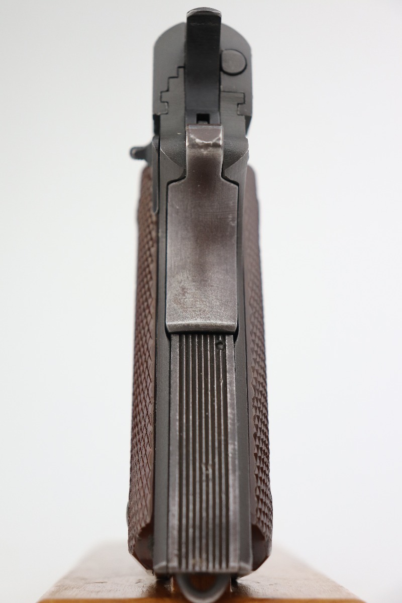 3/24/2 – This is a minty example of a Ithaca Model 1911A1 issued to the US military in 1945. It is “United States Property” marked and has the proper military cross canon cartouche. Flannery barrel. The gun is in minty condition, retaining about 97% of its original finish. There is minor thinning on the straps and a hint of wear on the high edges of the slide. Comes with excellent grips and a period-correct magazine. The bore is excellent – shiny with strong rifling.