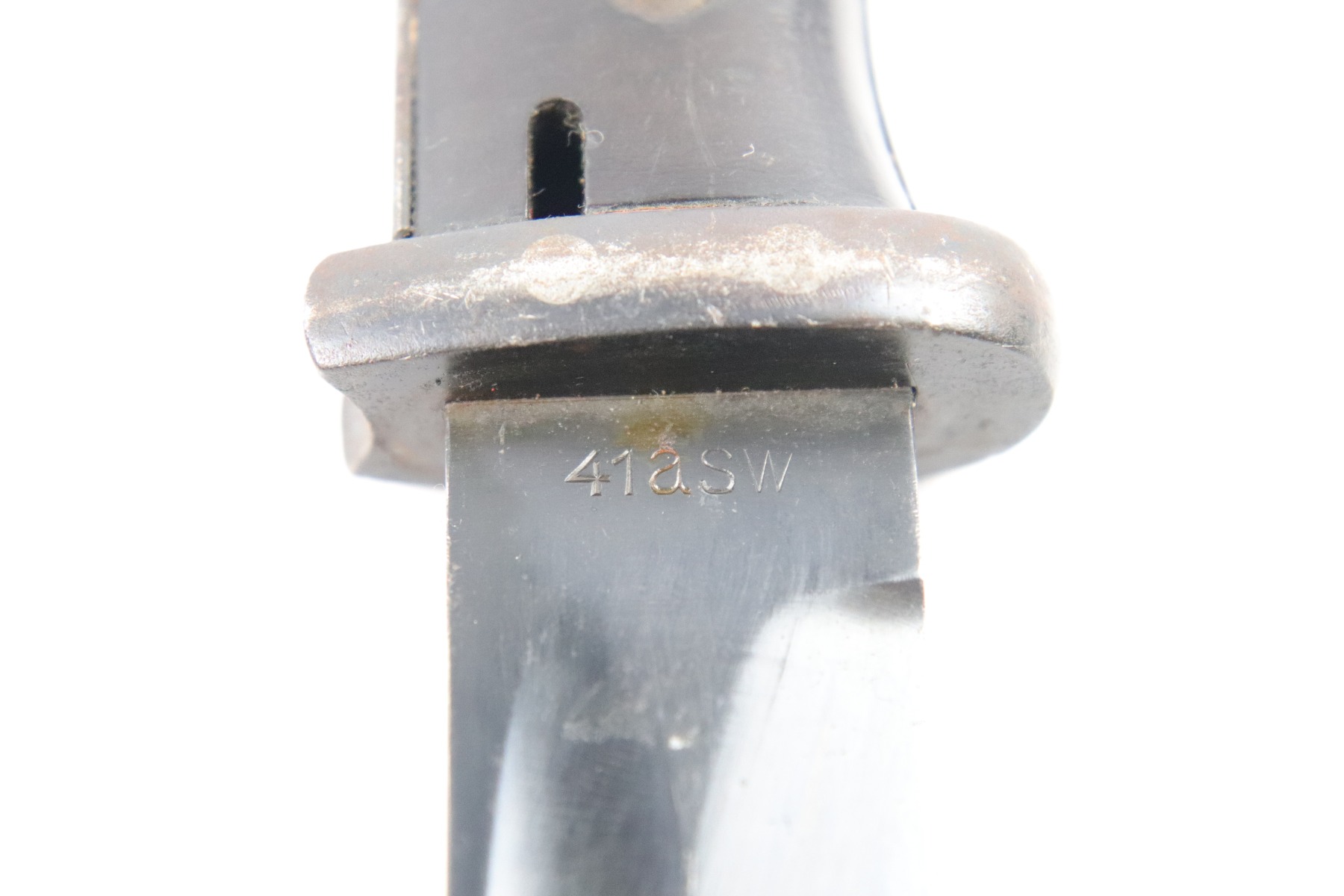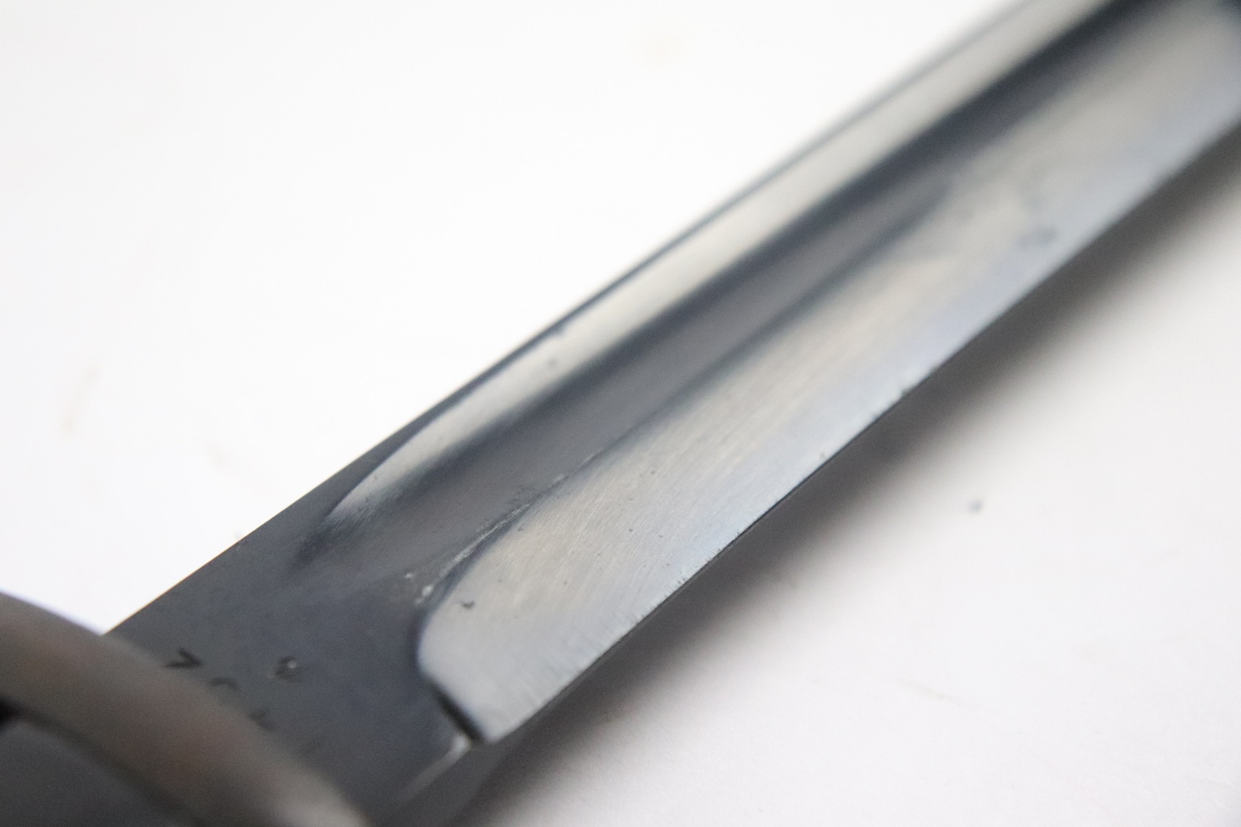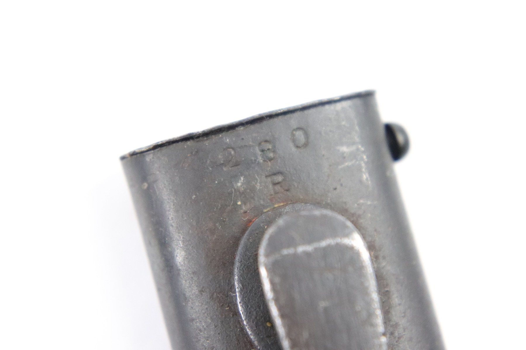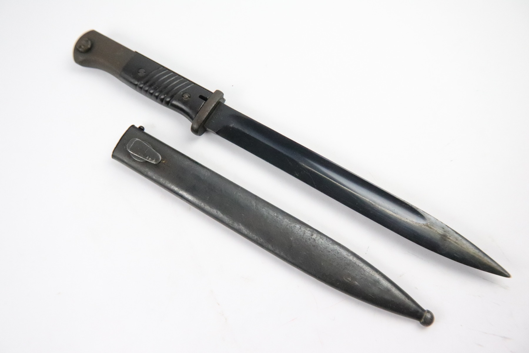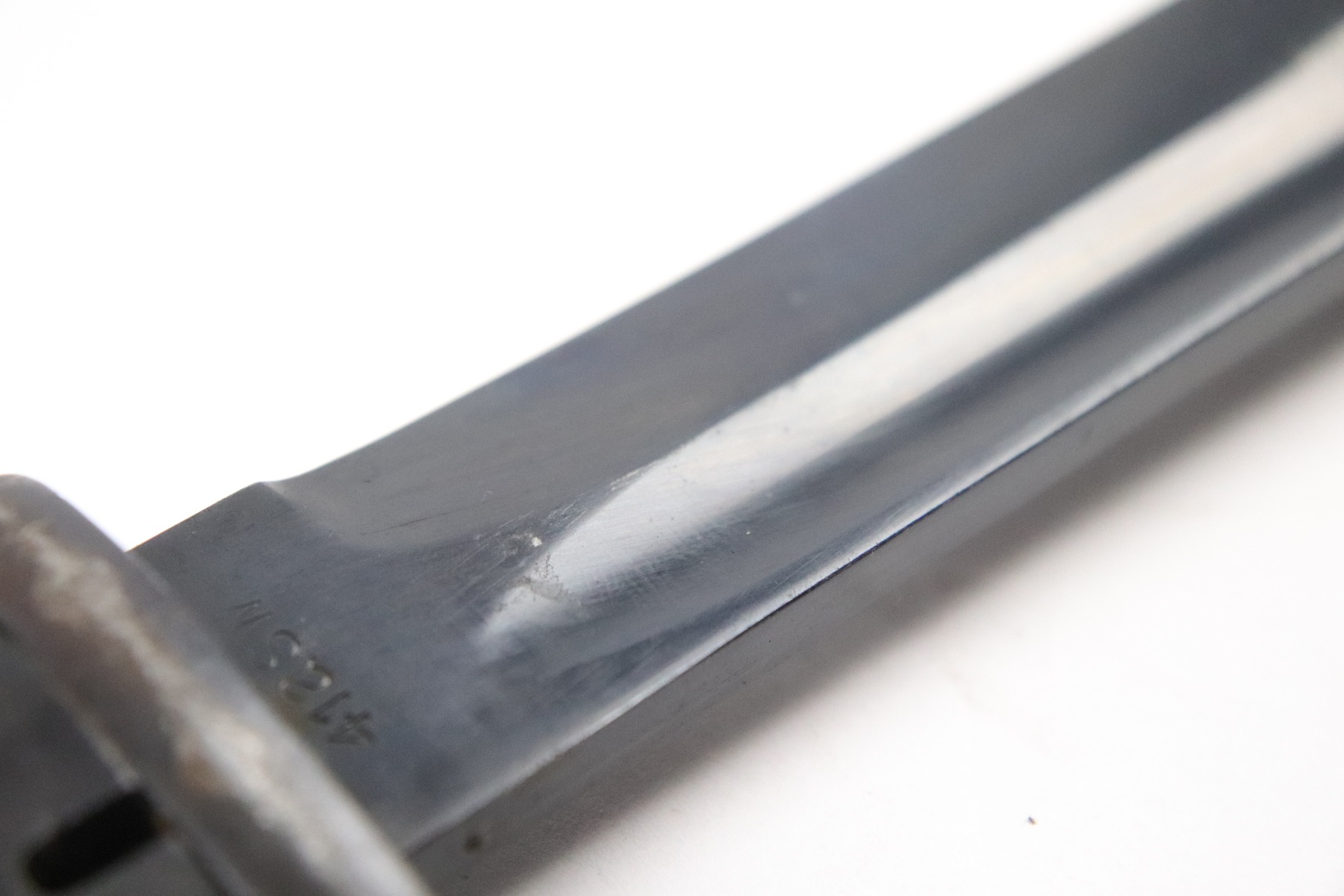 5/15/18 – This is an original WW2 production K98 Rifle bayonet. The blade is 1941 dated and the scabbard is 1942 dated. The blade is blued and in excellent condition with normal, light bluing loss but no major rust or signs of sharpening. The blade is serial numbered 1452r and the reverse side is 41 dated with an “asw” maker code. The handle has light surface rust and discoloration on the metal parts and the handle has waffen WaA883 acceptance stamps. The scabbard is 42 dated with a fnj maker code and serial numbered 280r on the reverse side. The scabbard has normal aging and discoloration throughout. Guaranteed original and authentic.