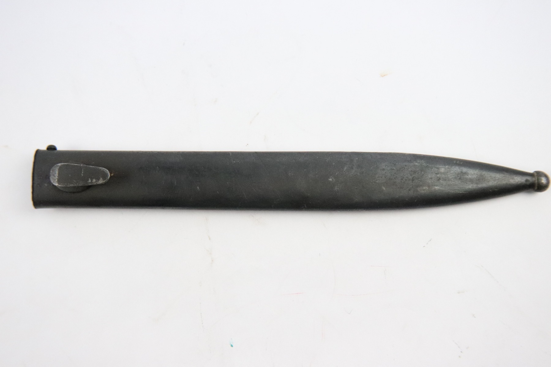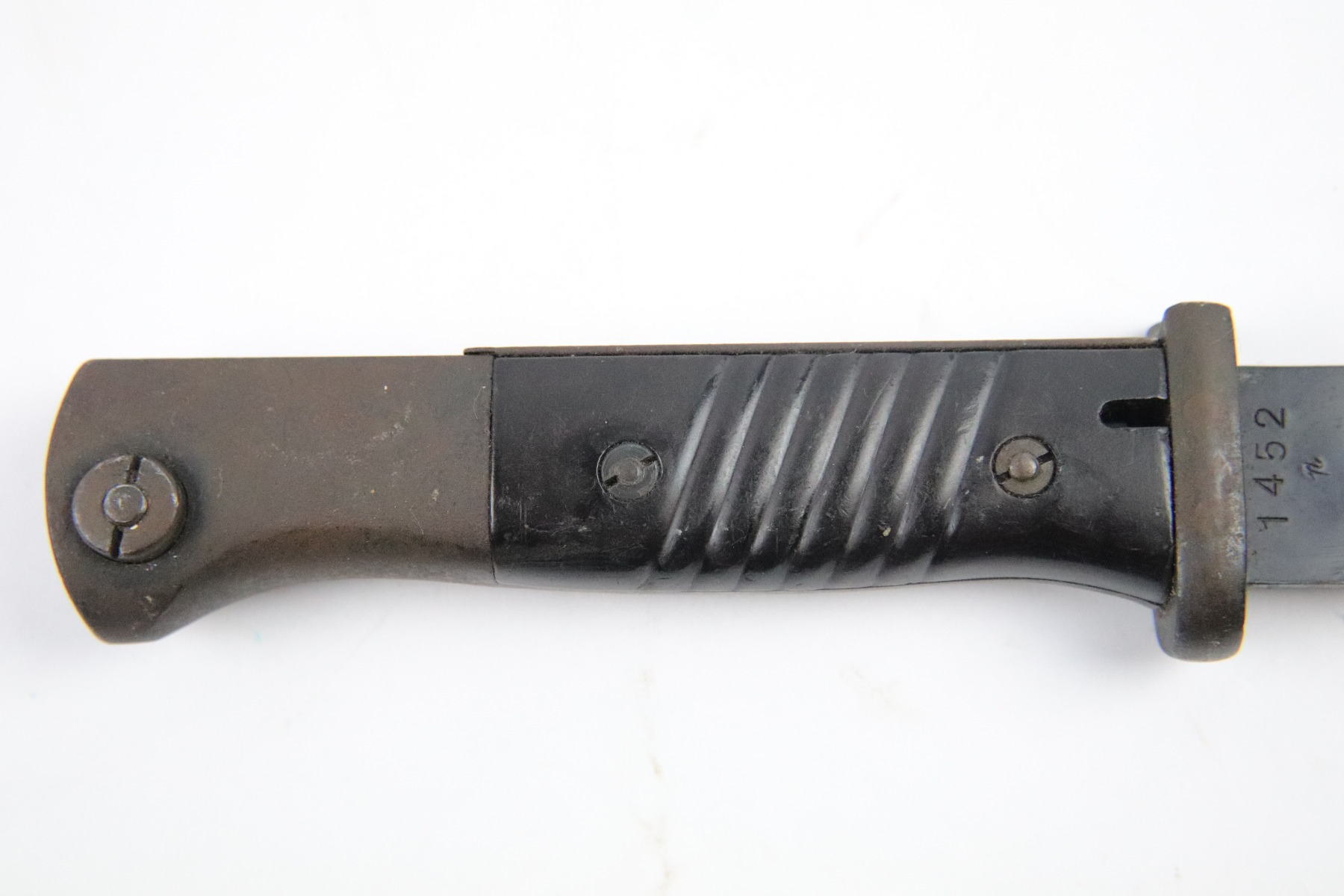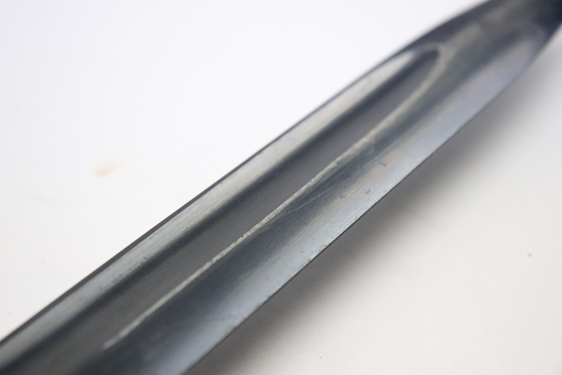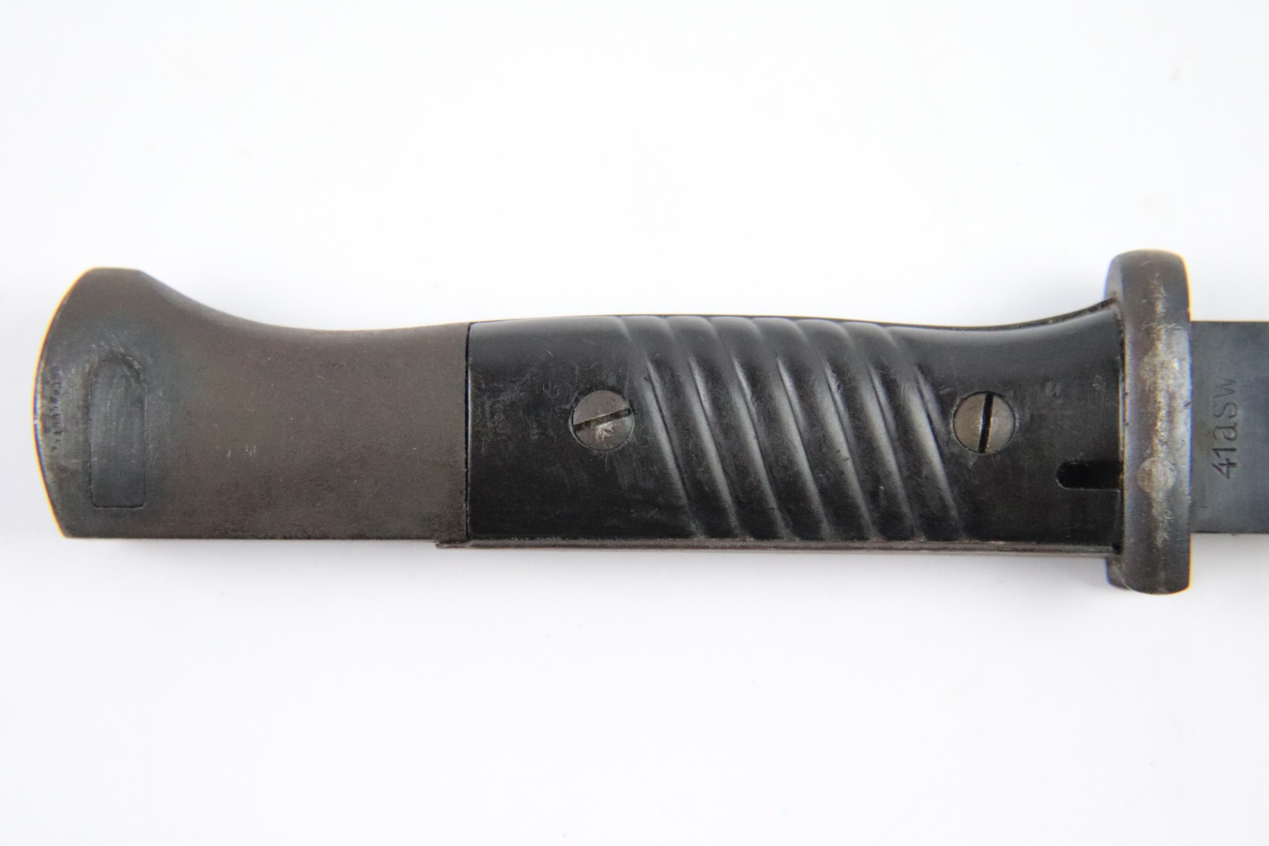 5/15/18 – This is an original WW2 production K98 Rifle bayonet. The blade is 1941 dated and the scabbard is 1942 dated. The blade is blued and in excellent condition with normal, light bluing loss but no major rust or signs of sharpening. The blade is serial numbered 1452r and the reverse side is 41 dated with an “asw” maker code. The handle has light surface rust and discoloration on the metal parts and the handle has waffen WaA883 acceptance stamps. The scabbard is 42 dated with a fnj maker code and serial numbered 280r on the reverse side. The scabbard has normal aging and discoloration throughout. Guaranteed original and authentic.