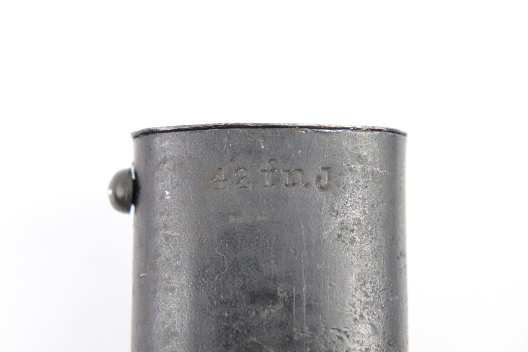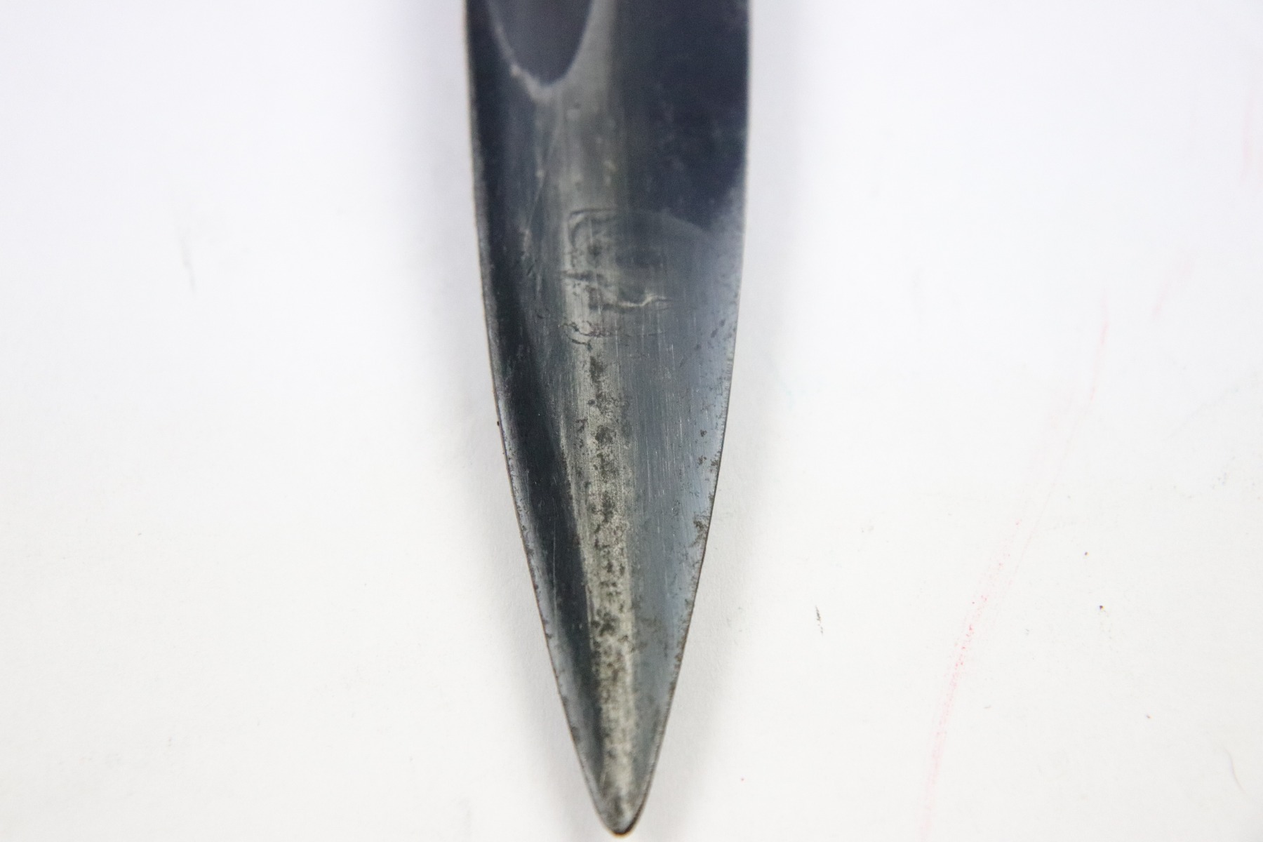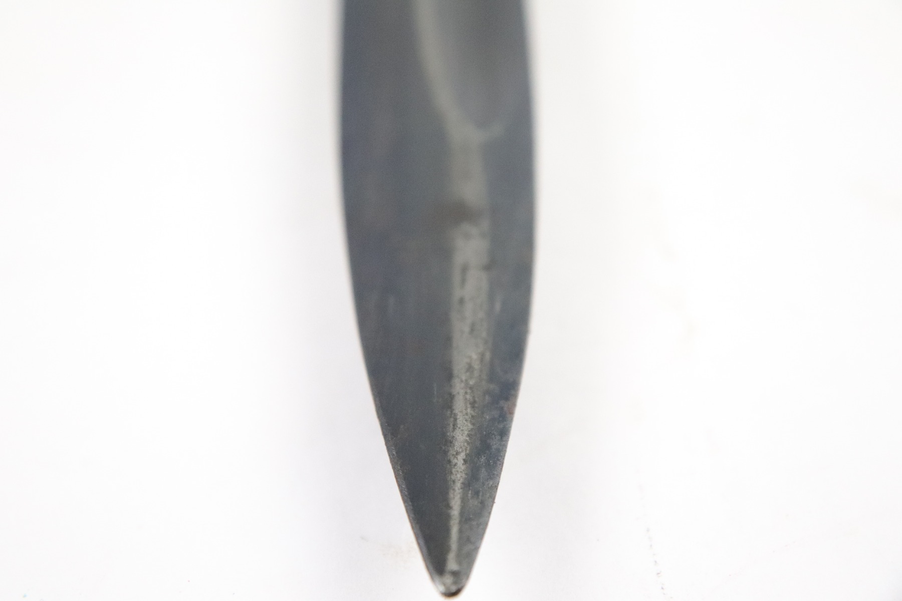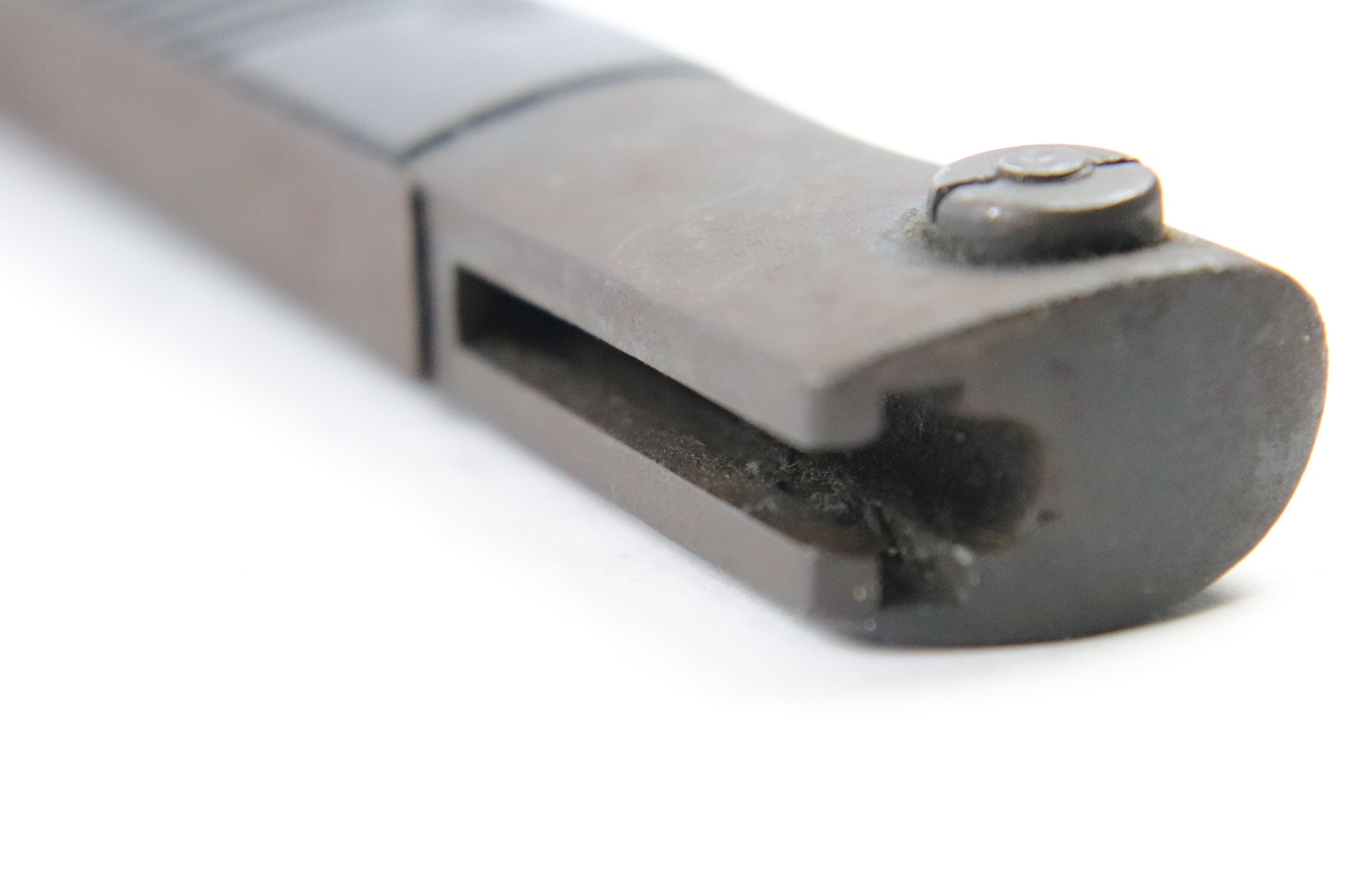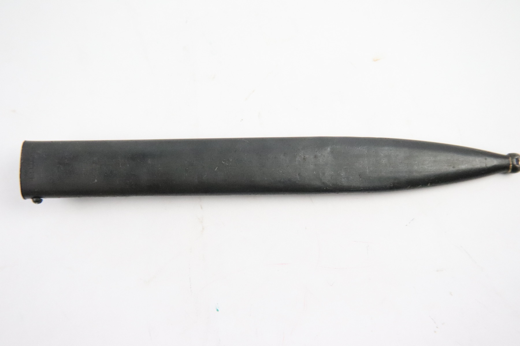 5/15/18 – This is an original WW2 production K98 Rifle bayonet. The blade is 1941 dated and the scabbard is 1942 dated. The blade is blued and in excellent condition with normal, light bluing loss but no major rust or signs of sharpening. The blade is serial numbered 1452r and the reverse side is 41 dated with an “asw” maker code. The handle has light surface rust and discoloration on the metal parts and the handle has waffen WaA883 acceptance stamps. The scabbard is 42 dated with a fnj maker code and serial numbered 280r on the reverse side. The scabbard has normal aging and discoloration throughout. Guaranteed original and authentic.