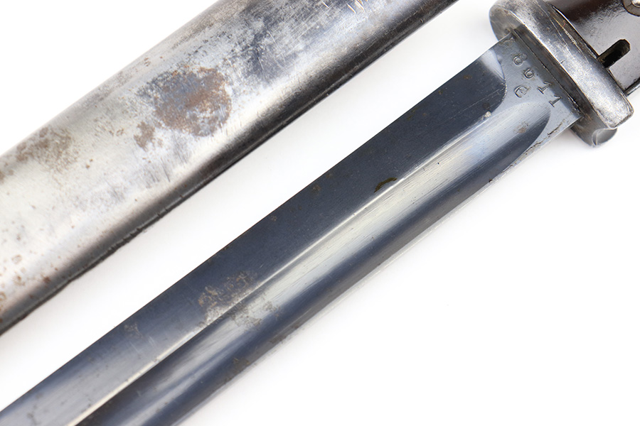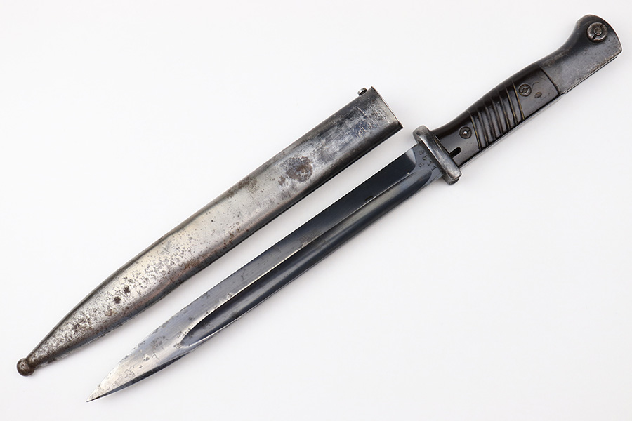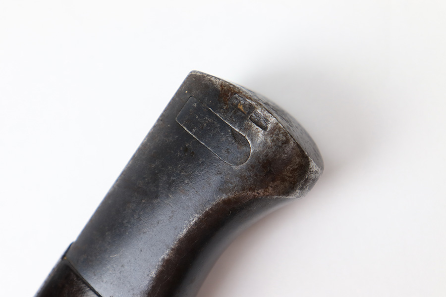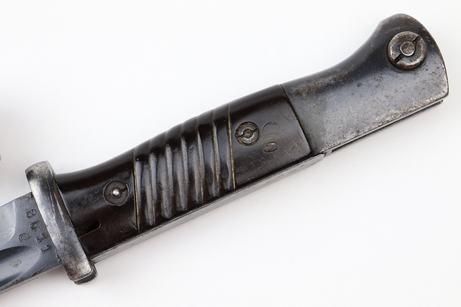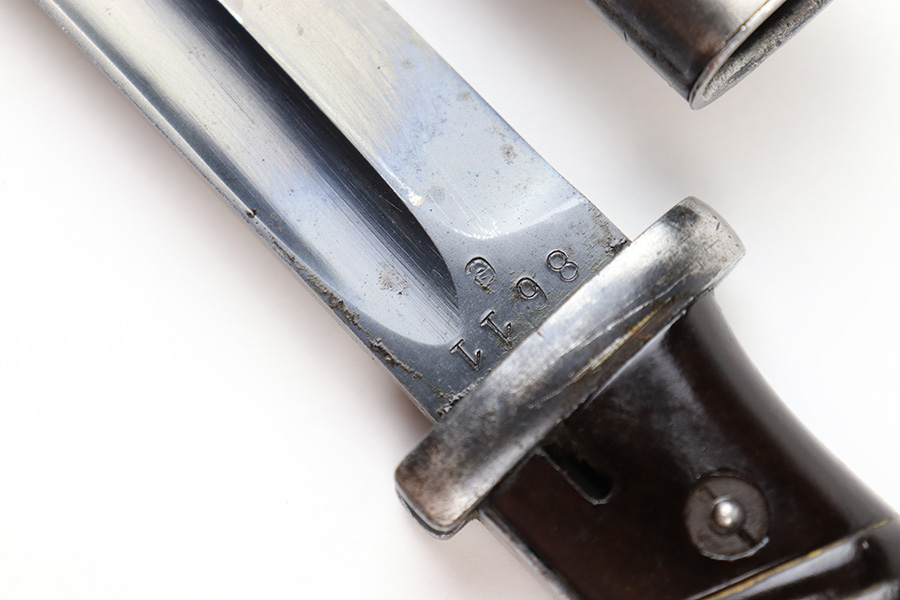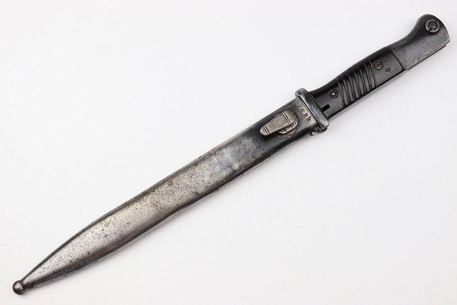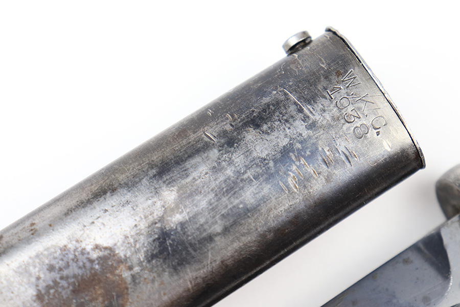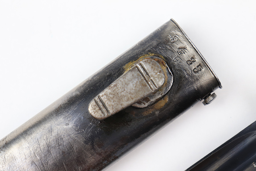 7/13/22 – This is an original 1939 dated K98 bayonet with a 1938 dated scabbard. The bayonet blade is in great condition with some spotty surface discoloration and finish loss near the tip. No signs of sharpening. Maker stamped on one side of the ricasso, and serial numbered on the reverse. The spine of the blade is ’39 dated. The hand guard and handle have some honest wear and mild finish loss amongst the original blued finish. The scabbard is missing most of the finish and has spotty patina throughout. The frog knob appears to have been welded back in place (shown by the gold / copper colored metal in this area).