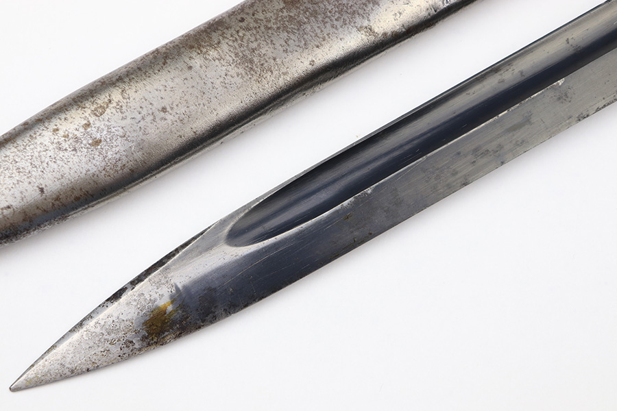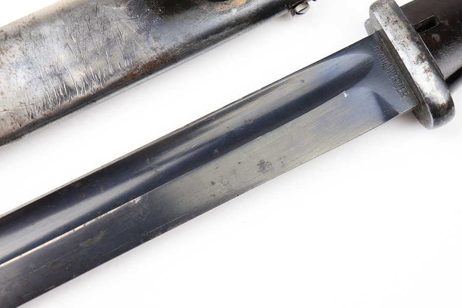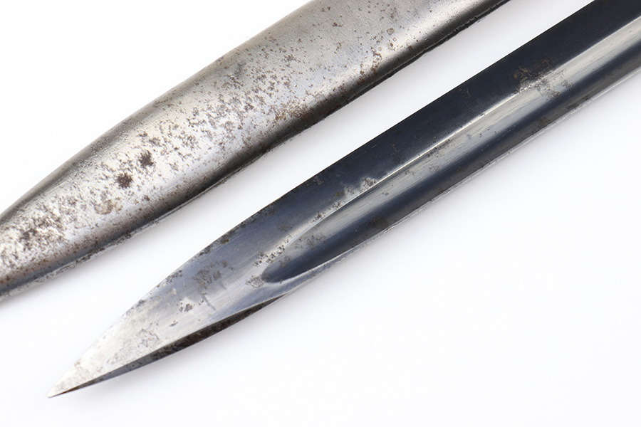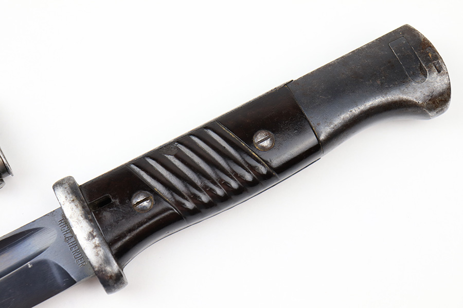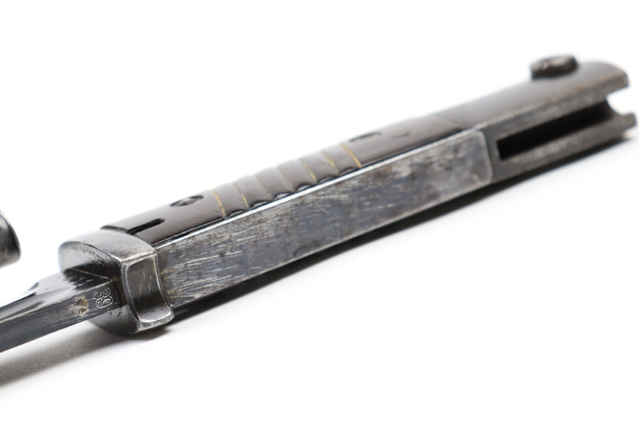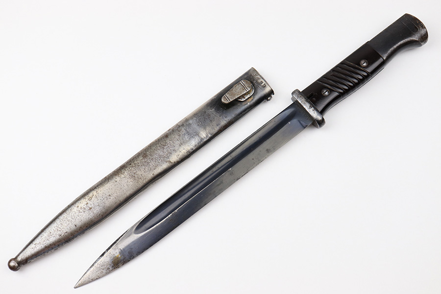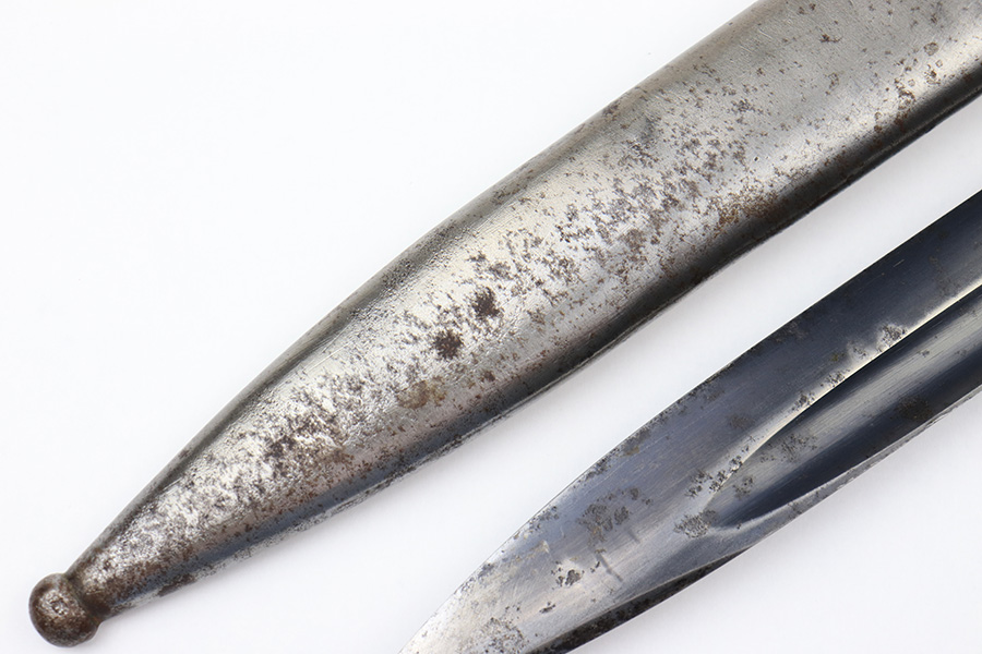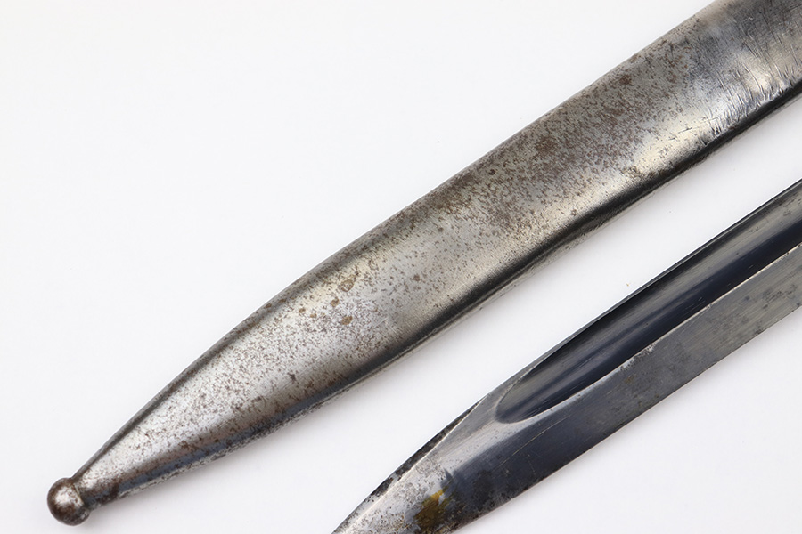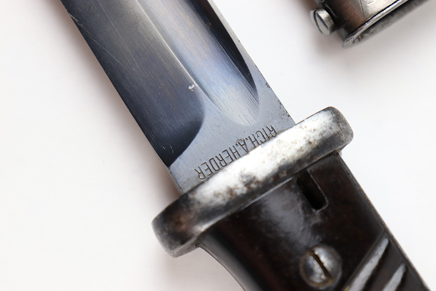 7/13/22 – This is an original 1939 dated K98 bayonet with a 1938 dated scabbard. The bayonet blade is in great condition with some spotty surface discoloration and finish loss near the tip. No signs of sharpening. Maker stamped on one side of the ricasso, and serial numbered on the reverse. The spine of the blade is ’39 dated. The hand guard and handle have some honest wear and mild finish loss amongst the original blued finish. The scabbard is missing most of the finish and has spotty patina throughout. The frog knob appears to have been welded back in place (shown by the gold / copper colored metal in this area).