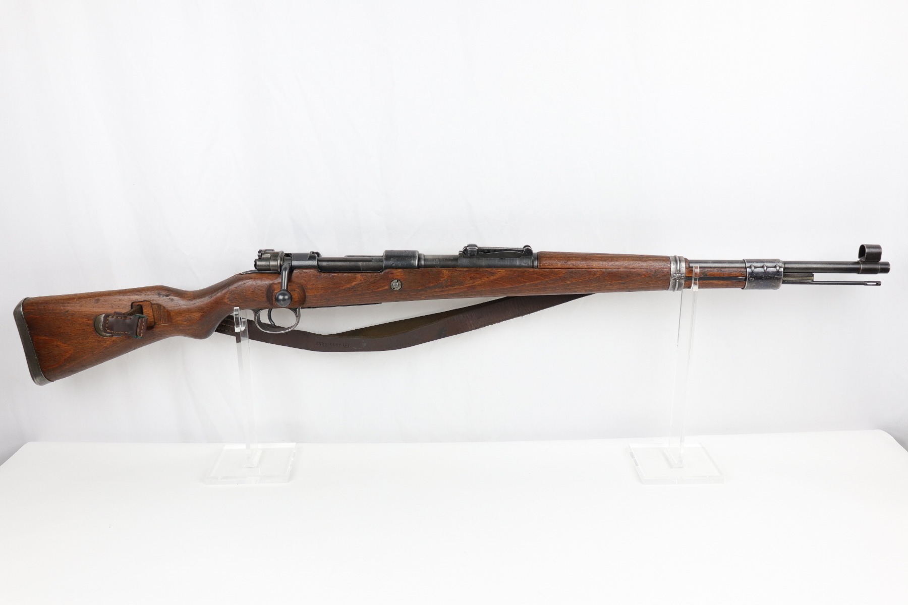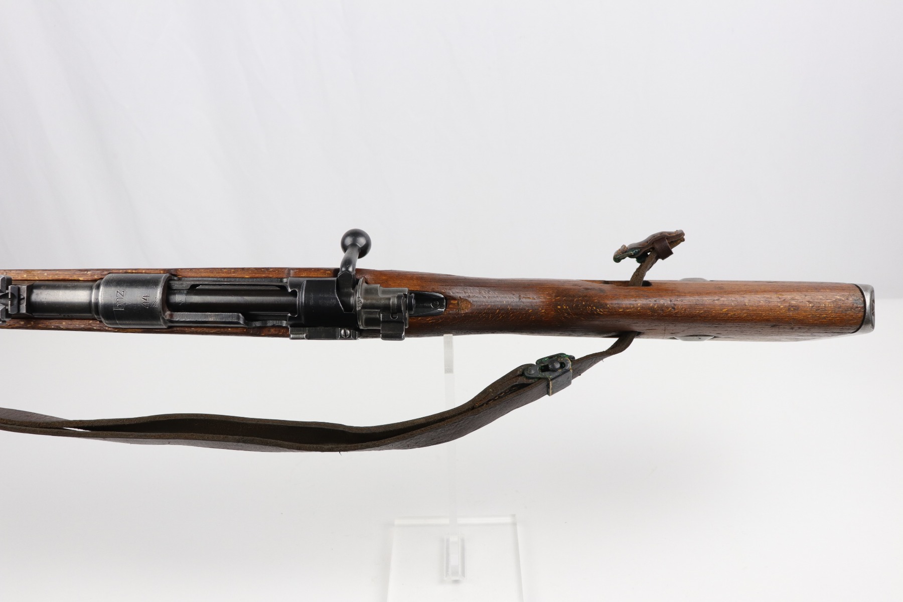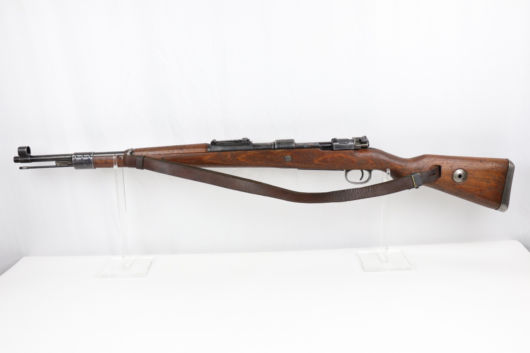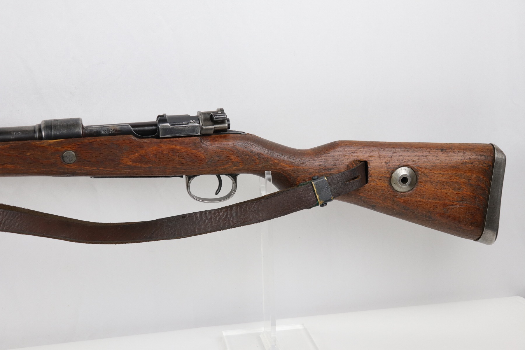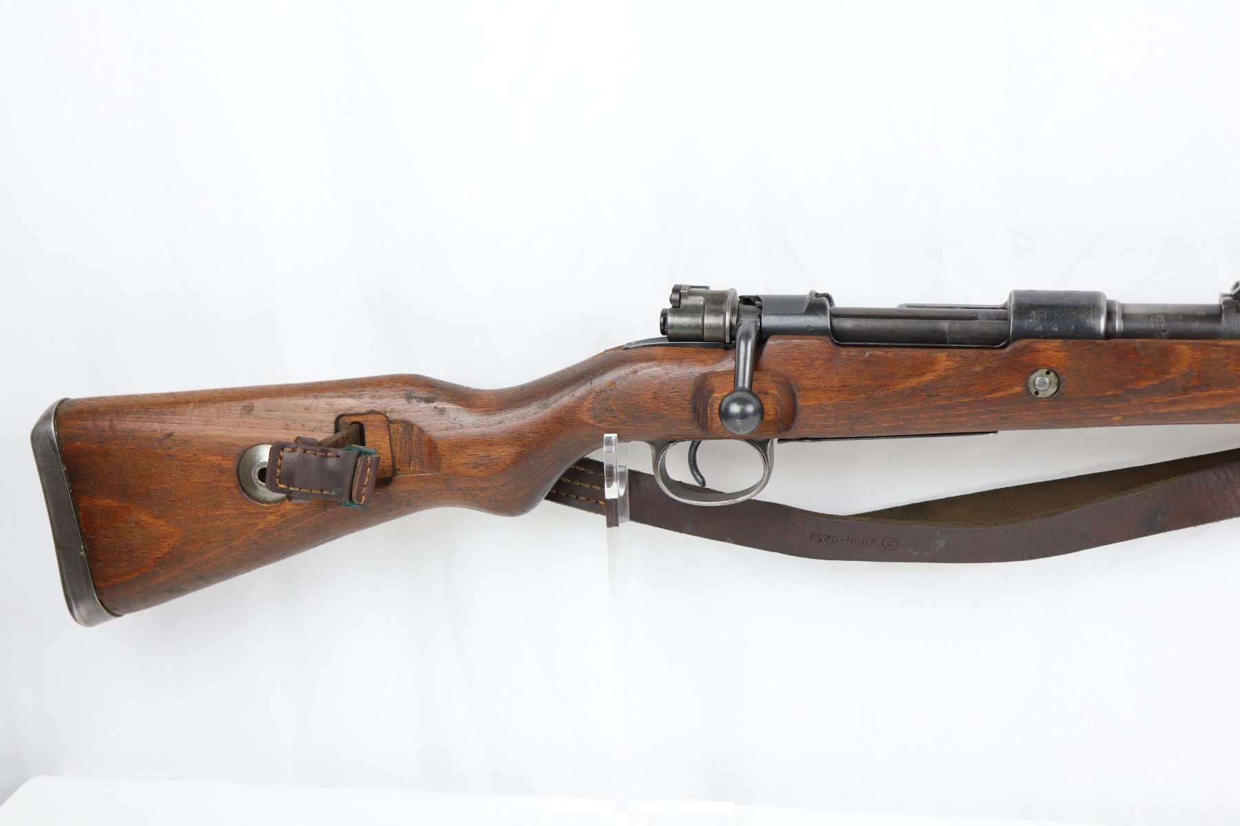 8/1/19 – This is an original BNZ 44 Steyr K98 made during WW2 with mismatched parts. The floorplate and barrel bands match each other, but none of the other parts. The bolt is also mismatched to the receiver. The parts are all WW2 original however, and in good condition. There’s some bluing loss on the metal as well as a few small areas of browning patina, but no excessive wear such as rust or pitting. Comes with an original cleaning rod and a leather strap. The strap looks aged but is not German, as the interior is numbered 2804 – 0252. The wood stock has a very faint waffen eagle stamped on the right side, but there are no other visible markings. Most likely due to sanding. Smooth action and an excellent, near mint bore shows minimal signs of use. Note that the cleaning rod doesn’t screw into place in the rifle, but does stay attached.