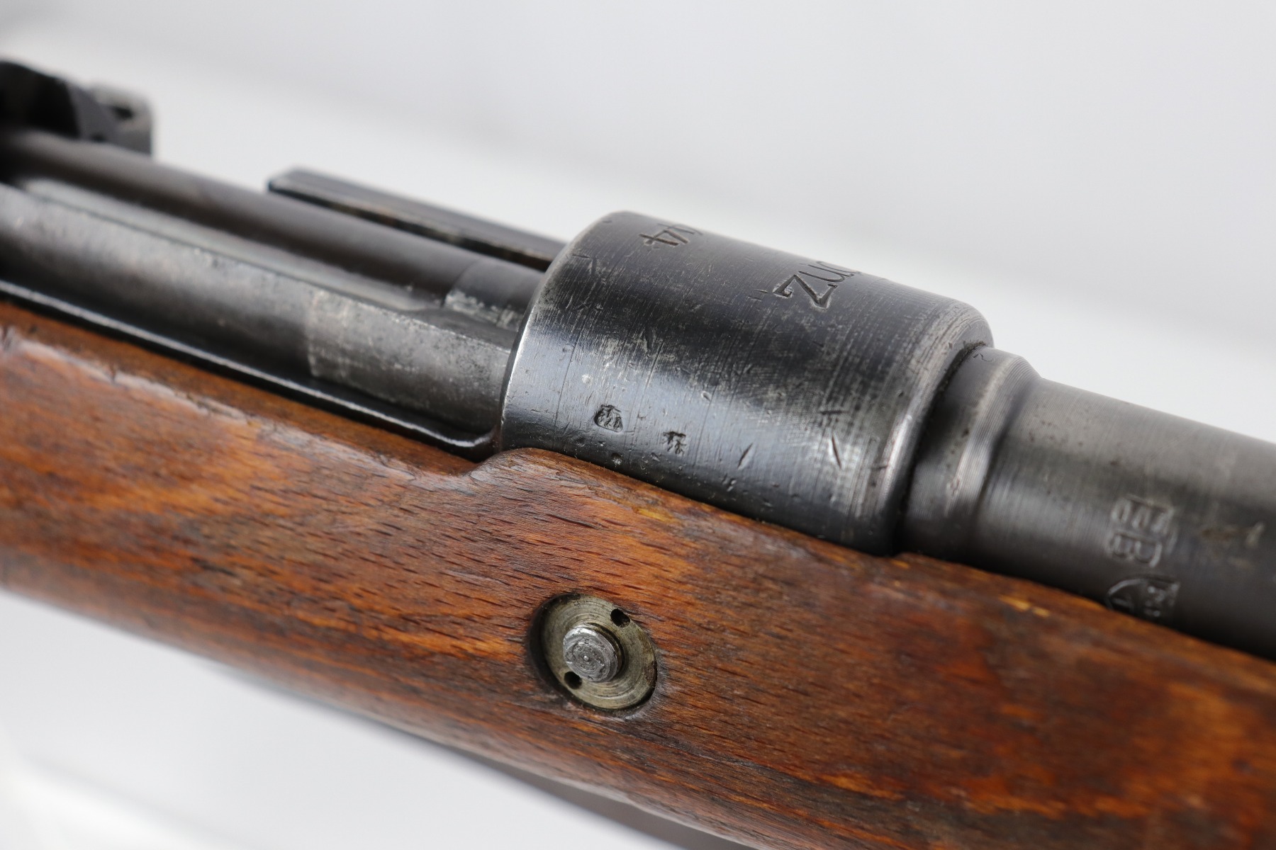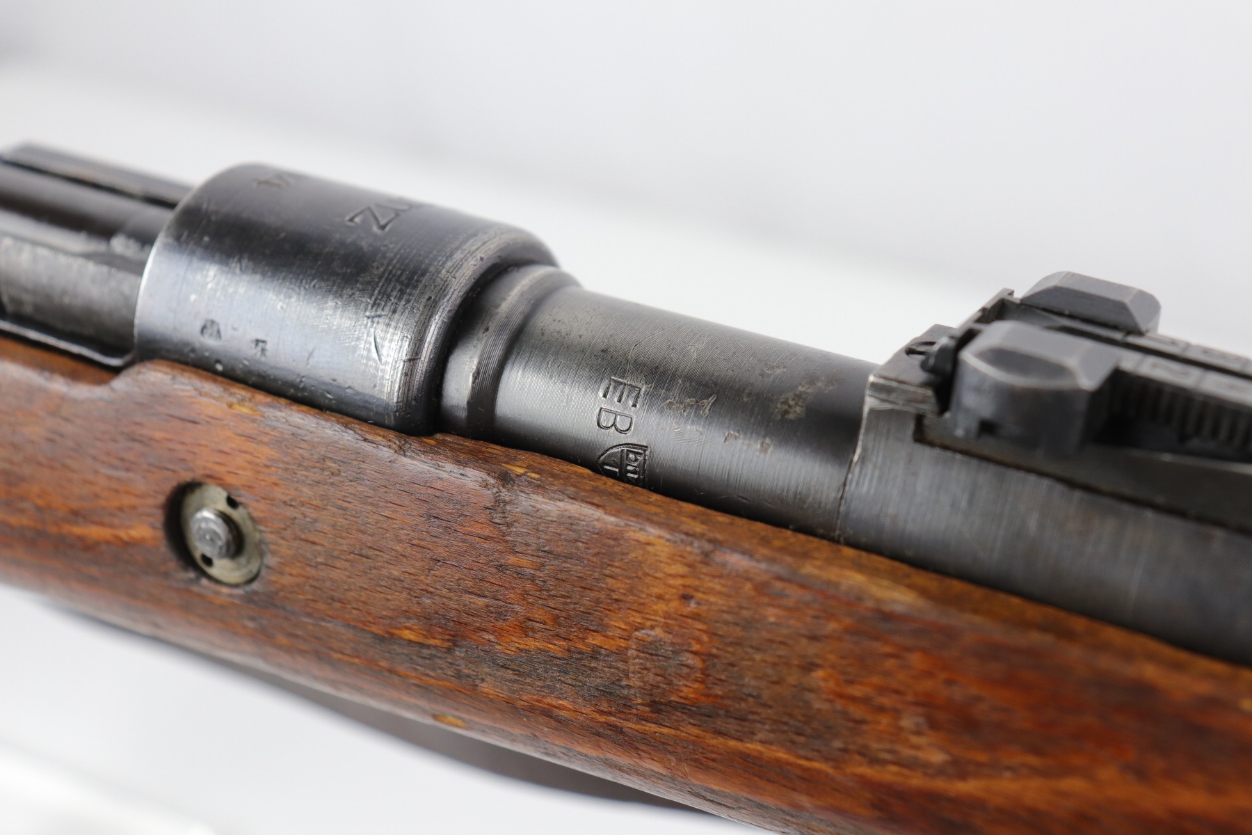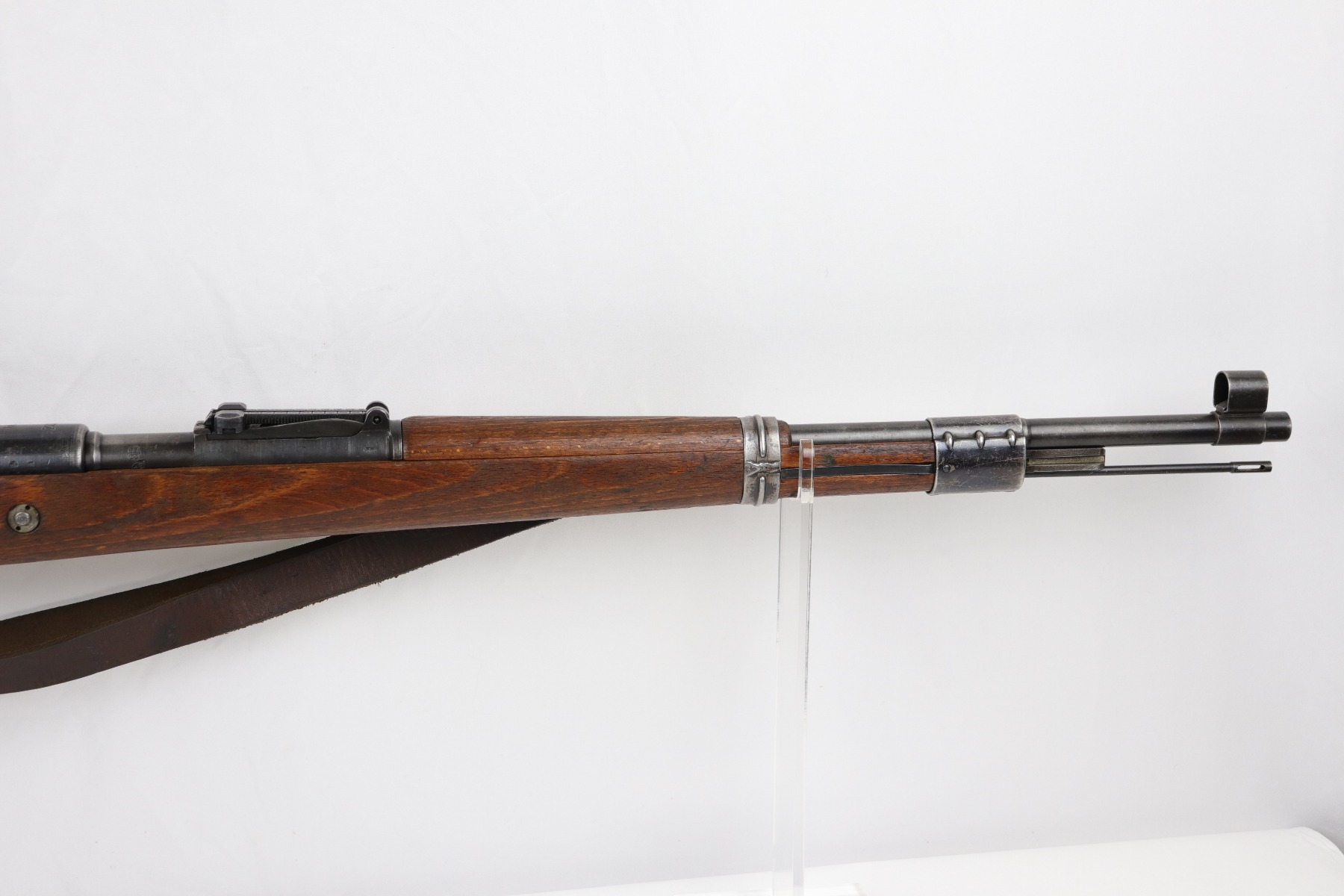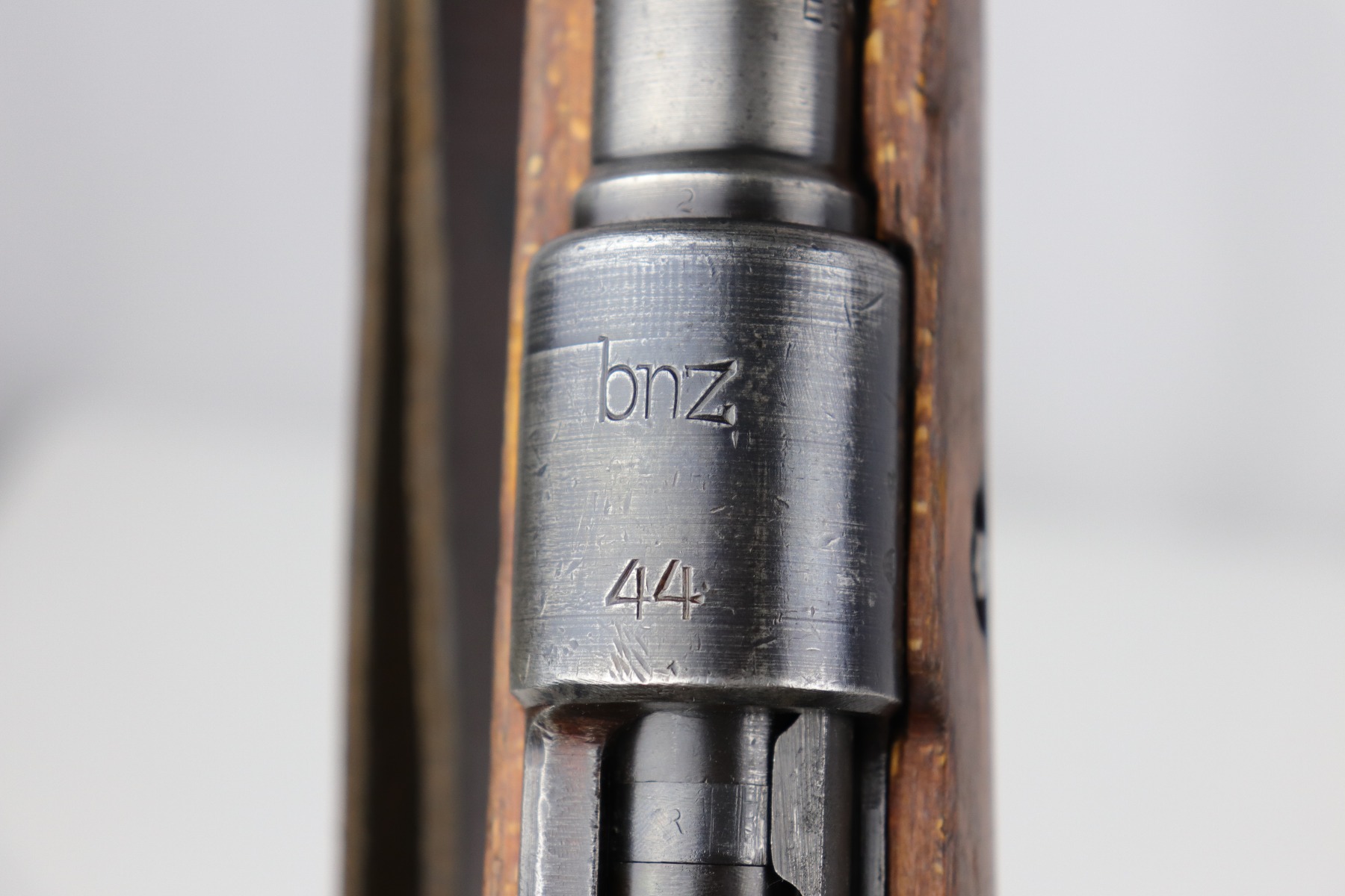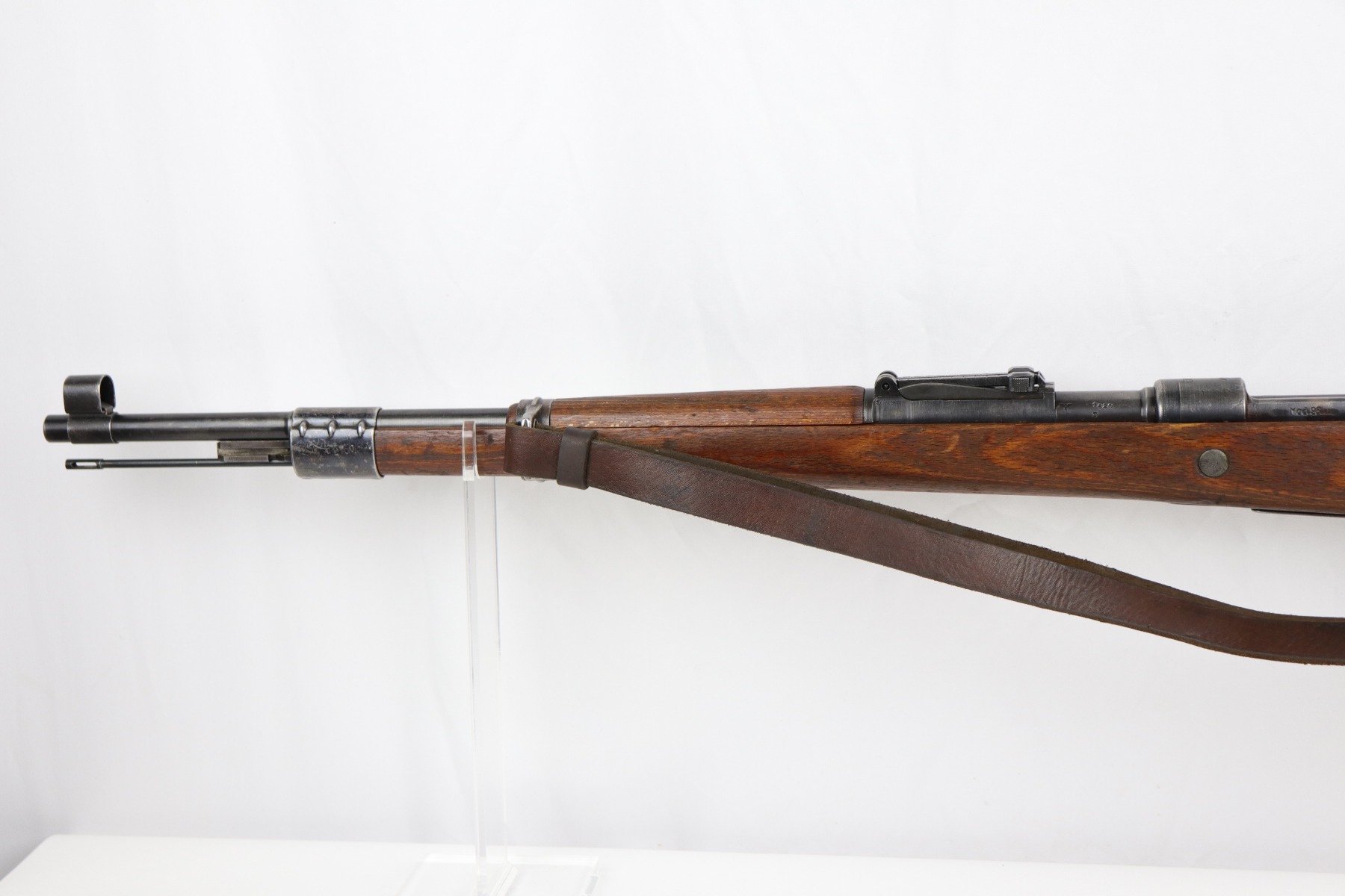 8/1/19 – This is an original BNZ 44 Steyr K98 made during WW2 with mismatched parts. The floorplate and barrel bands match each other, but none of the other parts. The bolt is also mismatched to the receiver. The parts are all WW2 original however, and in good condition. There’s some bluing loss on the metal as well as a few small areas of browning patina, but no excessive wear such as rust or pitting. Comes with an original cleaning rod and a leather strap. The strap looks aged but is not German, as the interior is numbered 2804 – 0252. The wood stock has a very faint waffen eagle stamped on the right side, but there are no other visible markings. Most likely due to sanding. Smooth action and an excellent, near mint bore shows minimal signs of use. Note that the cleaning rod doesn’t screw into place in the rifle, but does stay attached.