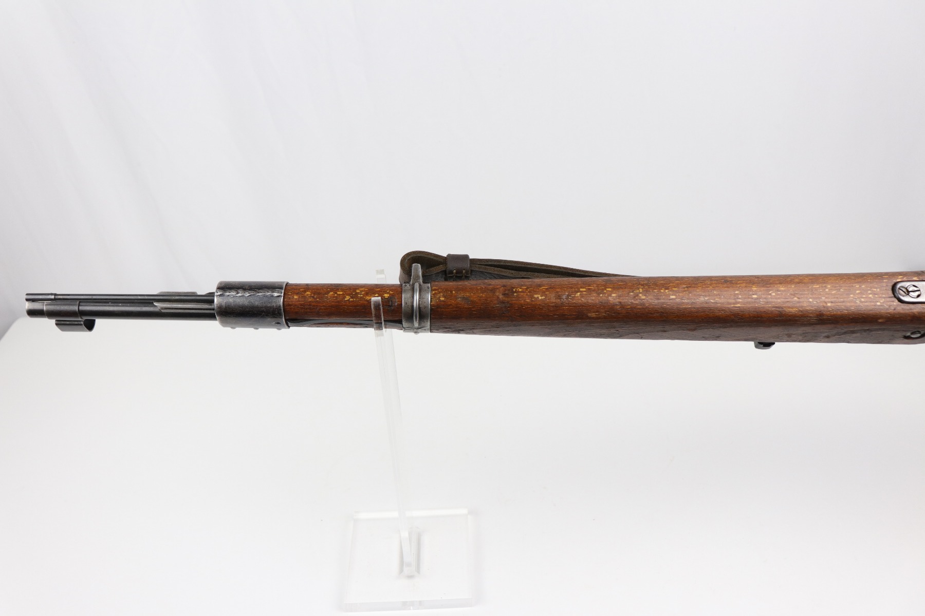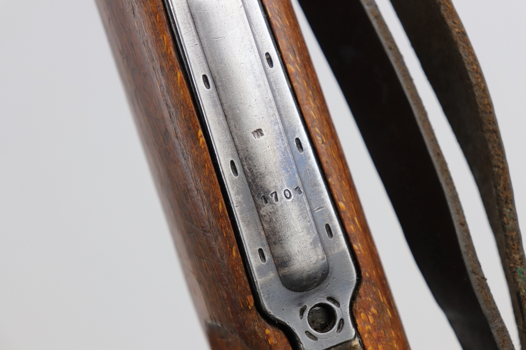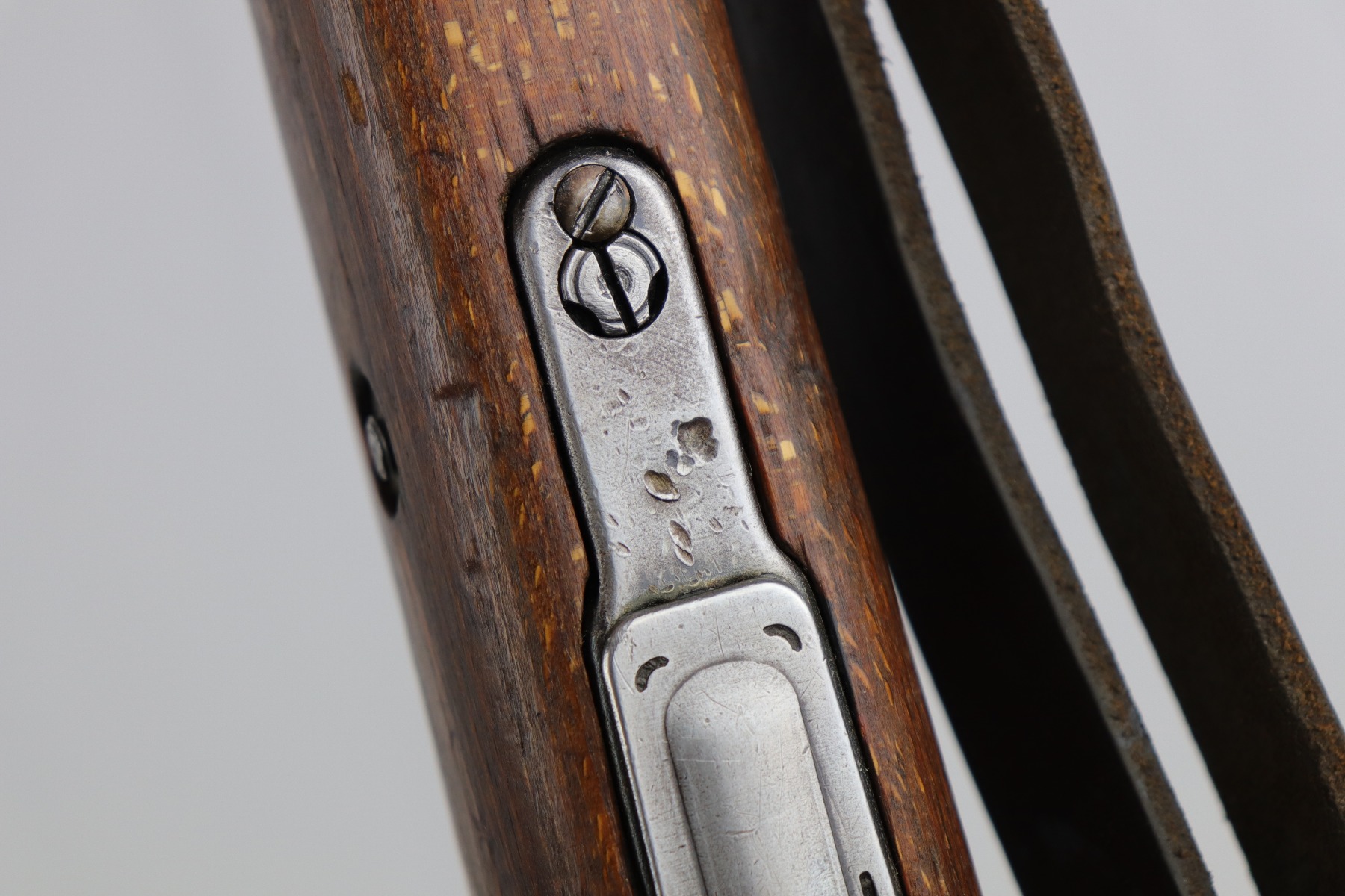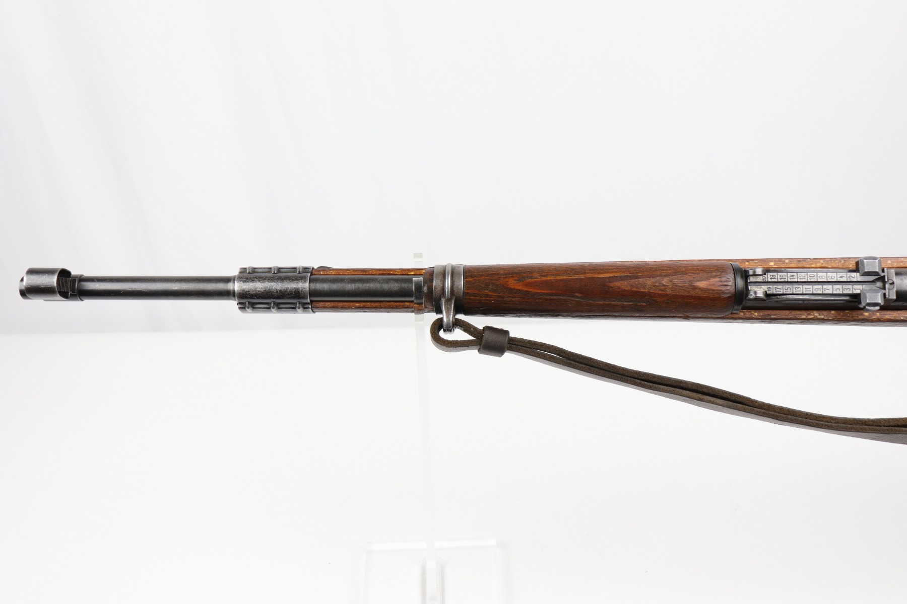 8/1/19 – This is an original BNZ 44 Steyr K98 made during WW2 with mismatched parts. The floorplate and barrel bands match each other, but none of the other parts. The bolt is also mismatched to the receiver. The parts are all WW2 original however, and in good condition. There’s some bluing loss on the metal as well as a few small areas of browning patina, but no excessive wear such as rust or pitting. Comes with an original cleaning rod and a leather strap. The strap looks aged but is not German, as the interior is numbered 2804 – 0252. The wood stock has a very faint waffen eagle stamped on the right side, but there are no other visible markings. Most likely due to sanding. Smooth action and an excellent, near mint bore shows minimal signs of use. Note that the cleaning rod doesn’t screw into place in the rifle, but does stay attached.