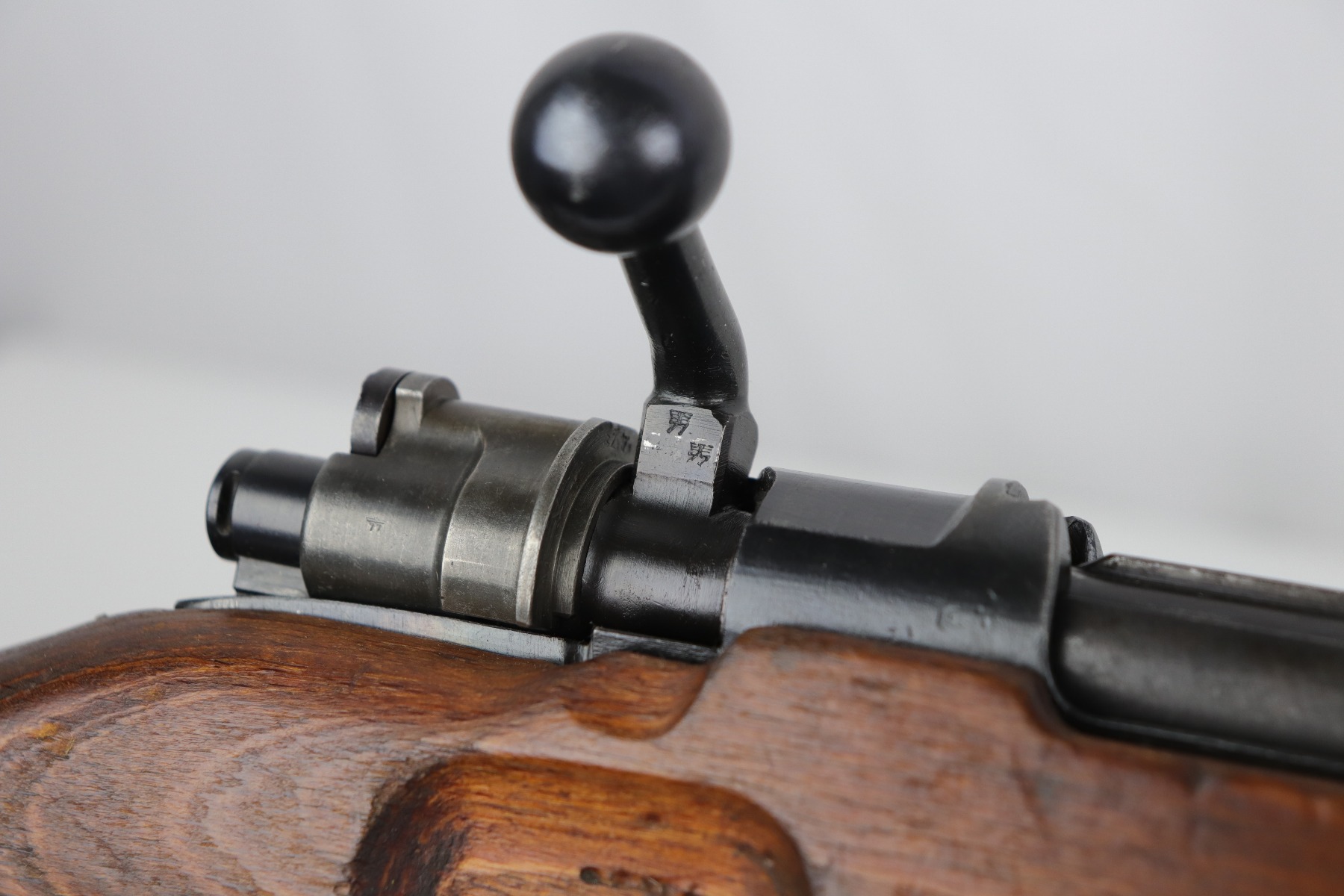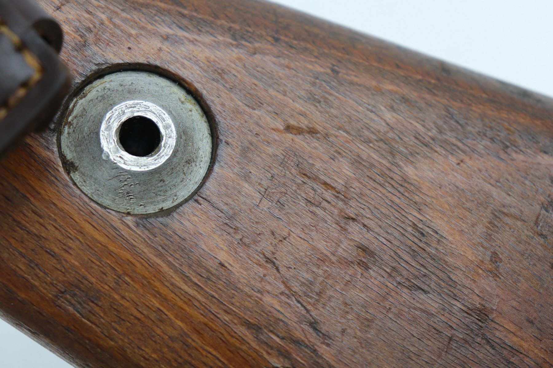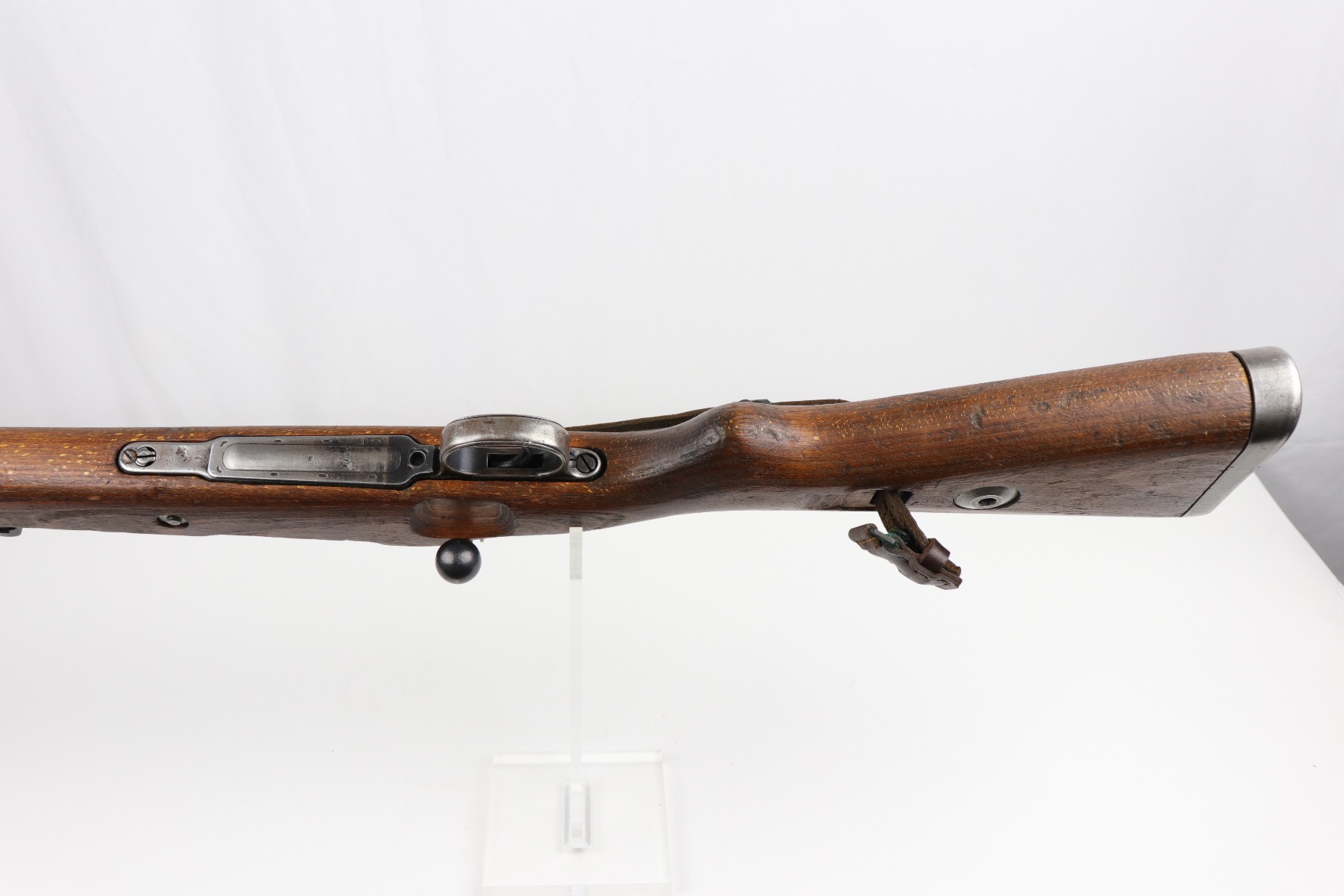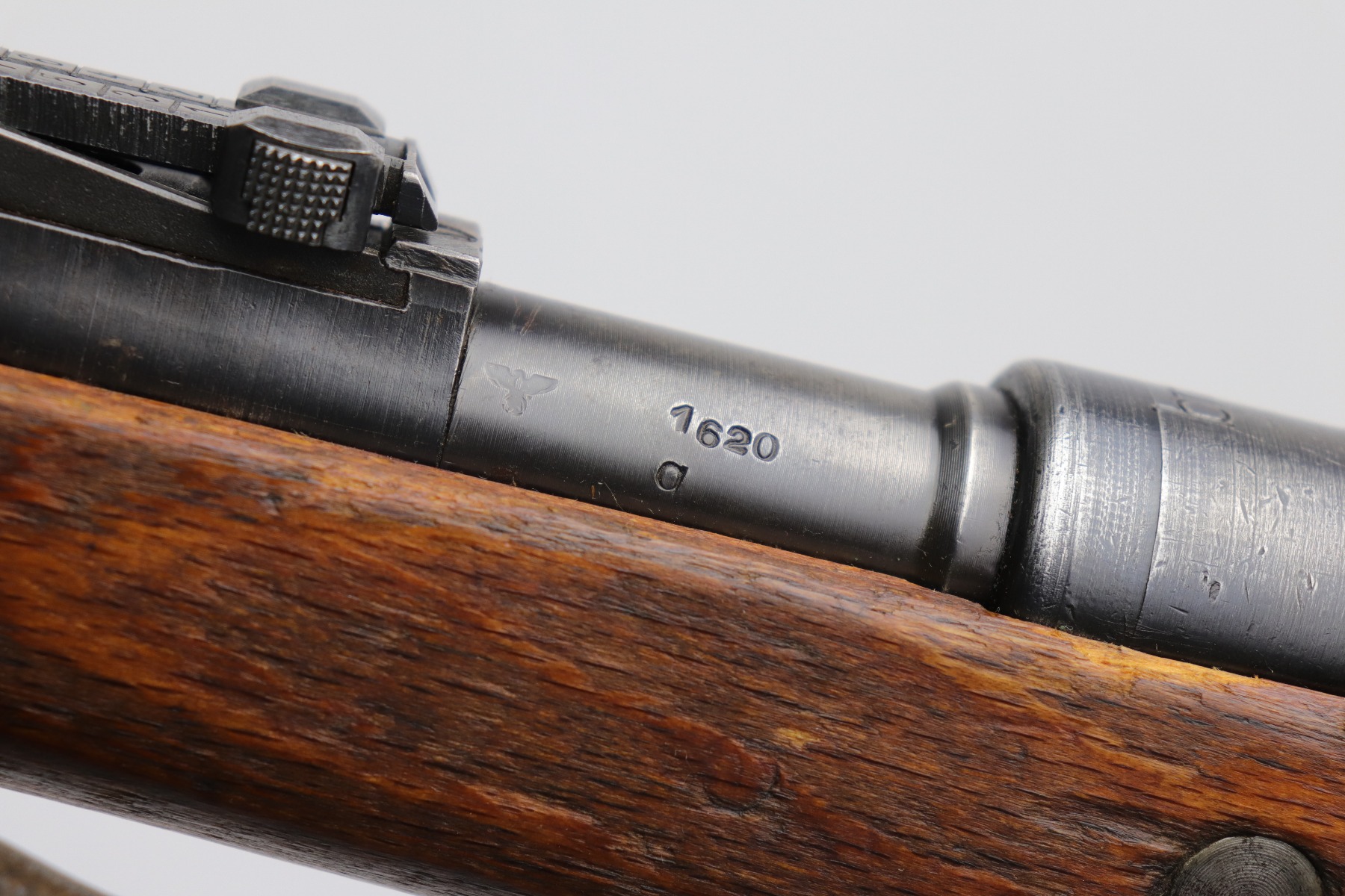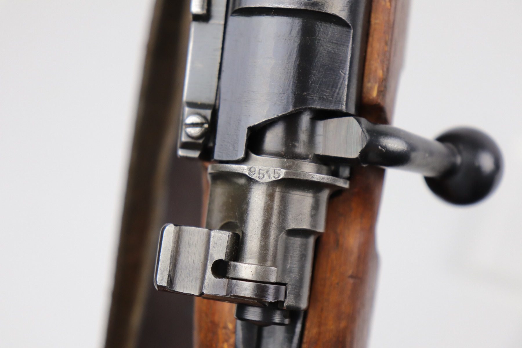 8/1/19 – This is an original BNZ 44 Steyr K98 made during WW2 with mismatched parts. The floorplate and barrel bands match each other, but none of the other parts. The bolt is also mismatched to the receiver. The parts are all WW2 original however, and in good condition. There’s some bluing loss on the metal as well as a few small areas of browning patina, but no excessive wear such as rust or pitting. Comes with an original cleaning rod and a leather strap. The strap looks aged but is not German, as the interior is numbered 2804 – 0252. The wood stock has a very faint waffen eagle stamped on the right side, but there are no other visible markings. Most likely due to sanding. Smooth action and an excellent, near mint bore shows minimal signs of use. Note that the cleaning rod doesn’t screw into place in the rifle, but does stay attached.