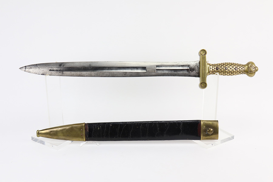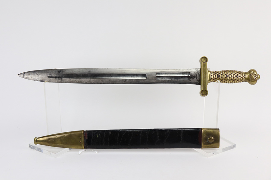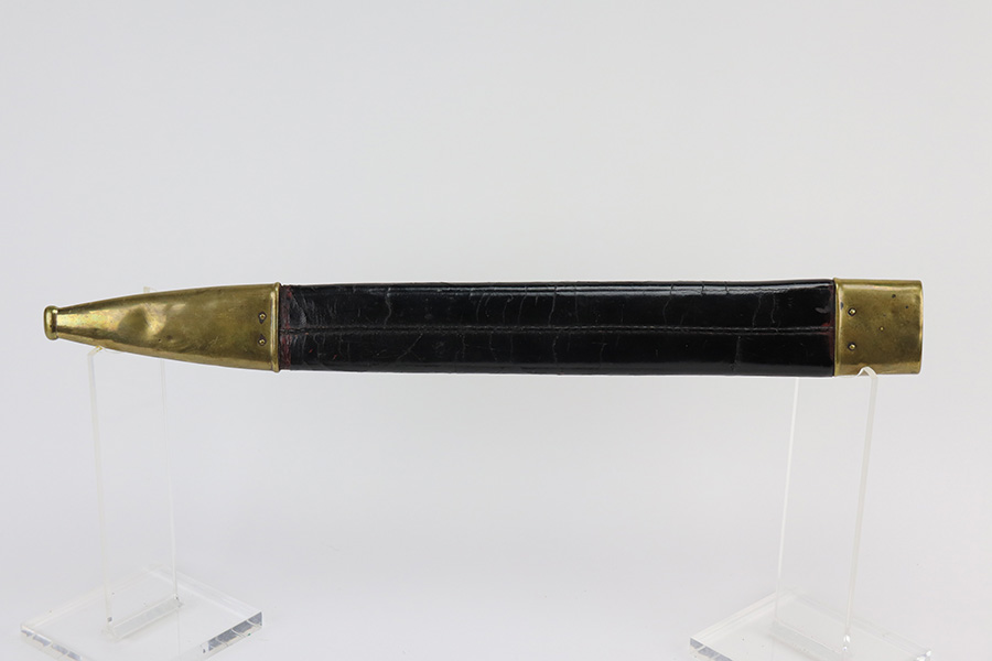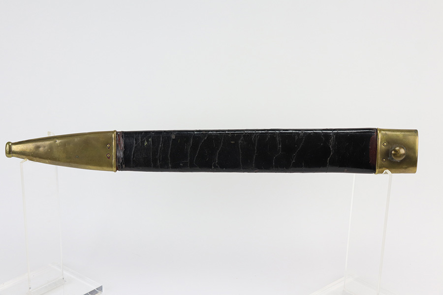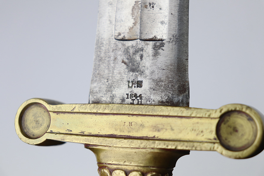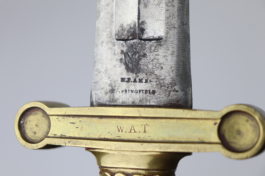 5/12/21 – This is an original foot artillery short sword model 1832 from the Civil War. The sword is maker stamped “N.P. Ames” on one side and is dated 1844 on the other. The hand guard is marked on each side as well, with “W.A.T.” on one side and “JH” on the other. The blade shows no signs of sharpening and is in great condition considering its’ age. There some mild surface patina throughout, as shown. The blade measures 19 inches long. The handle has mild patina but no excessive wear. Original scabbard is in great condition with some mild surface cracking on the leather portion.