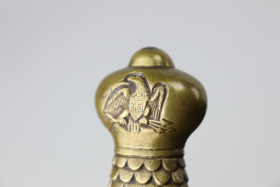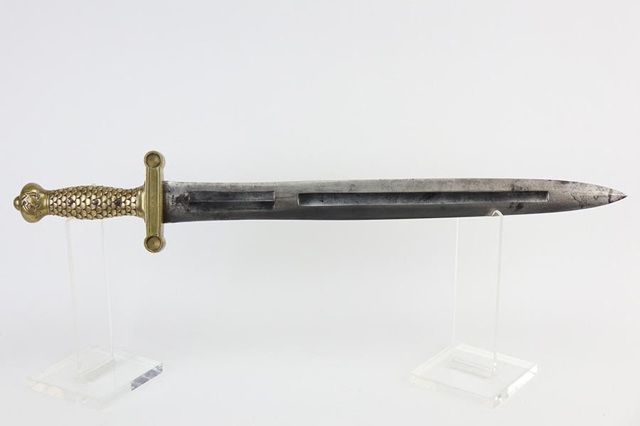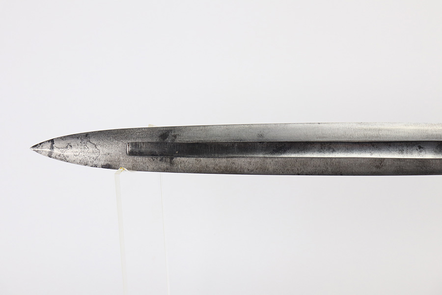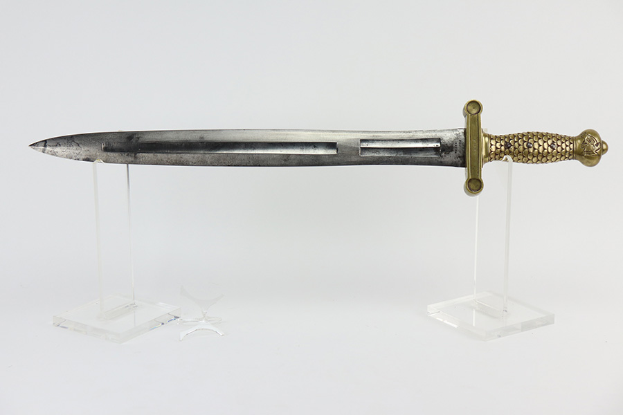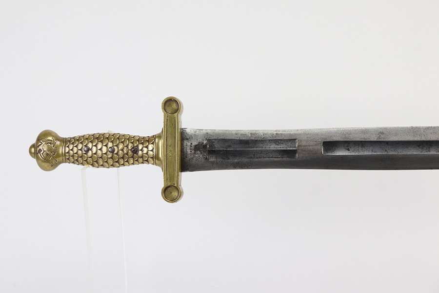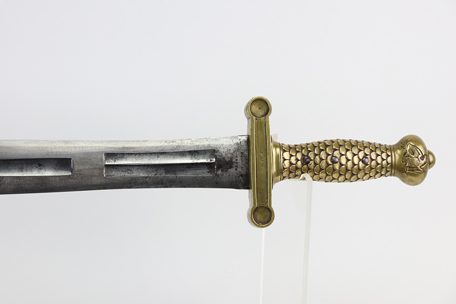 5/12/21 – This is an original foot artillery short sword model 1832 from the Civil War. The sword is maker stamped “N.P. Ames” on one side and is dated 1844 on the other. The hand guard is marked on each side as well, with “W.A.T.” on one side and “JH” on the other. The blade shows no signs of sharpening and is in great condition considering its’ age. There some mild surface patina throughout, as shown. The blade measures 19 inches long. The handle has mild patina but no excessive wear. Original scabbard is in great condition with some mild surface cracking on the leather portion.