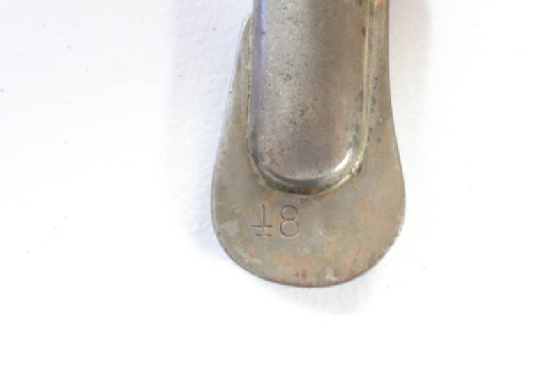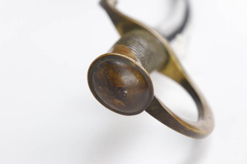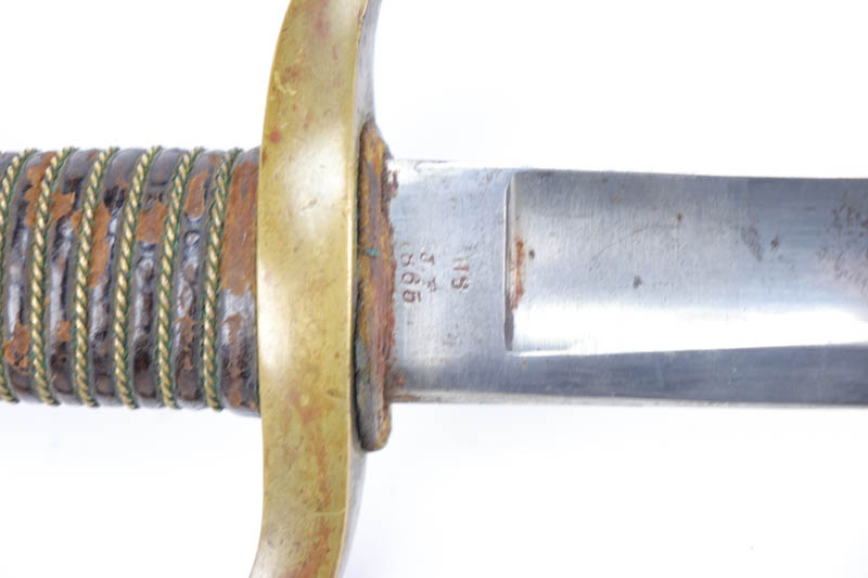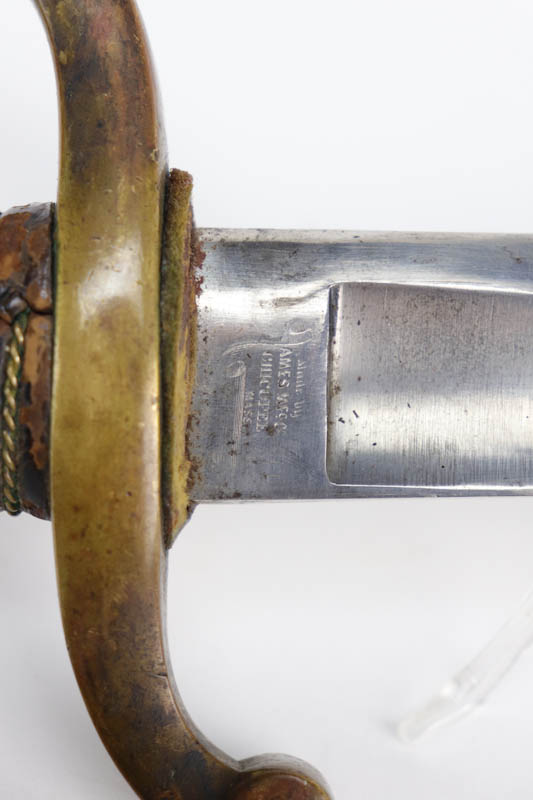 10/21/20 – This artillery saber was crafted by Ames Manufacturing in Massachusetts. It was manufactured during the last year of the U.S. Civil War for members of the Union artillery units. It is U.S. military proofed and marked with ‘J.F’ inspection stamp on the hilt. ’48’ is stamped on the bottom of the scabbard which is believed to be the unit designation. The handle is wrapped leather with brocade and a brass hilt. This unique piece is a fantastic example of a Civil War artifact. Excellent overall condition.