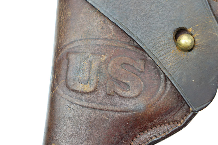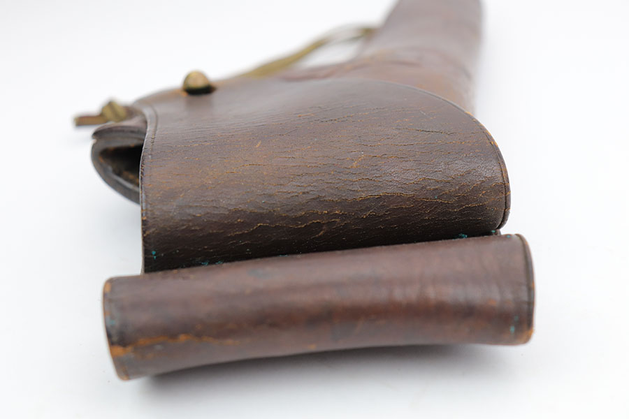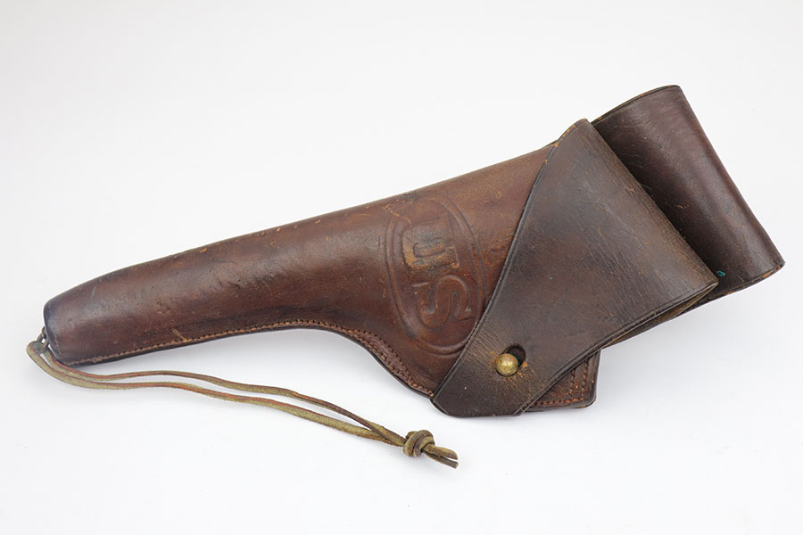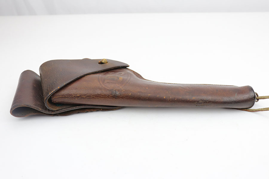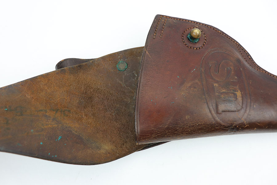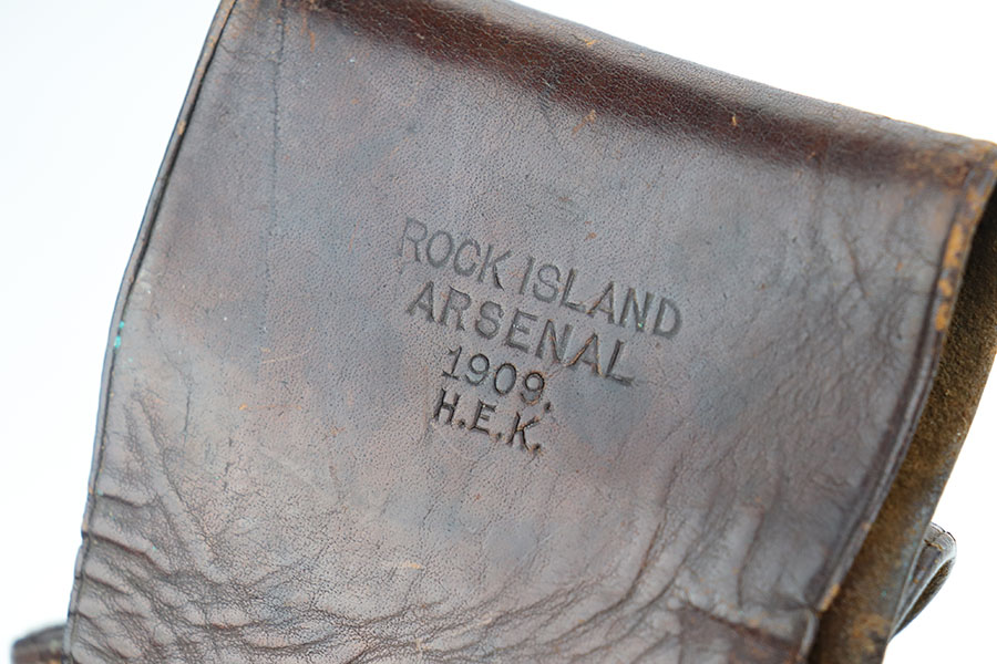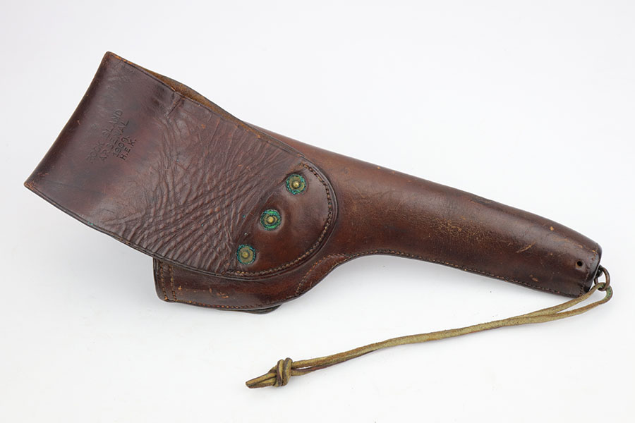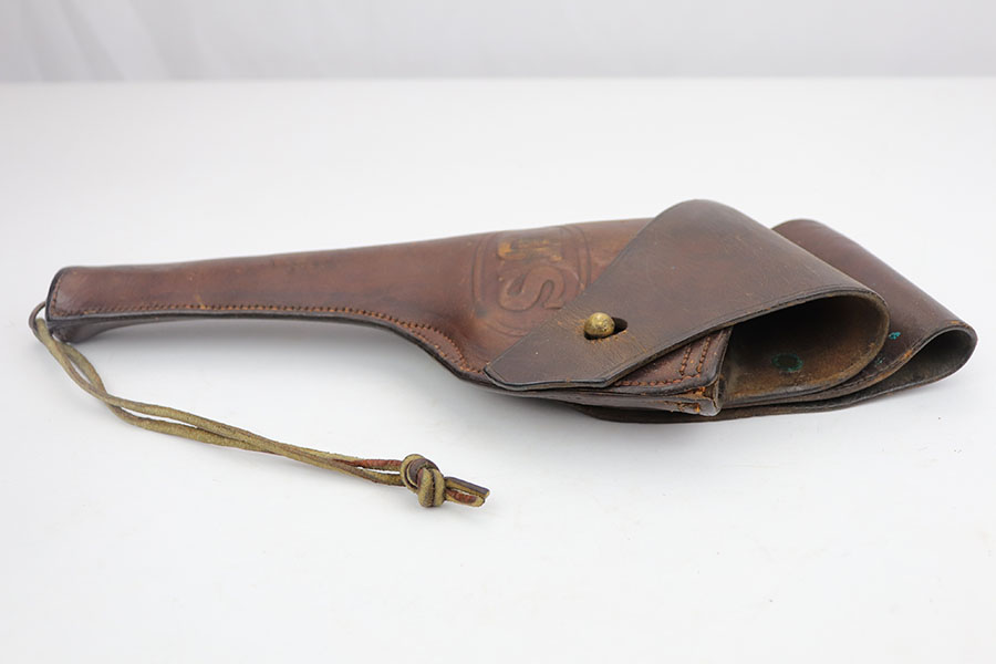 11/4/19 – This is an original Rock Island Arsenal made holster for the Colt model 1892 revolver. This revolver was used by the U.S. military during WW1. The holster is dated 1909 and well stamped on the back. This is one of the nicest examples we’ve offered. Very nice leather has some light wear, but completely in tact and original with all original stitching.