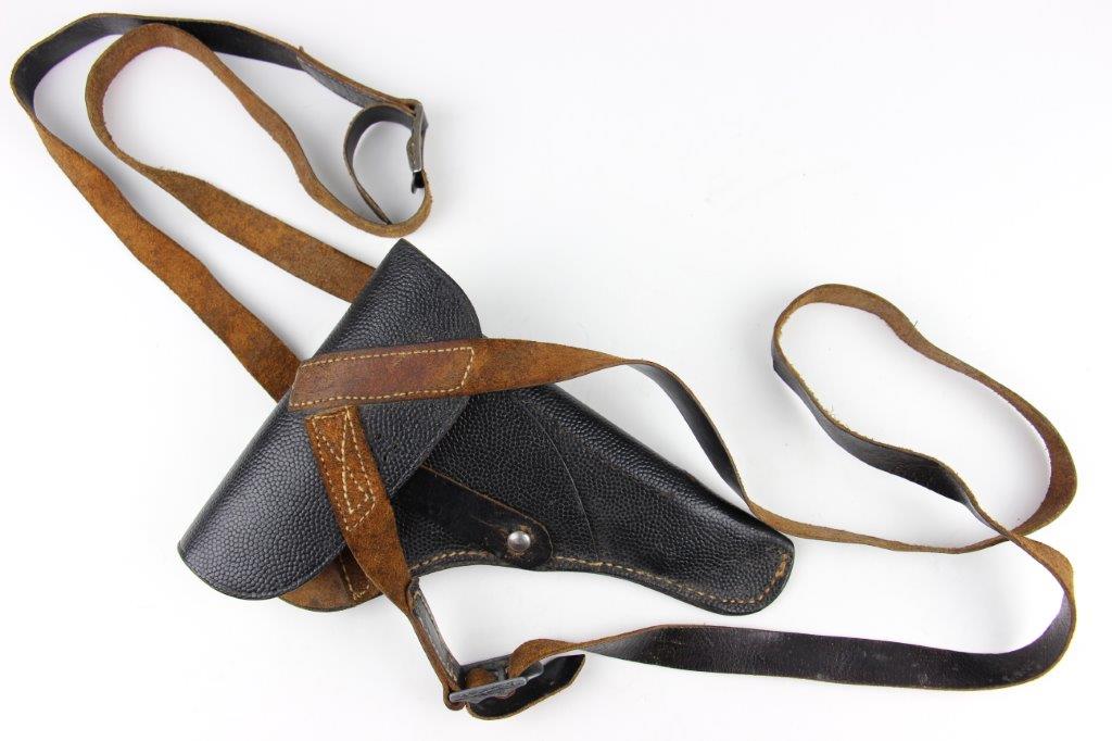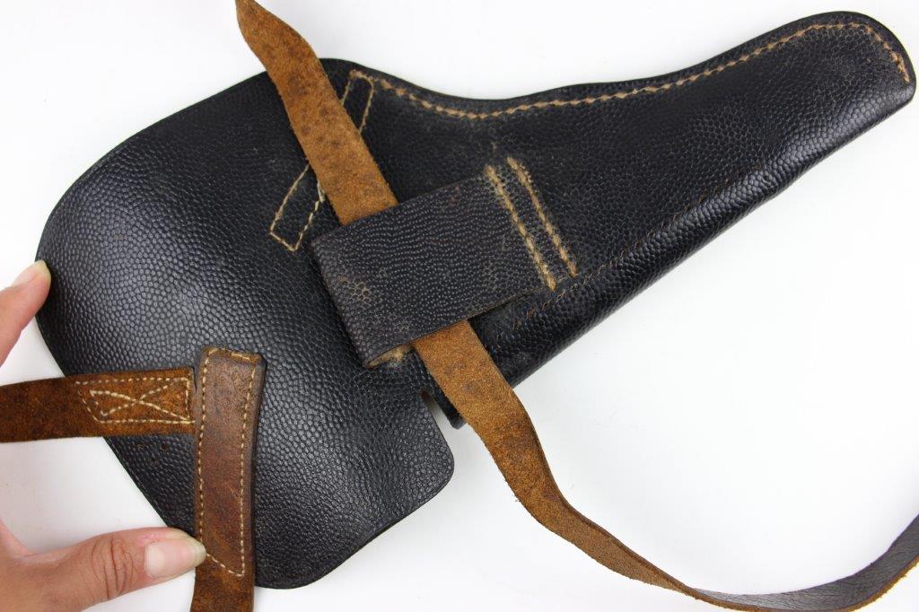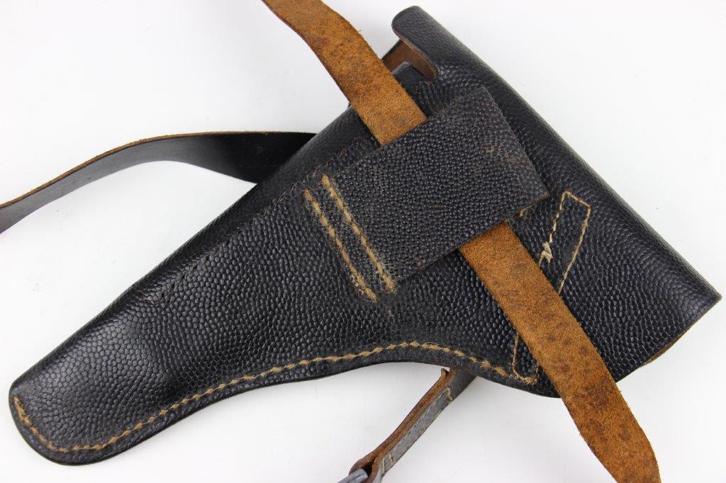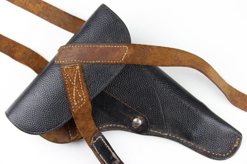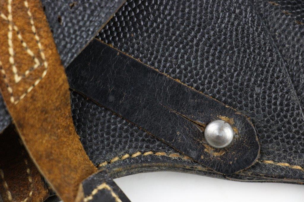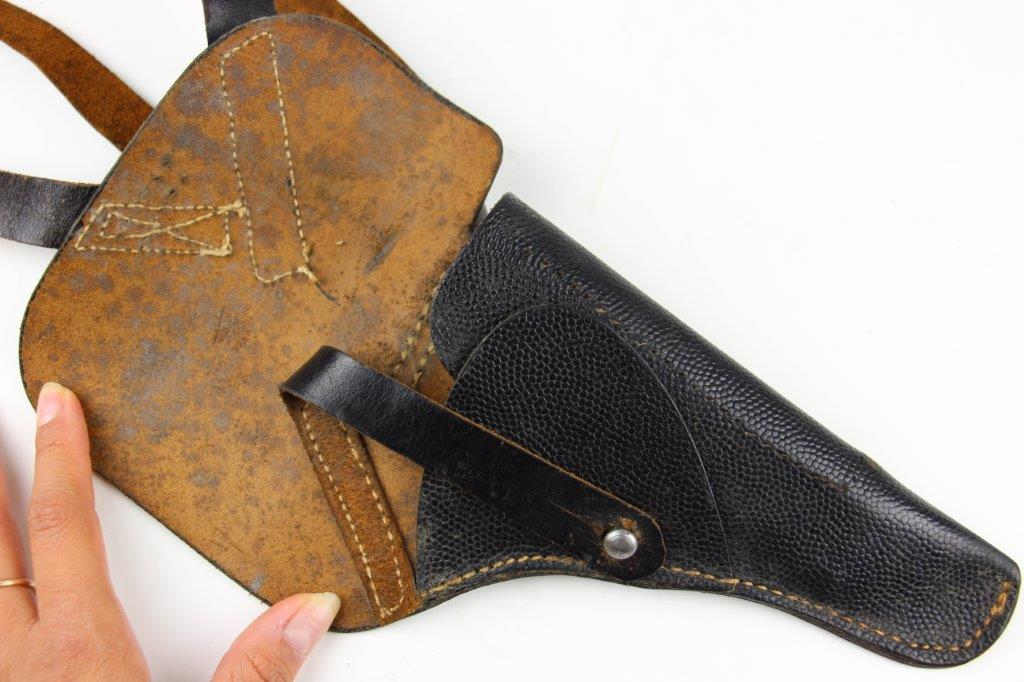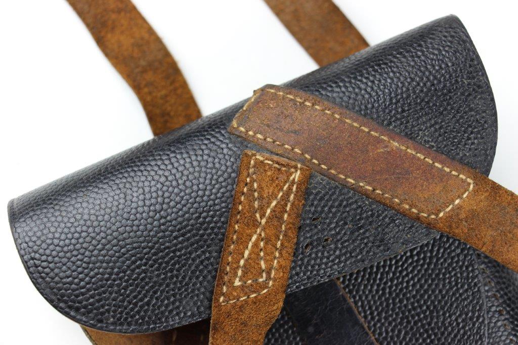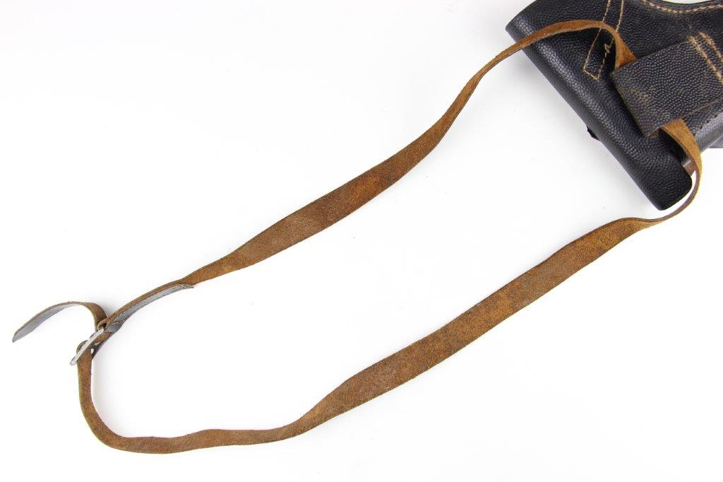 8/12/24 – This is a WW2 FN M1922 holster that was modified post-factory with added shoulder straps, an added closure strap (on the interior leather), and a removed magazine pouch. Despite these modifications, the holster is still in great overall condition with visible factory-original markings. There’s a visible waffen WaA279, and slightly visible maker and date stamp, “dtv 4” by C.O. Gehrckens. The pebble grain leather has normal pliability and light use wear. The shoulder straps and added closure strap appear to be period correct, but we can’t be sure. The added straps show light age and wrinkling but are in great condition. All added stitching doesn’t fluoresce, so again this could be period correct, but we’re not sure. Price reduced accordingly.