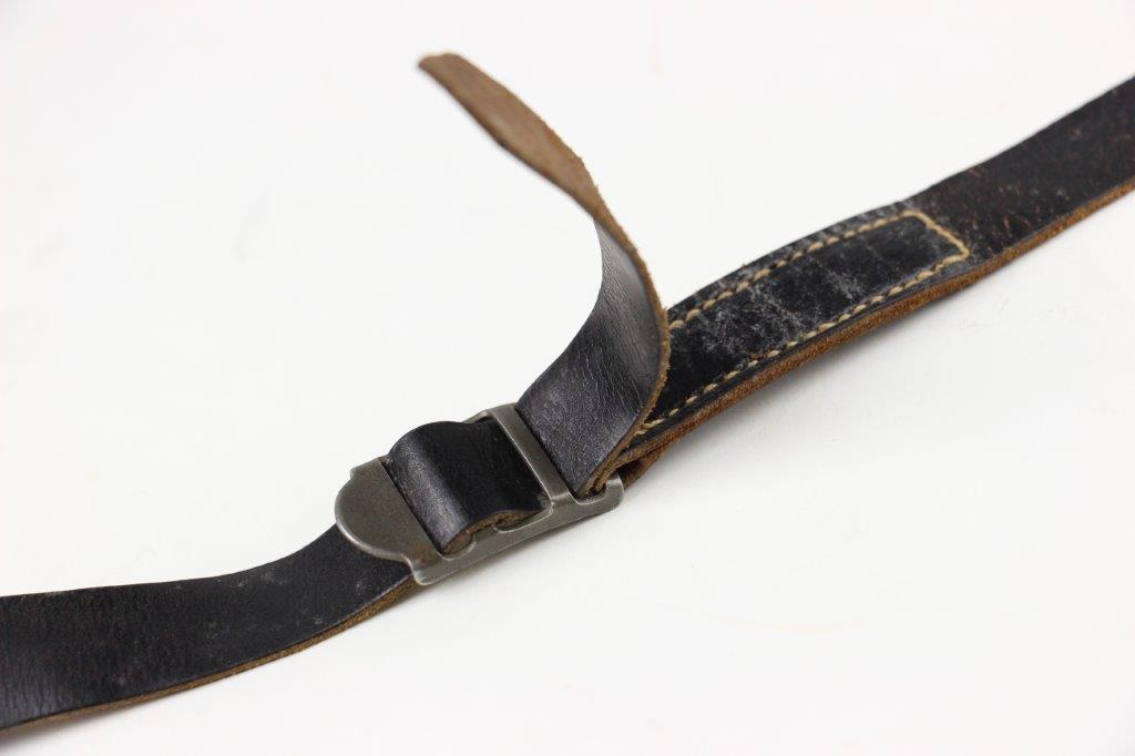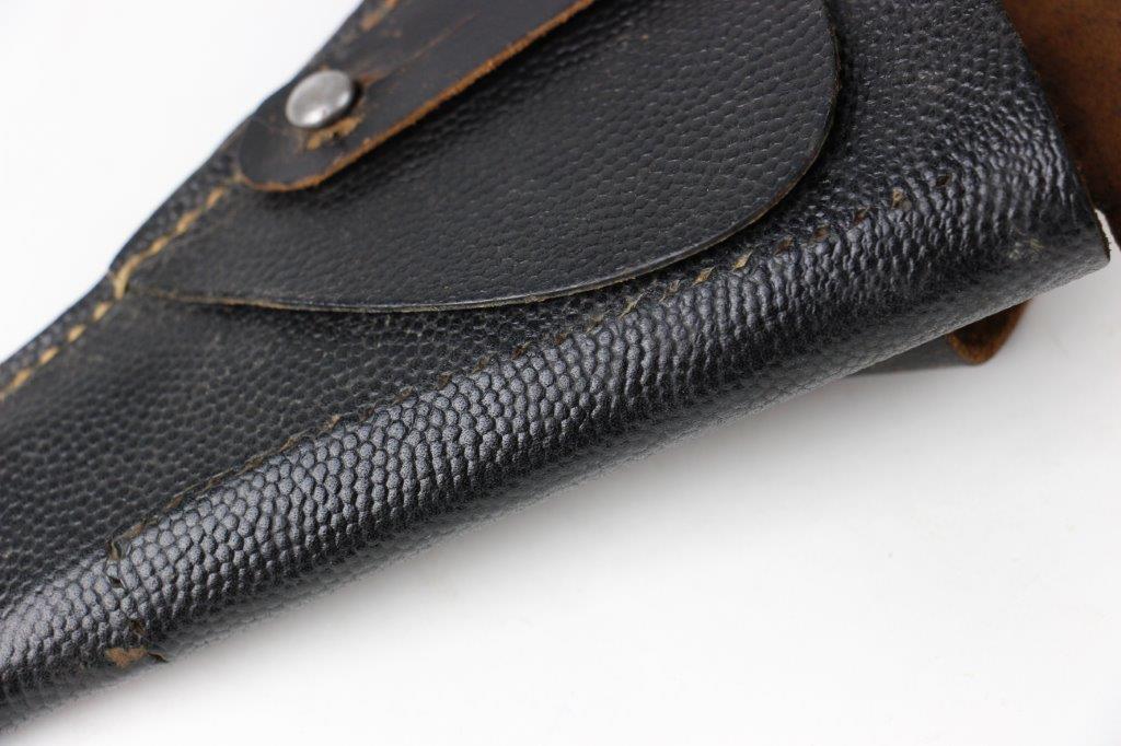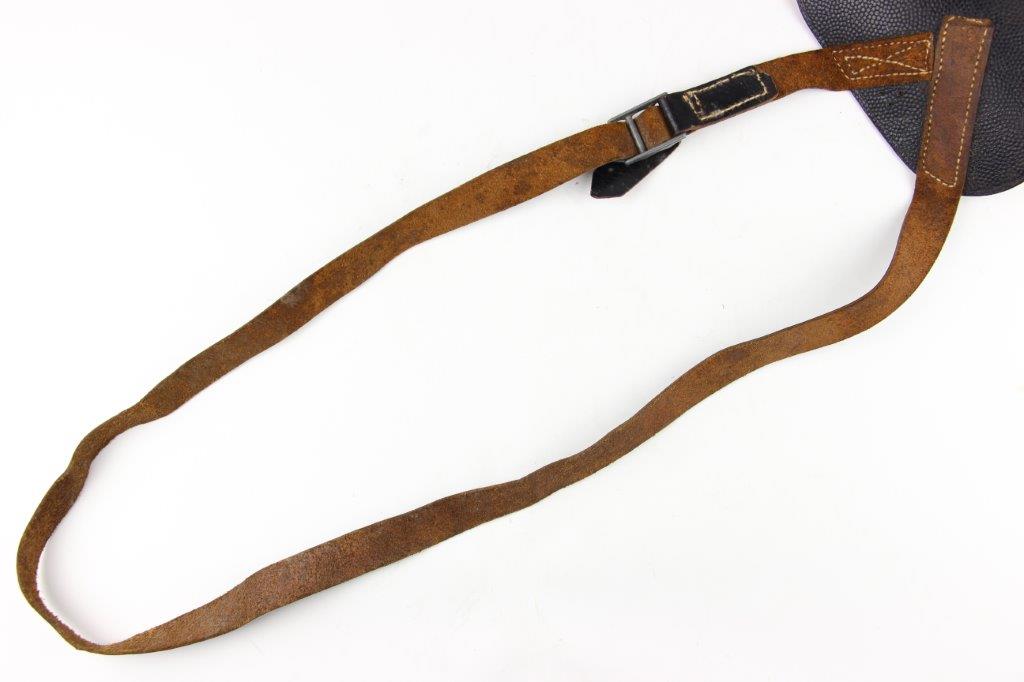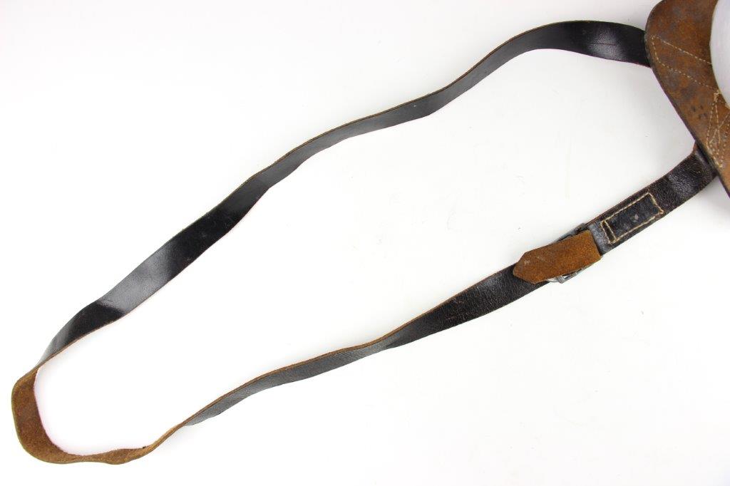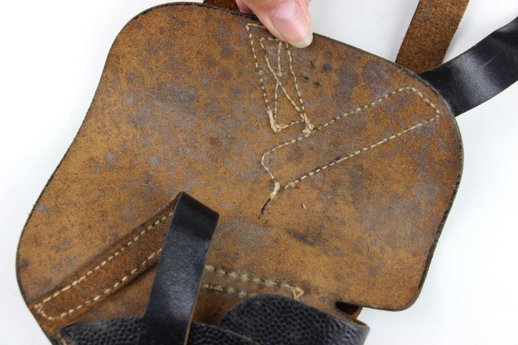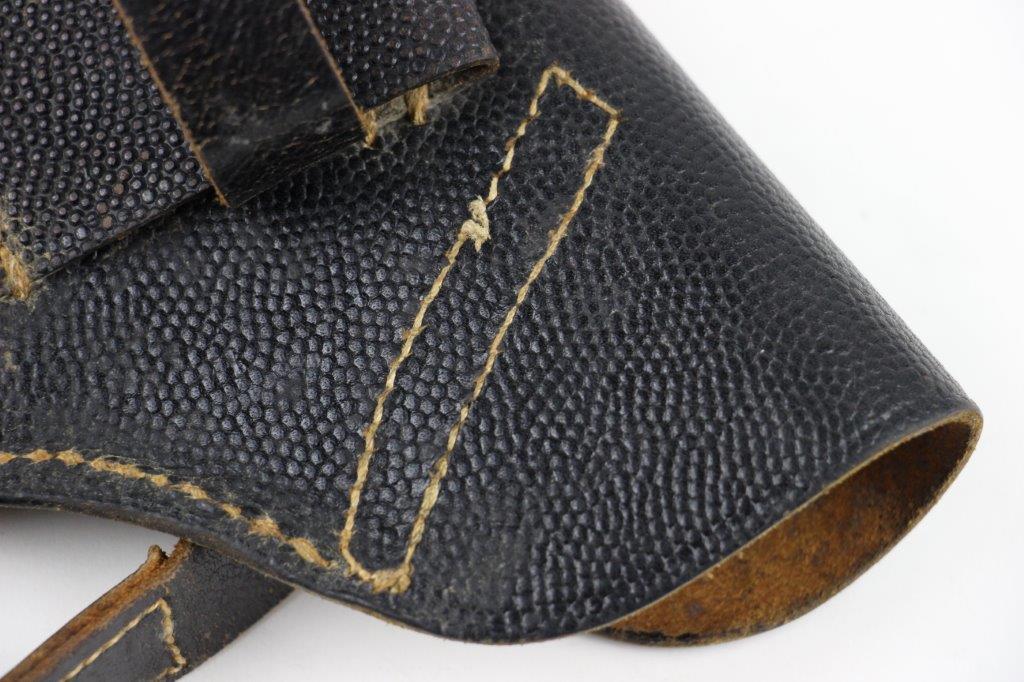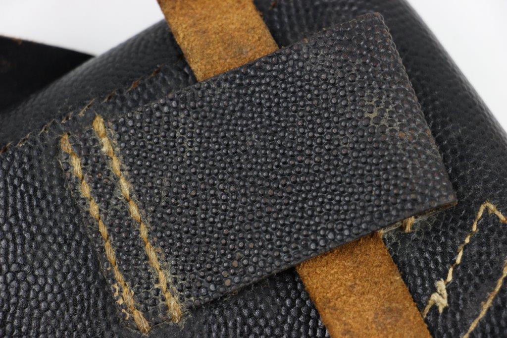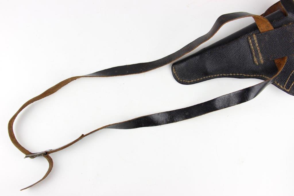 8/12/24 – This is a WW2 FN M1922 holster that was modified post-factory with added shoulder straps, an added closure strap (on the interior leather), and a removed magazine pouch. Despite these modifications, the holster is still in great overall condition with visible factory-original markings. There’s a visible waffen WaA279, and slightly visible maker and date stamp, “dtv 4” by C.O. Gehrckens. The pebble grain leather has normal pliability and light use wear. The shoulder straps and added closure strap appear to be period correct, but we can’t be sure. The added straps show light age and wrinkling but are in great condition. All added stitching doesn’t fluoresce, so again this could be period correct, but we’re not sure. Price reduced accordingly.