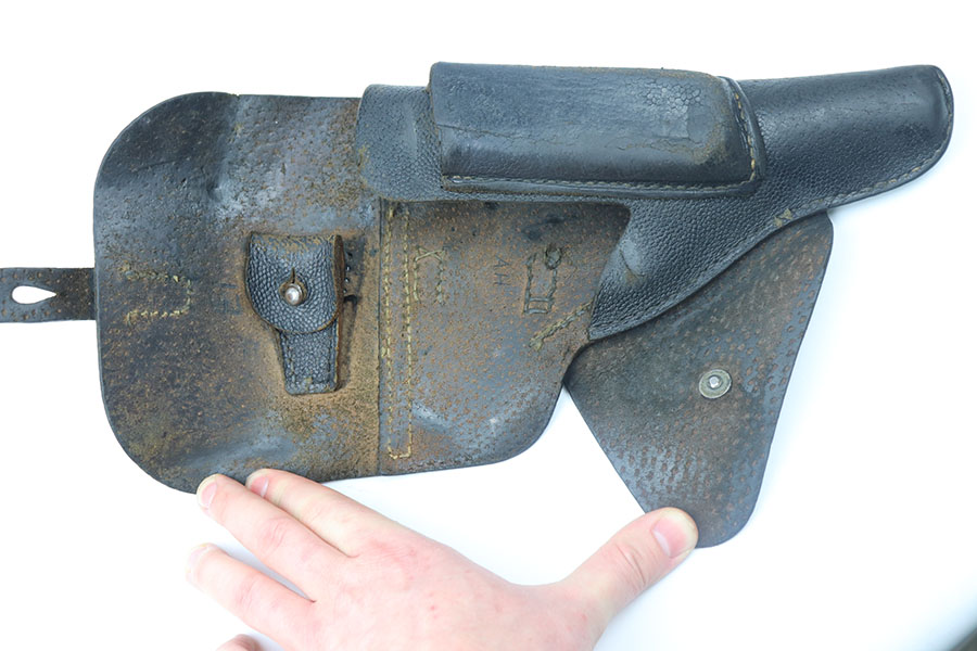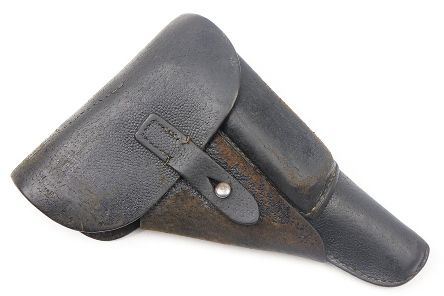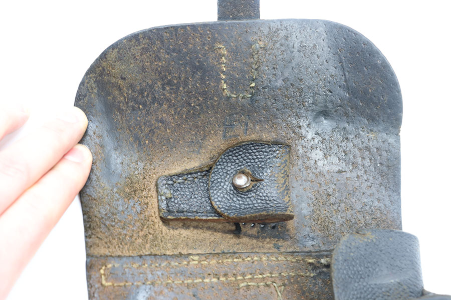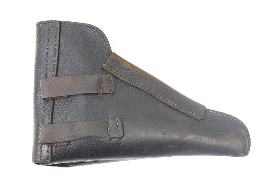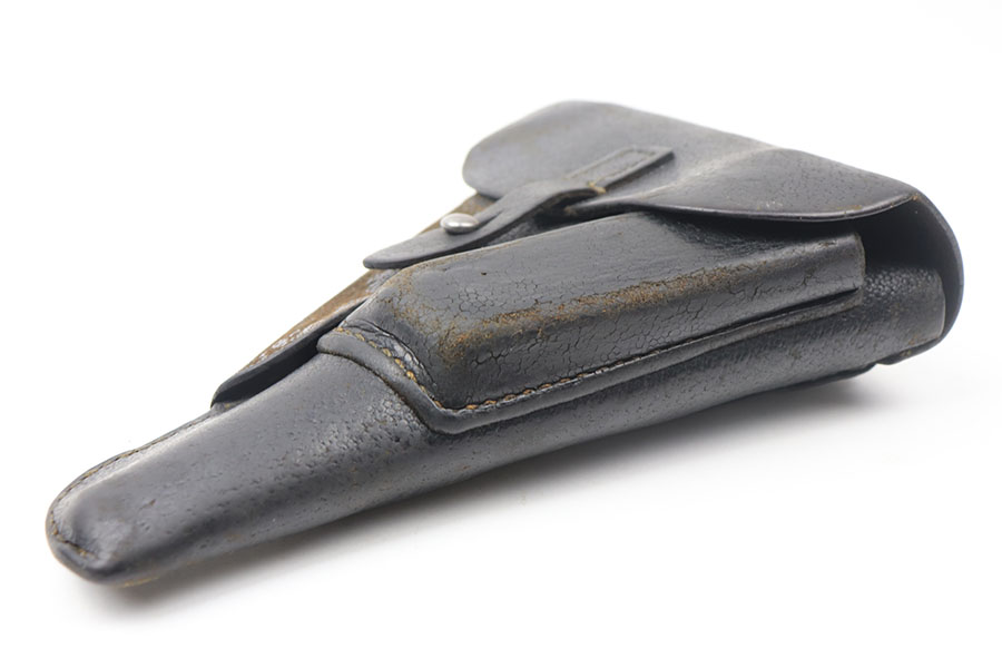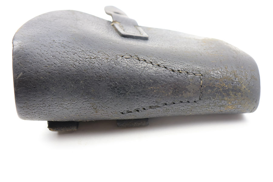6/14/21 – This is a late WW2 production High Power holster with pigskin style leather. The holster appears to have been modified with an interior pouch for a luger tool. So perhaps someone tried to convert this high power holster for use with a luger. The leather has some surface scuffing and signs of use / aging. Completely intact leather and stitching.