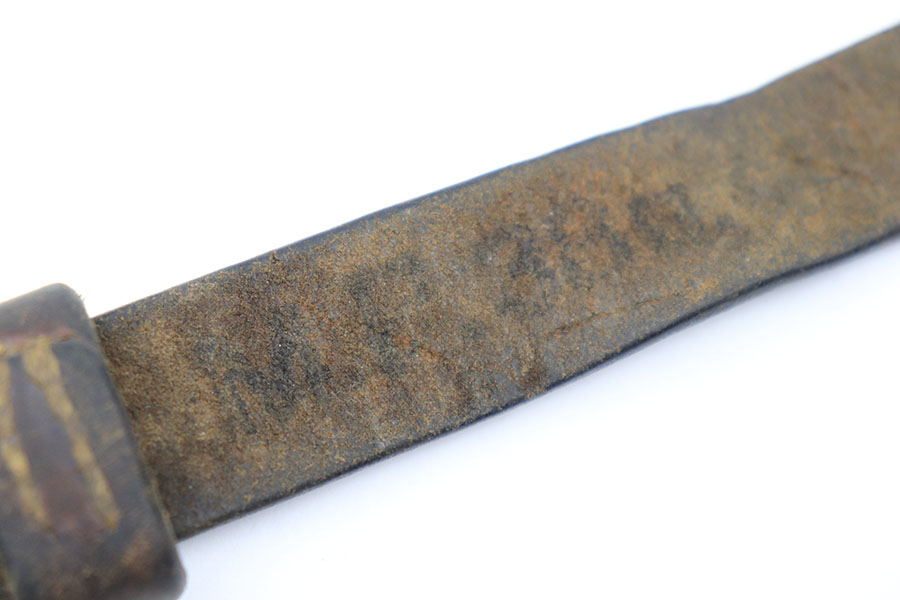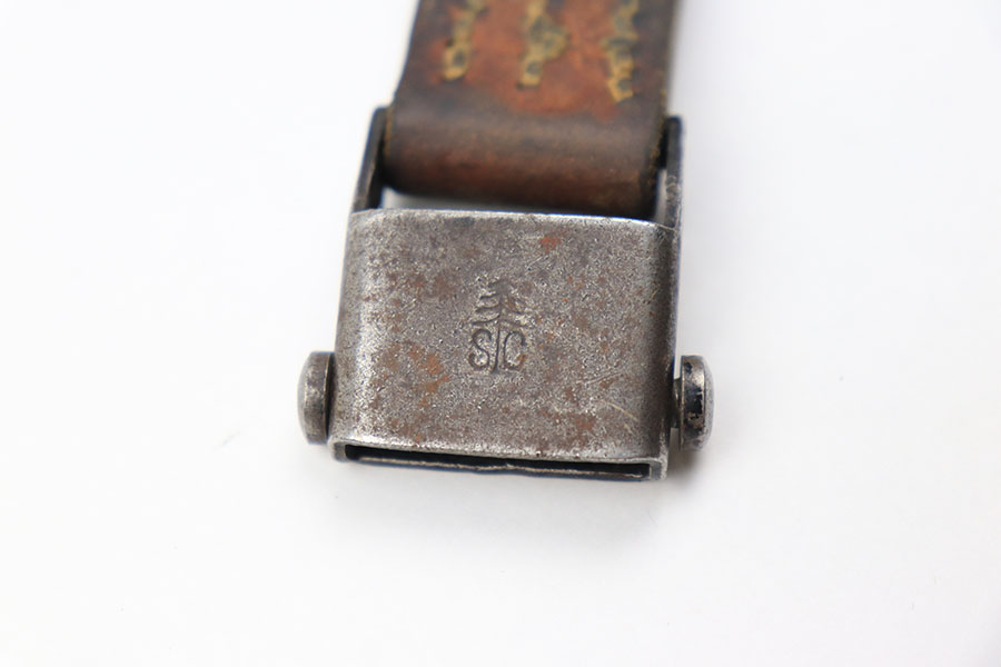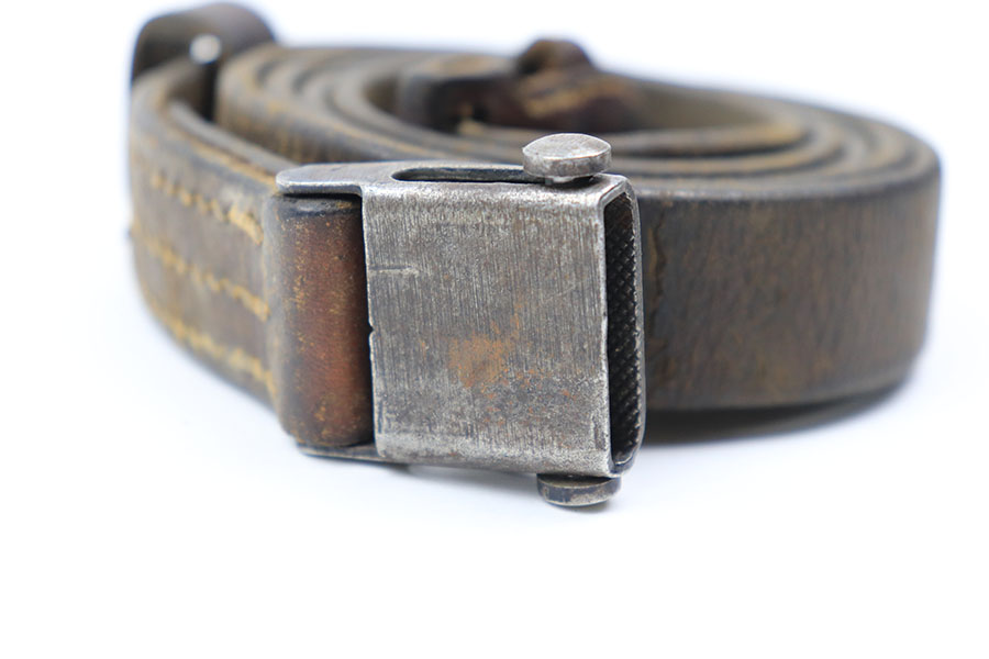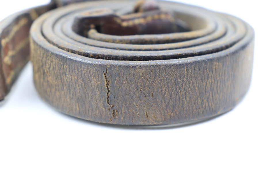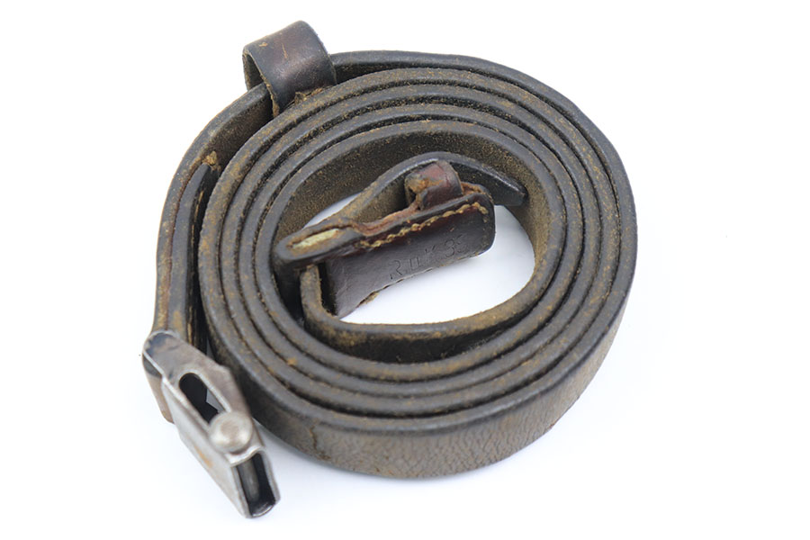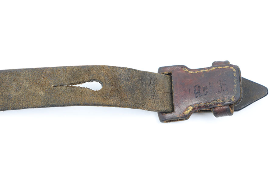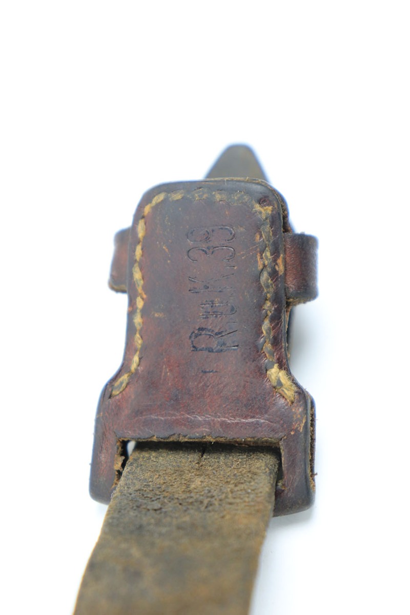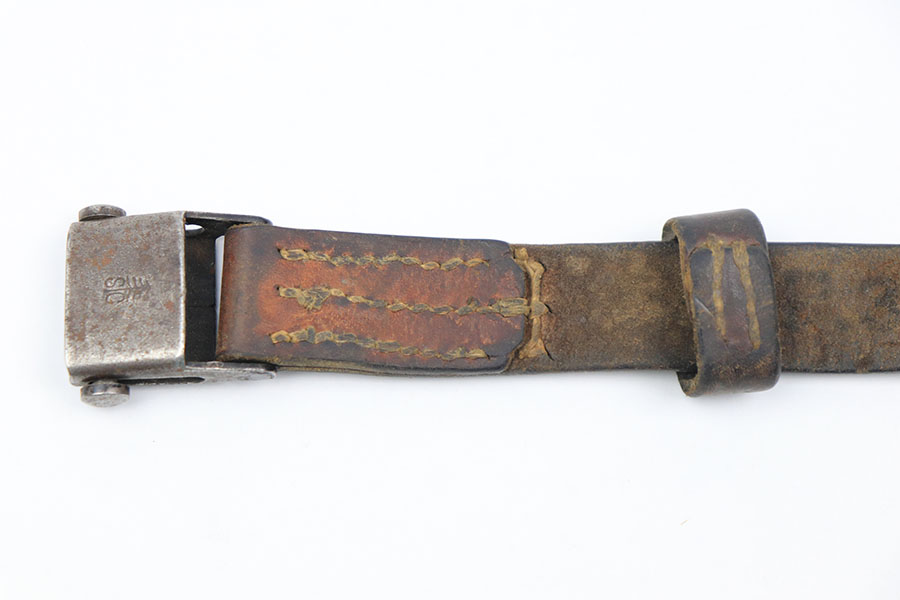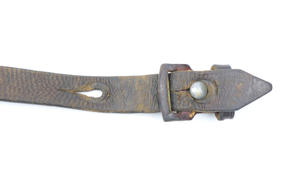 12/20/21 – This is an original WW2 MP 38 / MP 40 submachine gun sling. The sling is about 47 inches long and has two keeper holes on one end. Comes with a leather keeper as shown. The interior of the sling has a faint MP 38 ink stamp near one end. The stitching is original and in tact. The leather has some mild surface wear but is also in tact.