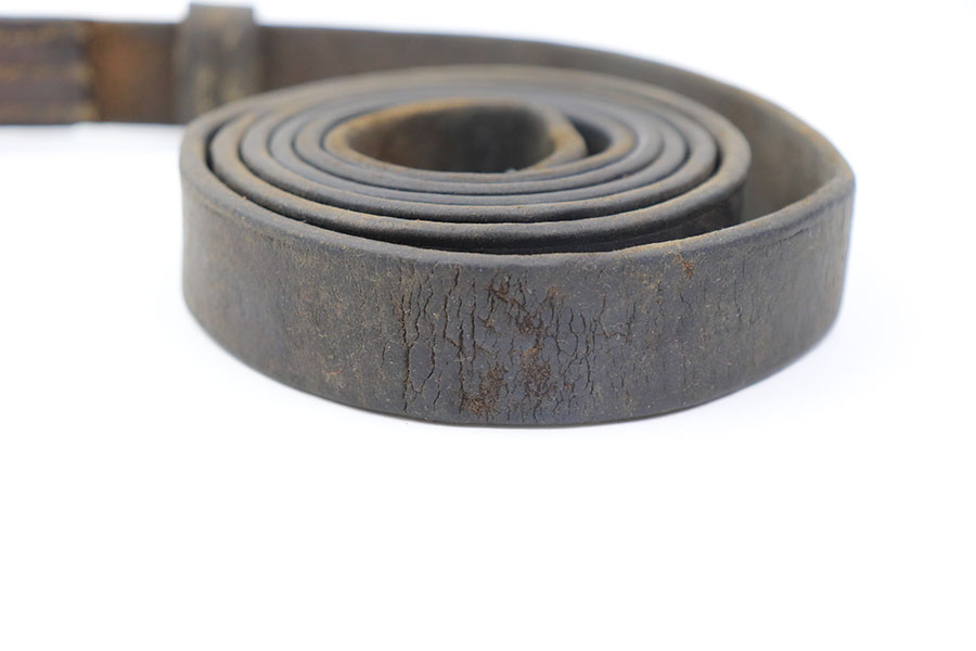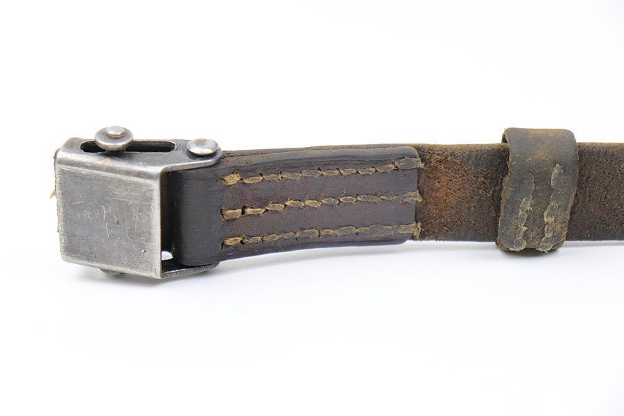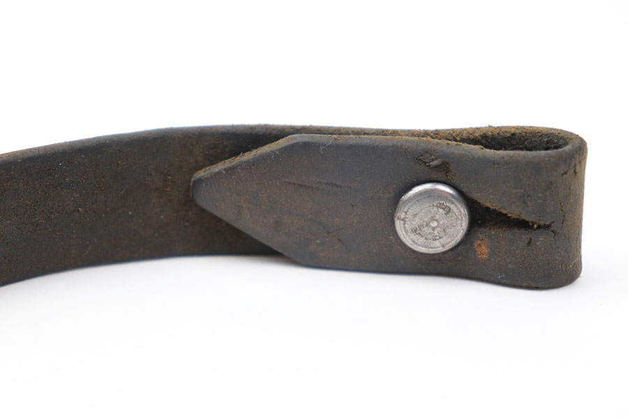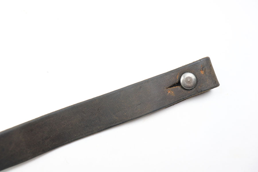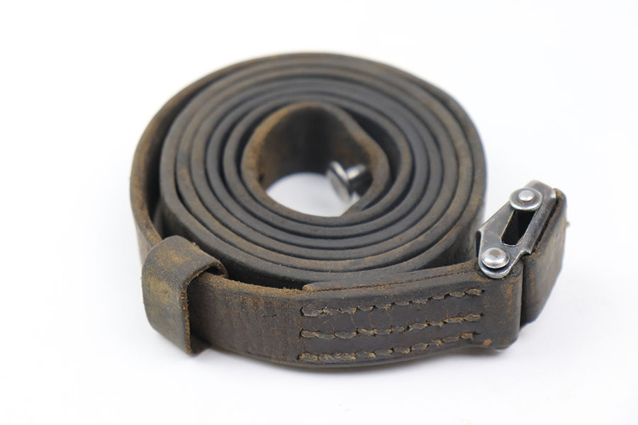 11/29/21 – This is a leather sling for a K98 or similar rifle. Also compatible for the MP 40 submachine gun, as the sling only has two holes on one end. No keeper included. The sling is unmarked and measures 54 inches long. There’s mild surface wear throughout but no major cracks or issues.