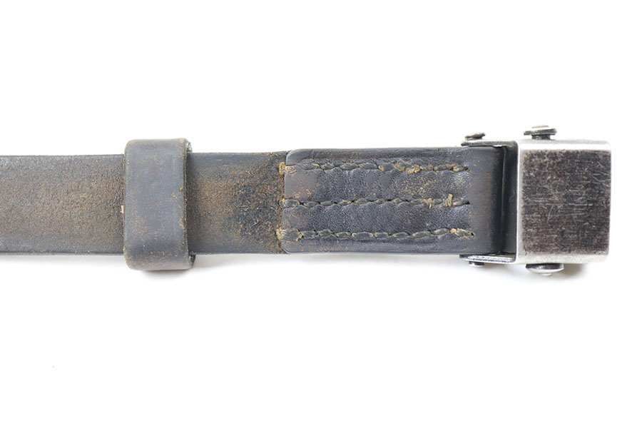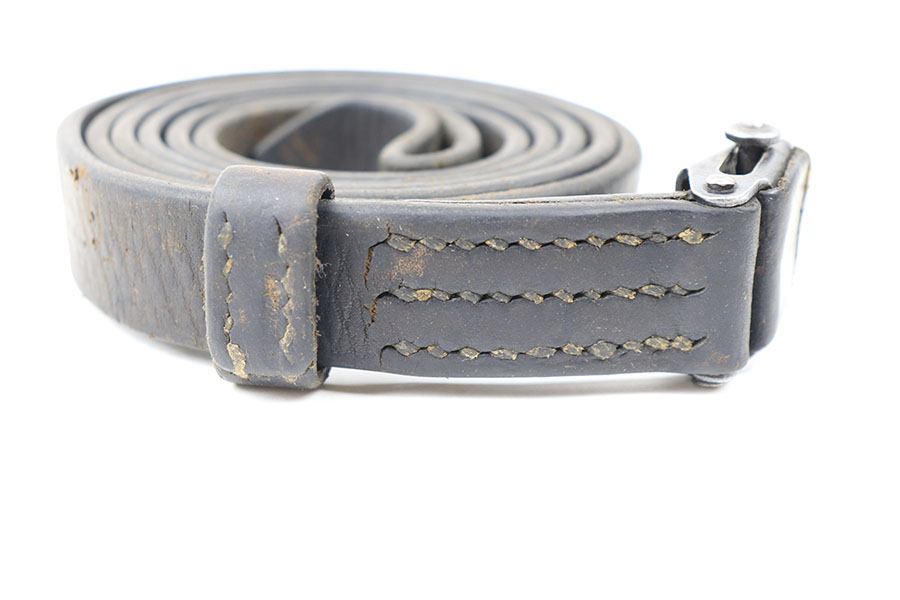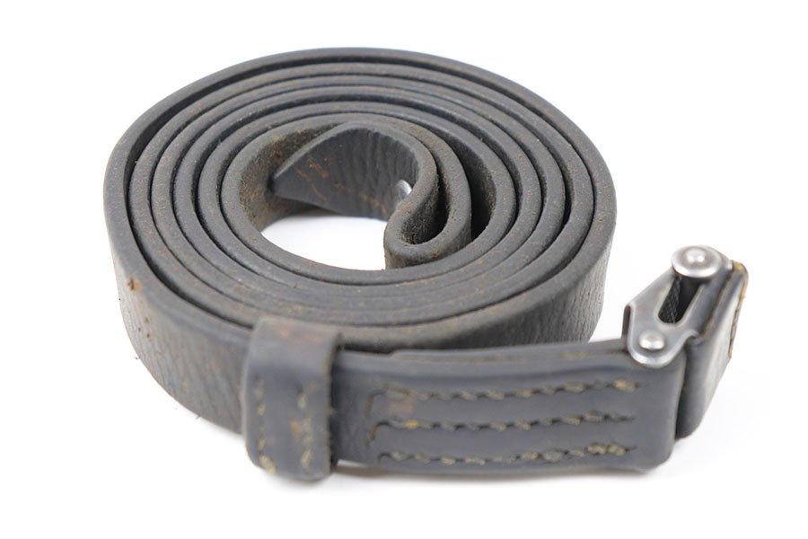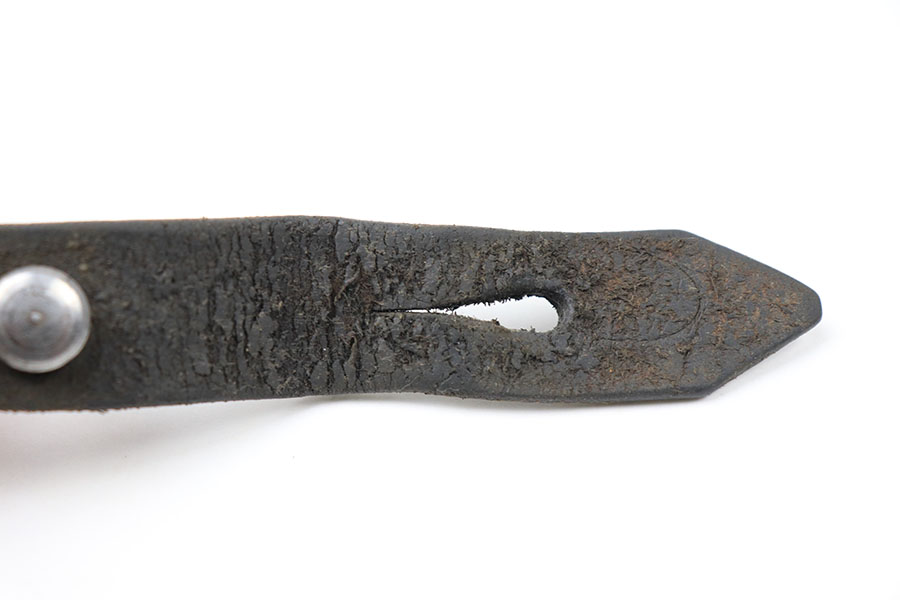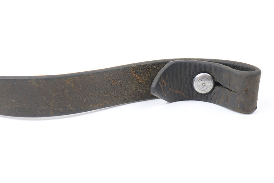 8/18/21 – This is a rare MP 40 leather sling from WW2. The sling is 56 inches long and has two holes on the end, which is iconic of the MP 40 slings. There also appears to be a faint maker stamp on the interior leather of this end, but we can’t decipher what it says. The leather has some typical signs of aging and mild wear but no major cracks or issues.