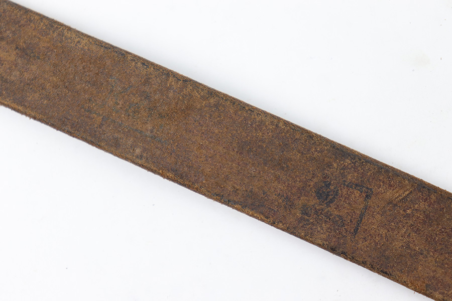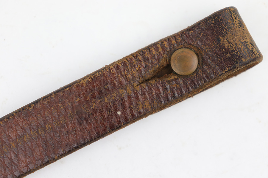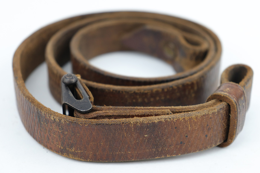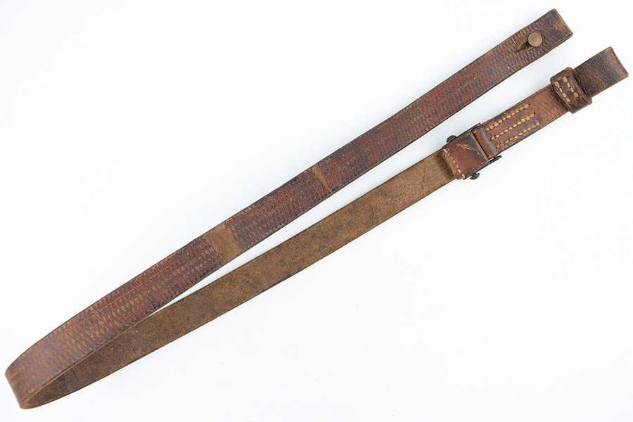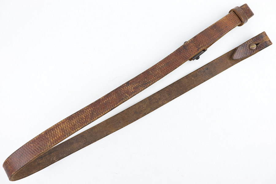 3/28/23 – This is an original WW2 leather sling for a MP.40 submachine gun. The leather is unmarked and in great overall condition with some natural aging and surface wear but no cracks or significant damage. The fastening knob on one end is non-magnetic brass and the other end with metal adjustment loop is steel (and blued). Measures about 112cm long when laid flat.
