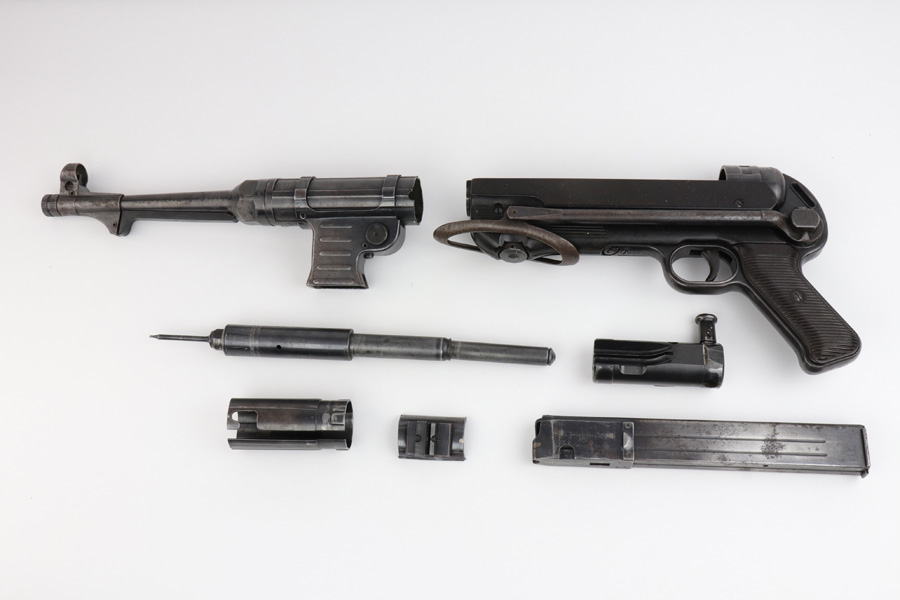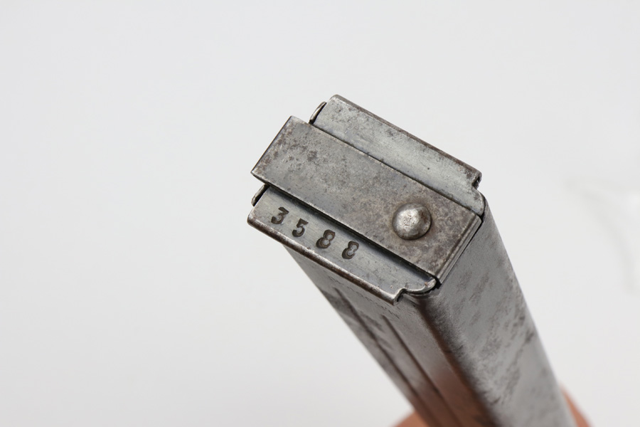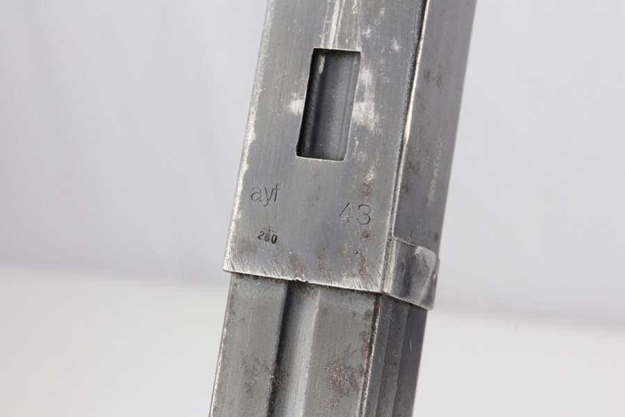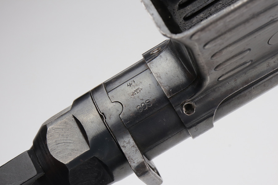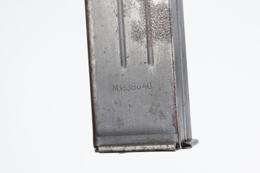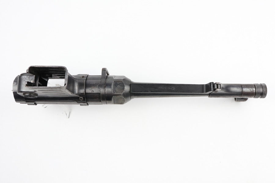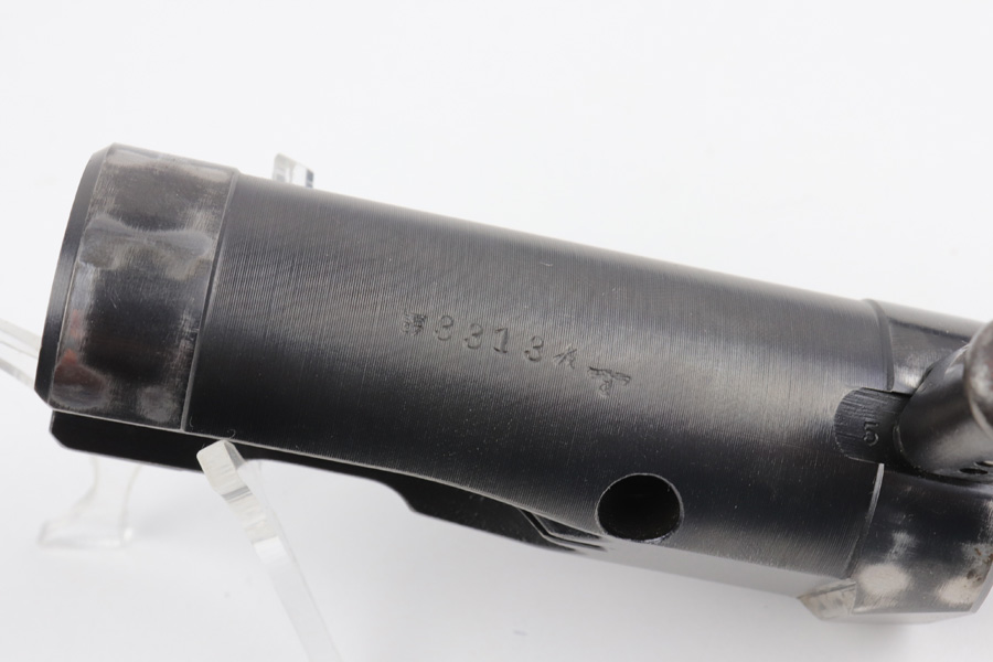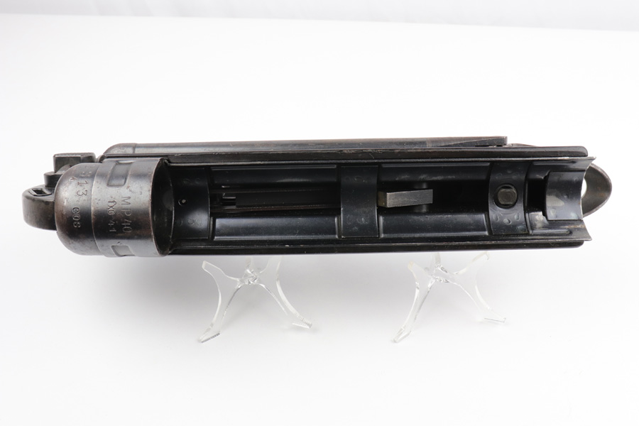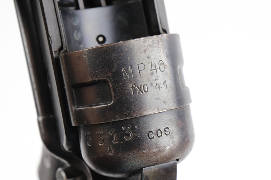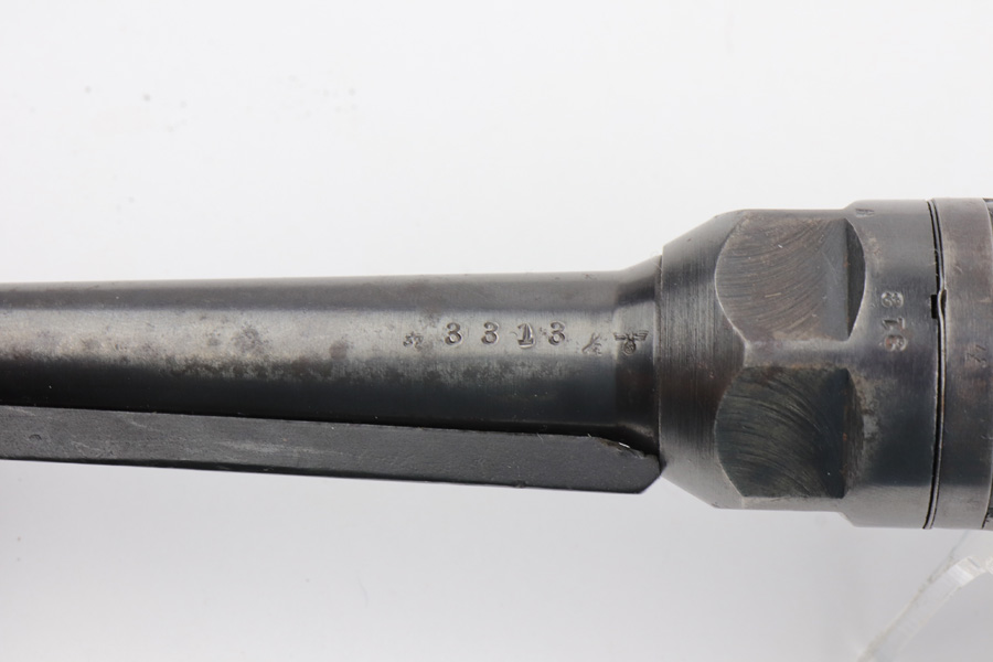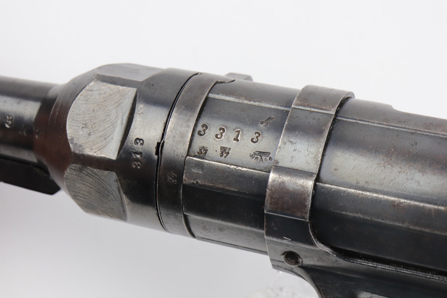 7/10/19 – This is an all original WW2 era MP 40 parts kit. The numbered parts are all matching and original, except for the firing pin (but these were commonly replaced during WW2). The receiver has been cut but all pieces shown are included. The biggest issue with this kit is that someone tried to weld the barrel shut, and then it appears someone else tried to punch through that weld. The result is a small hole so we can see down the barrel, but not big enough to let a round pass through. The parts are in very nice condition with normal aging and patina throughout the metal. The bore has strong rifling but there’s patina and some minor residue. All parts shown are included.