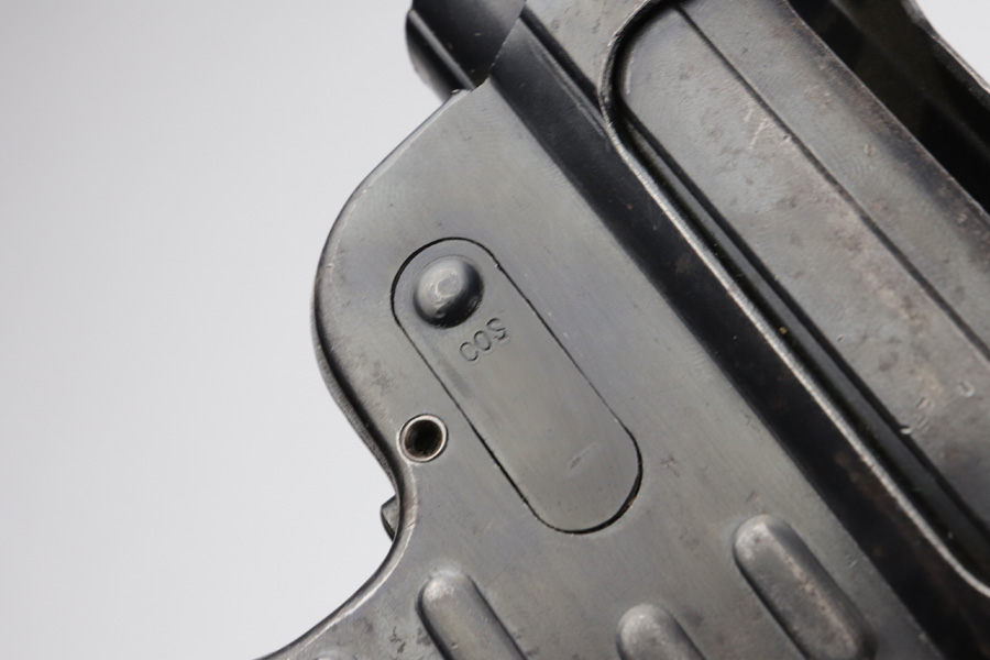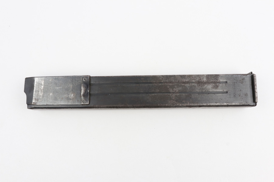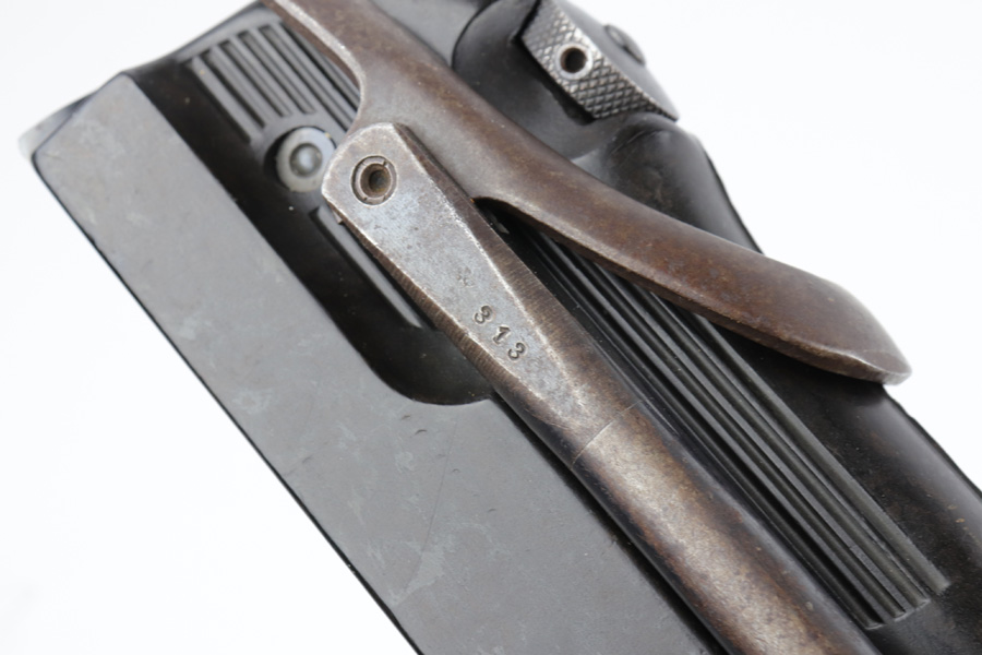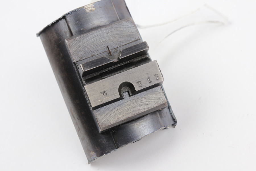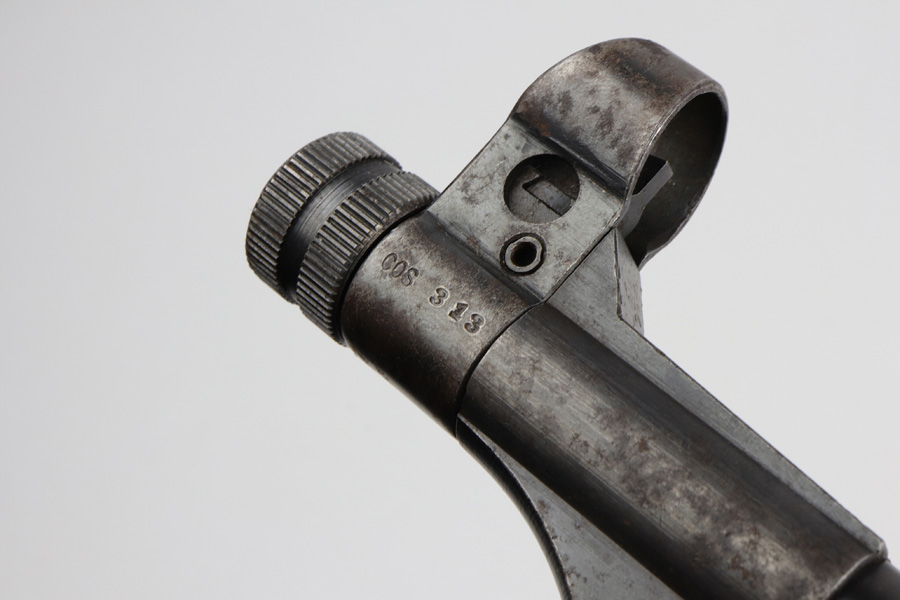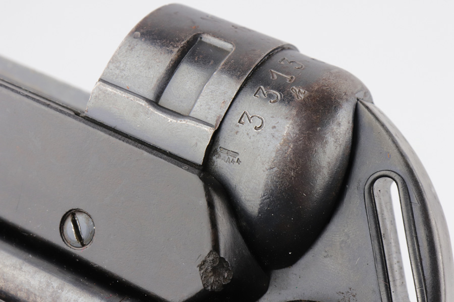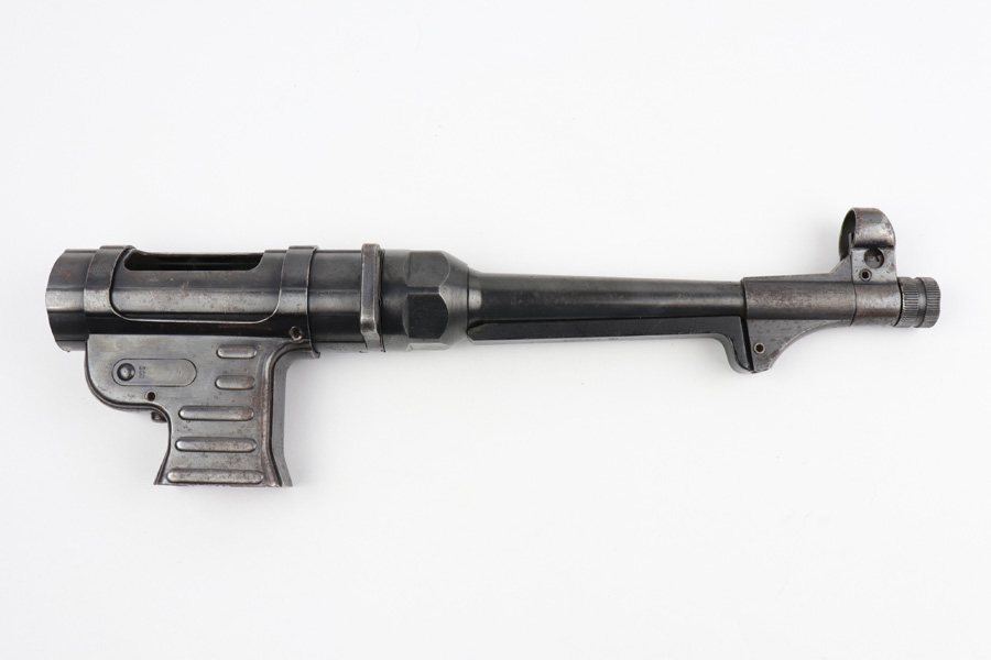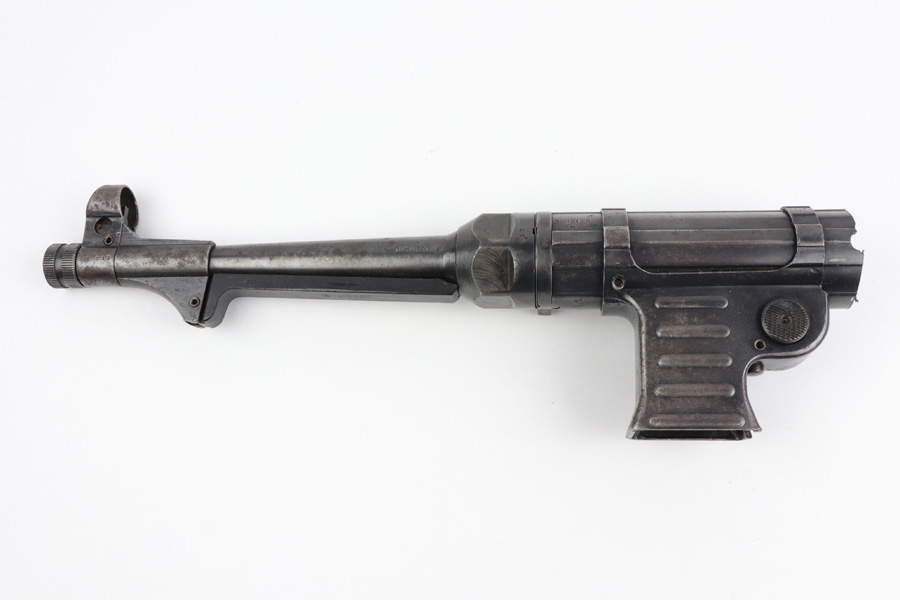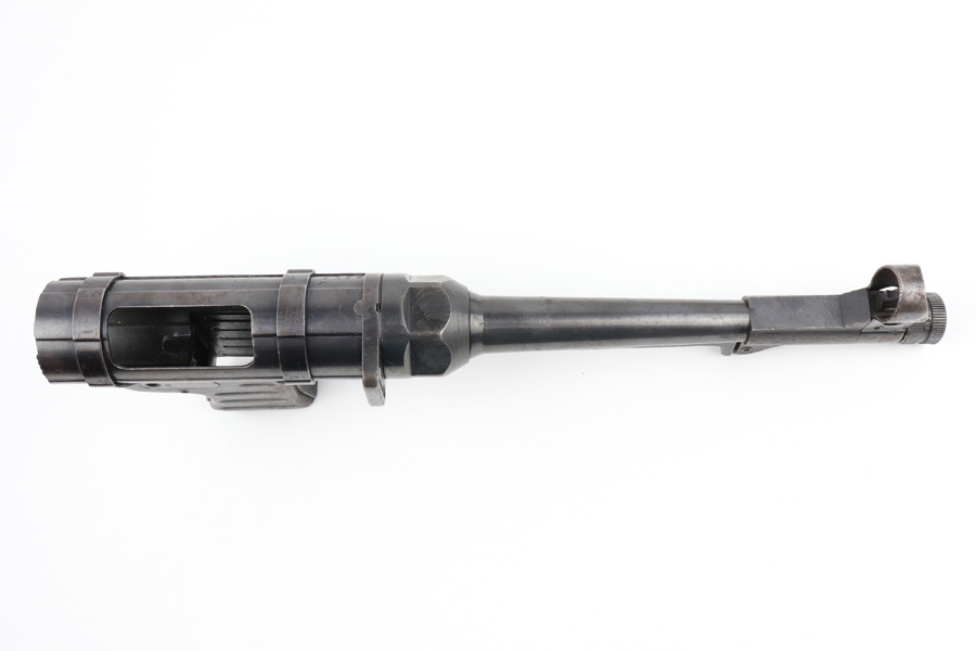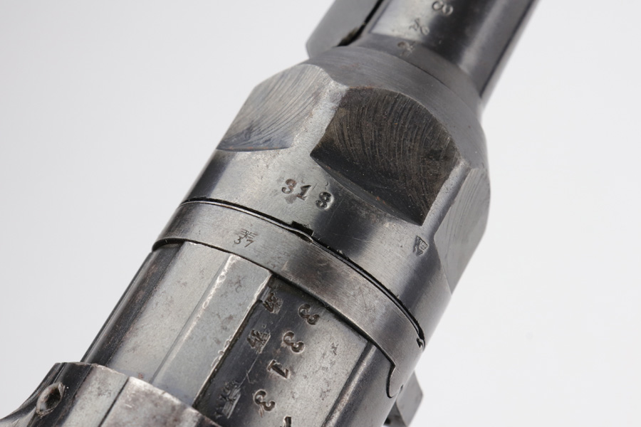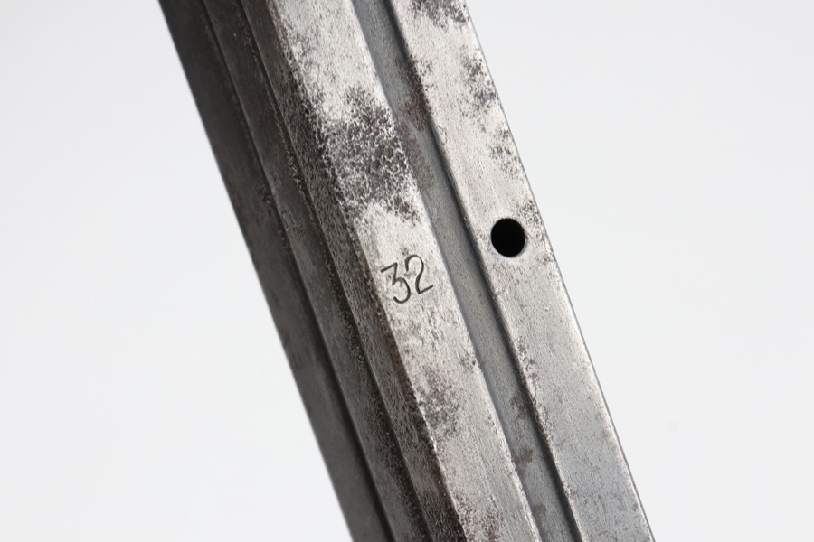 7/10/19 – This is an all original WW2 era MP 40 parts kit. The numbered parts are all matching and original, except for the firing pin (but these were commonly replaced during WW2). The receiver has been cut but all pieces shown are included. The biggest issue with this kit is that someone tried to weld the barrel shut, and then it appears someone else tried to punch through that weld. The result is a small hole so we can see down the barrel, but not big enough to let a round pass through. The parts are in very nice condition with normal aging and patina throughout the metal. The bore has strong rifling but there’s patina and some minor residue. All parts shown are included.