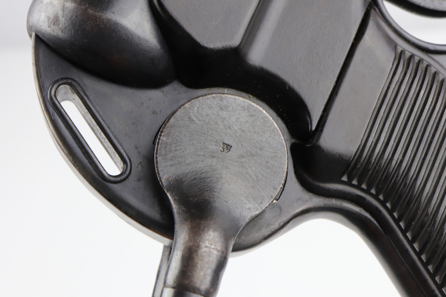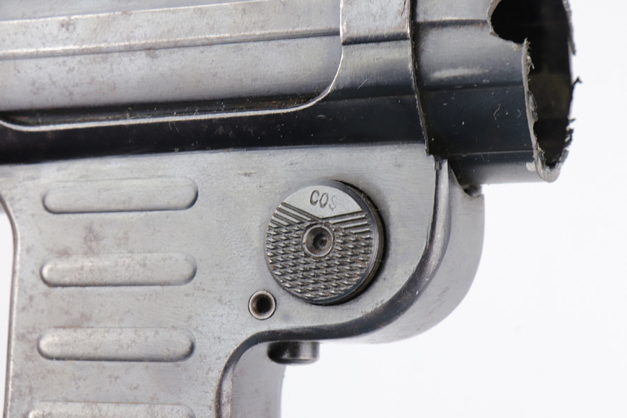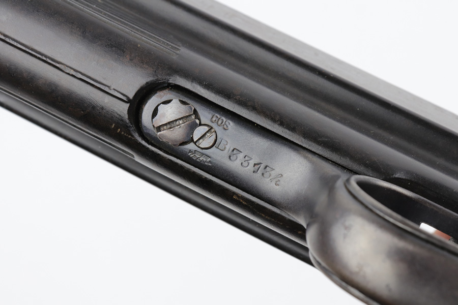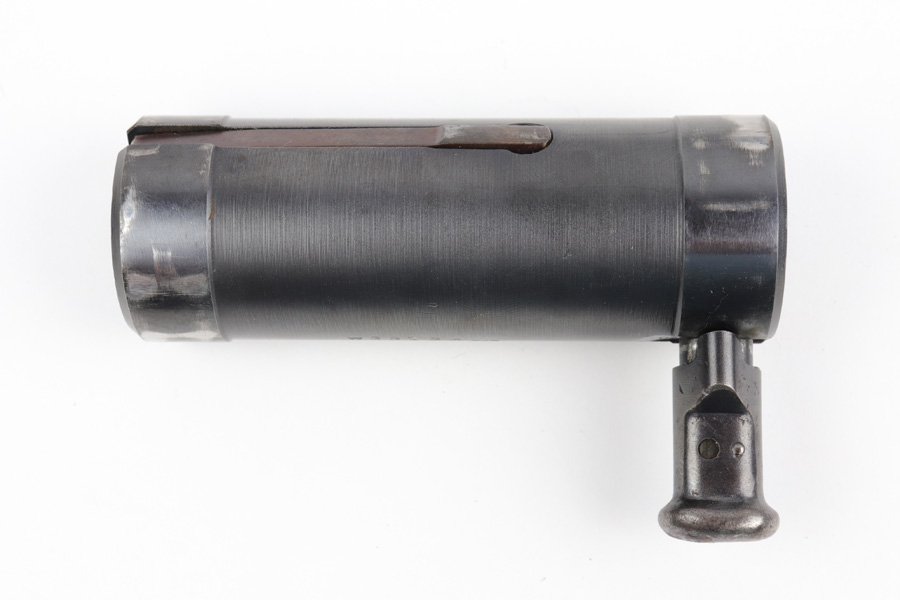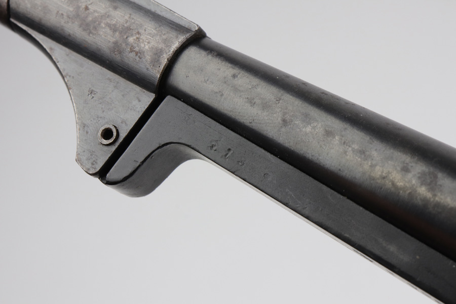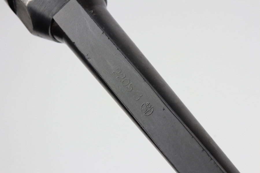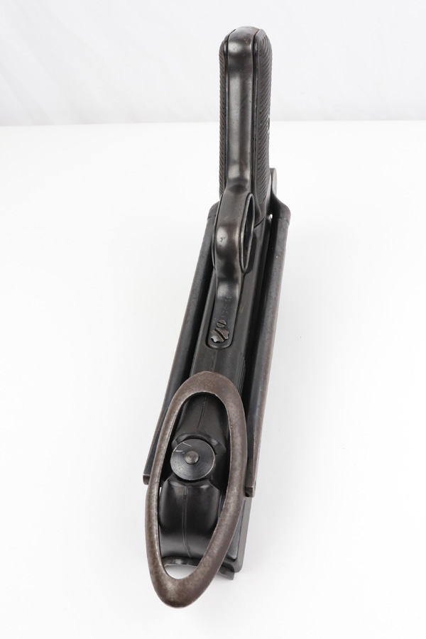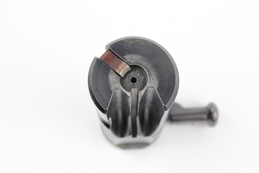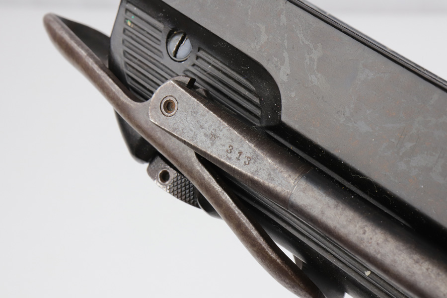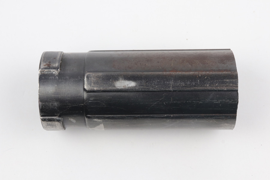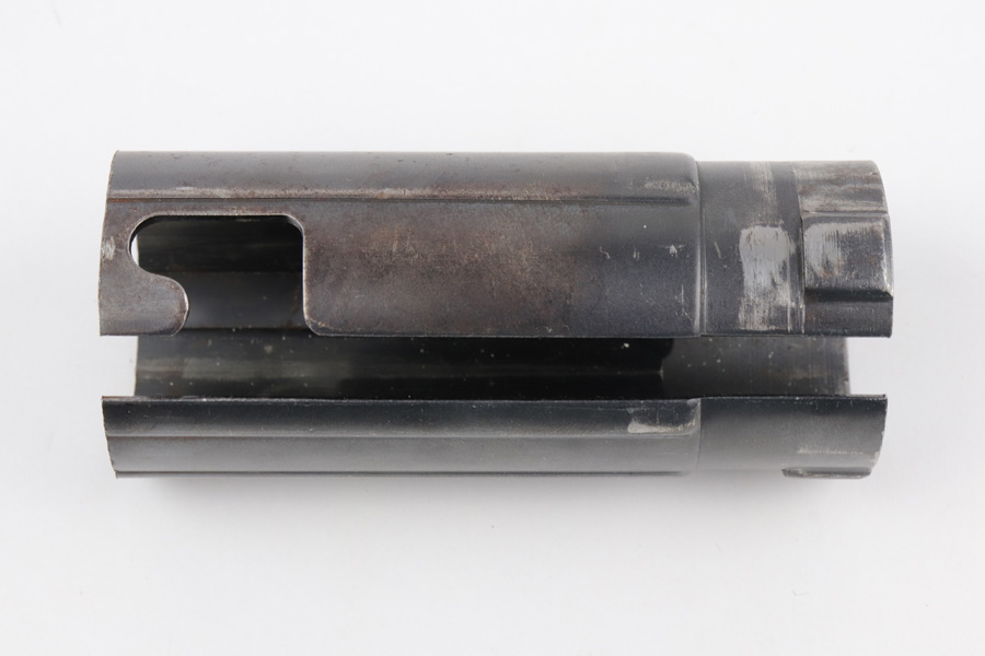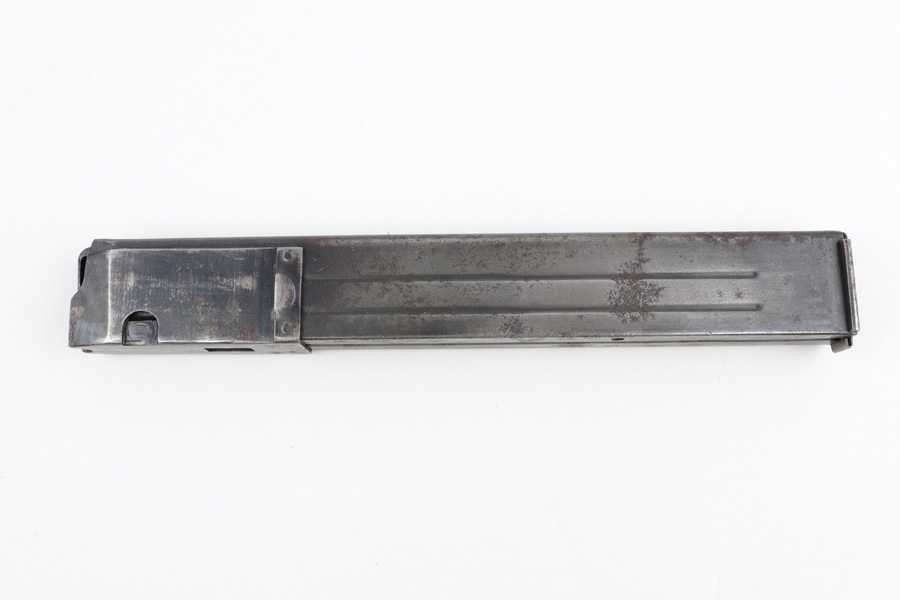 7/10/19 – This is an all original WW2 era MP 40 parts kit. The numbered parts are all matching and original, except for the firing pin (but these were commonly replaced during WW2). The receiver has been cut but all pieces shown are included. The biggest issue with this kit is that someone tried to weld the barrel shut, and then it appears someone else tried to punch through that weld. The result is a small hole so we can see down the barrel, but not big enough to let a round pass through. The parts are in very nice condition with normal aging and patina throughout the metal. The bore has strong rifling but there’s patina and some minor residue. All parts shown are included.