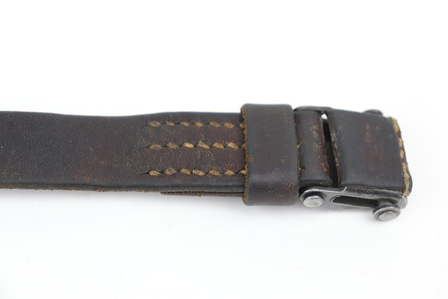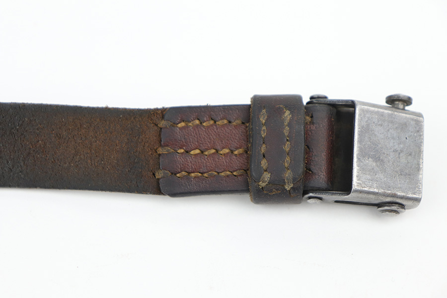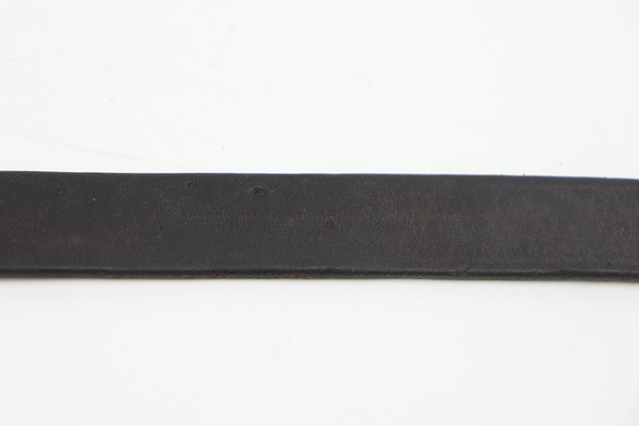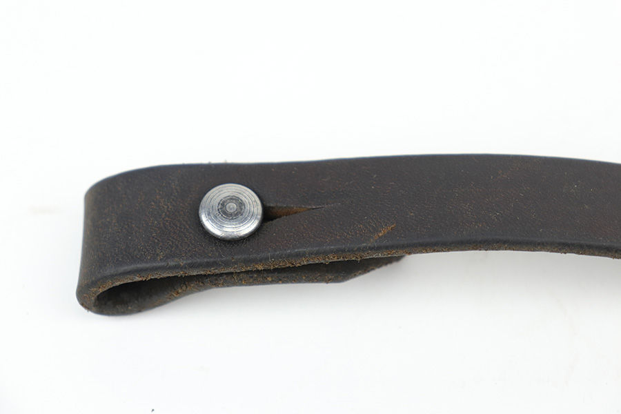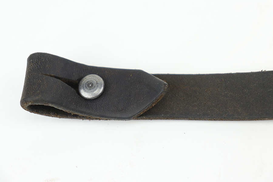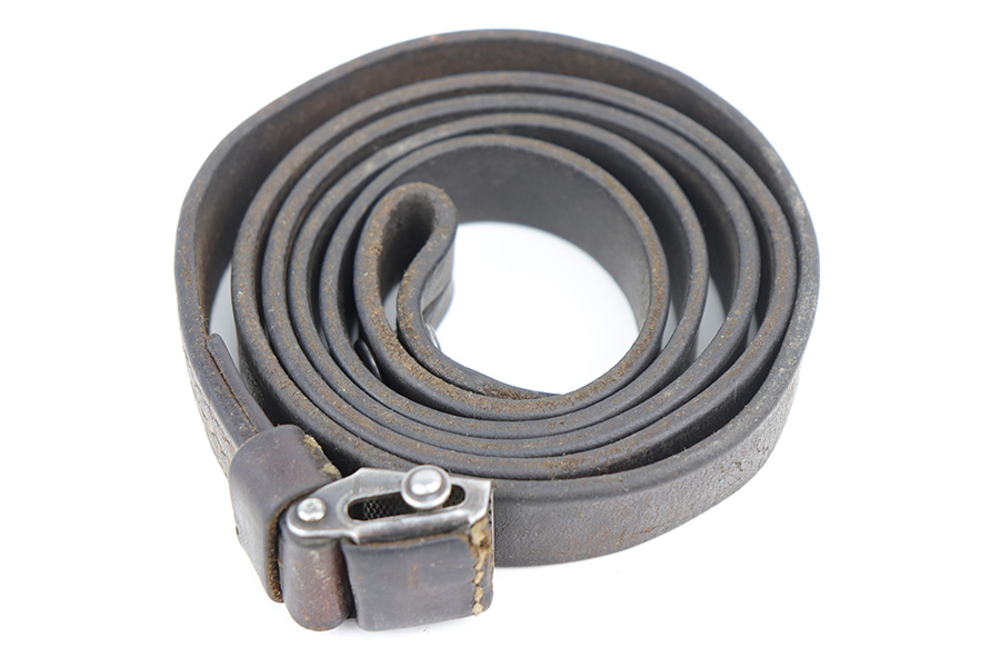 10/21/21 – This is a WW2 era leather rifle sling. We believe this sling is for the MP40 submachine gun because there are only two holes at the end of the sling, and there is no keeper. The leather shows typical signs of aging and use wear, but no excessive damage. Original stitching in tact. Measures about 56 inches long.