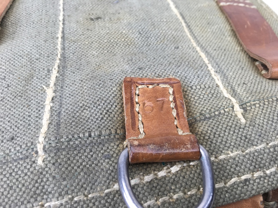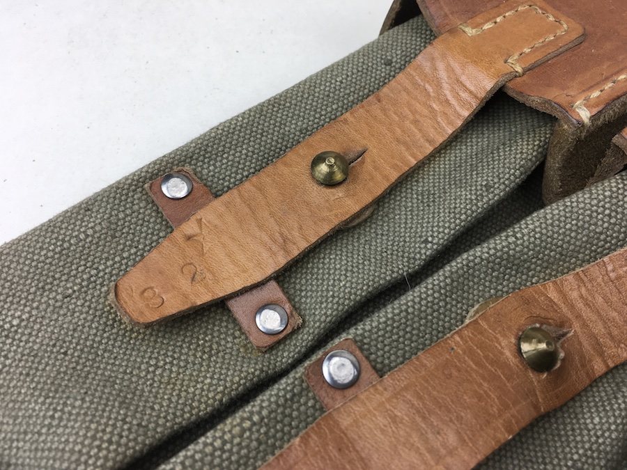 11/4/19 – These are un-dated magazine pouches for MP 44 / STG 44, 30 round Magazines. Complete set of 2, left and right. Likely Yugoslavian made during WW2. Brass closure studs. Some minor stains and use wear but completely intact with strong stitching. Several numbers are stamped at various places on the leather.
