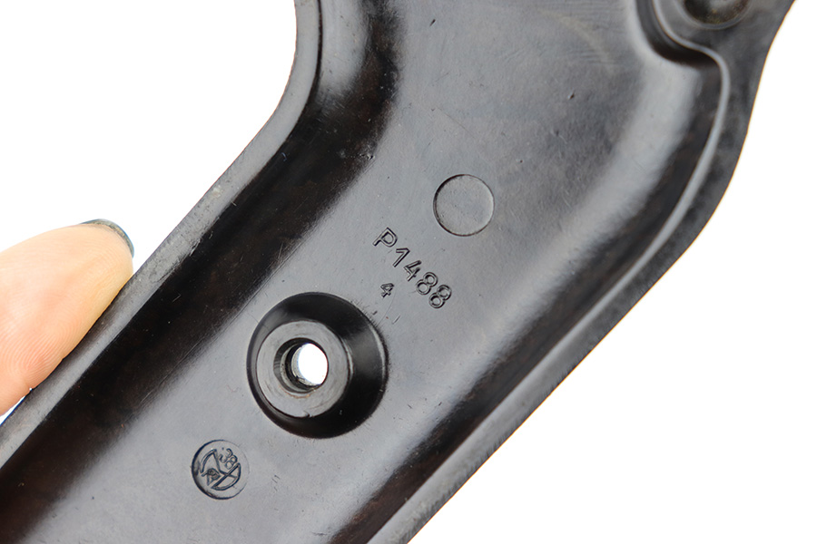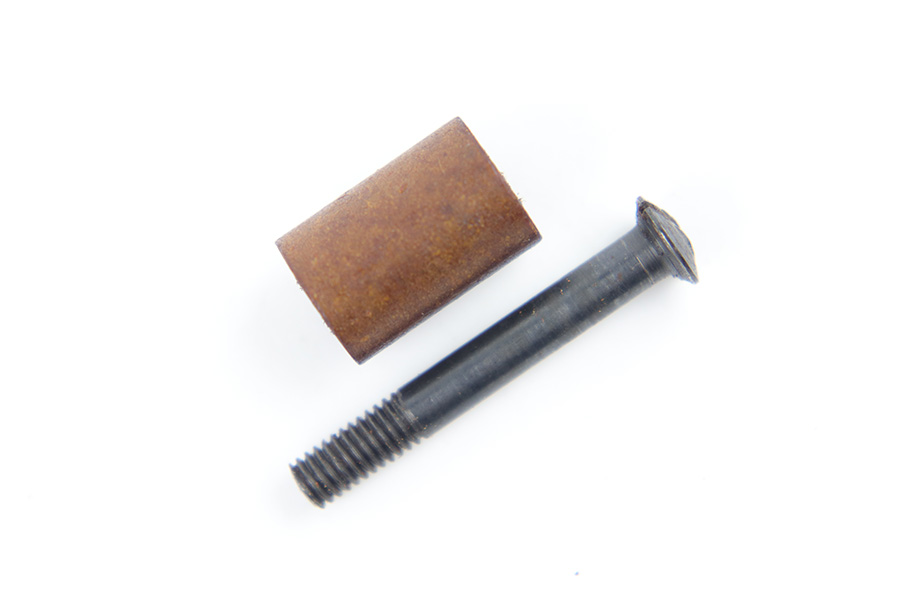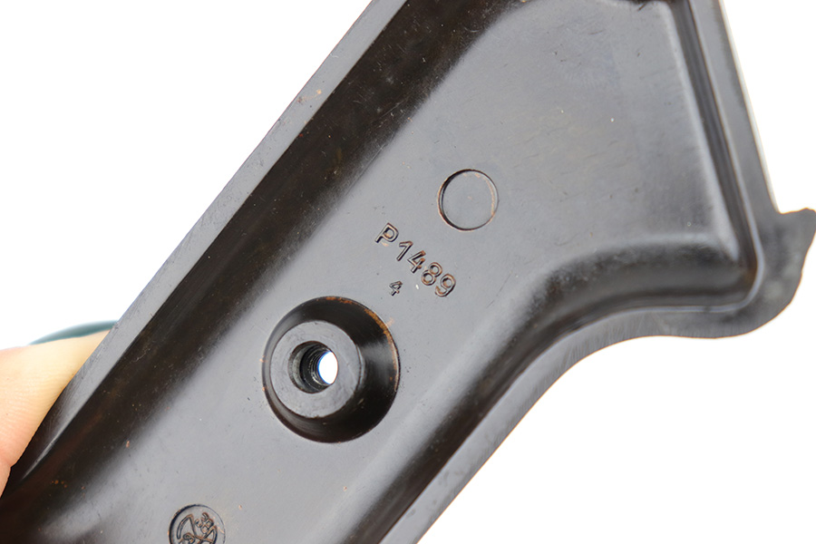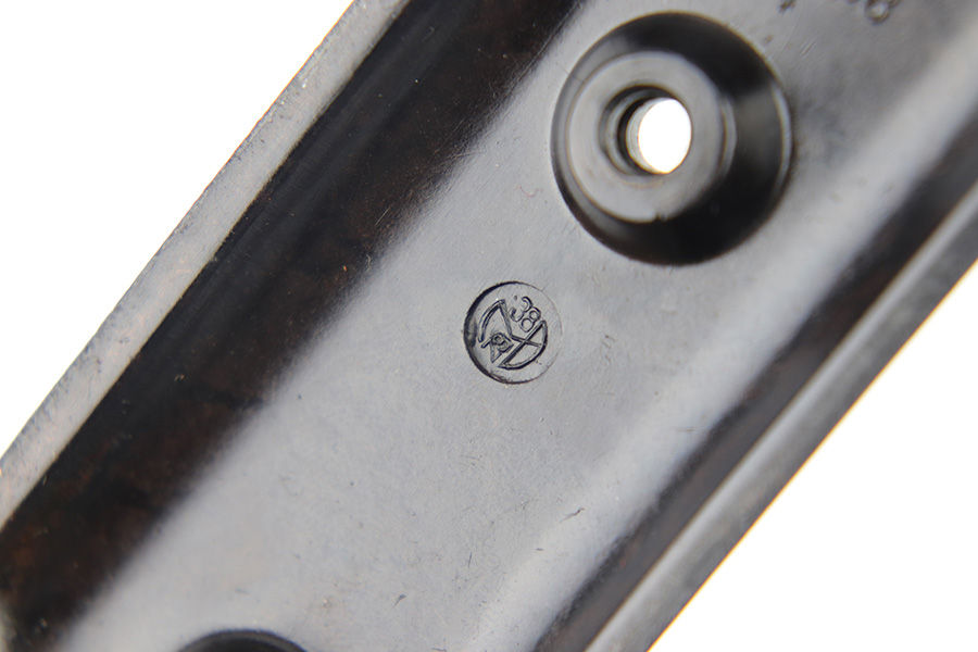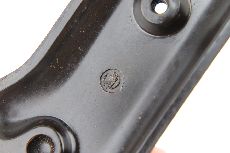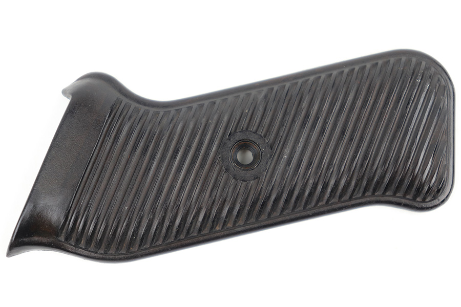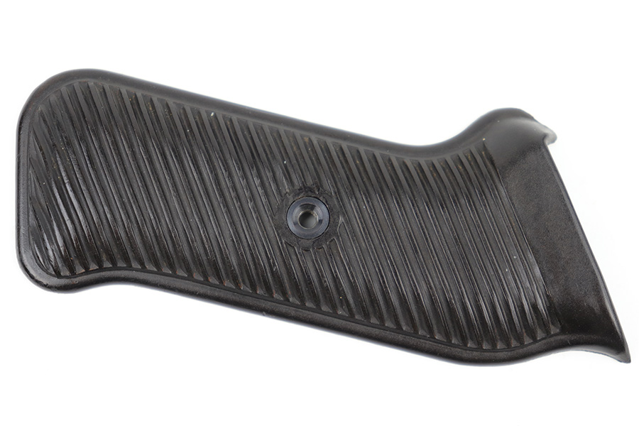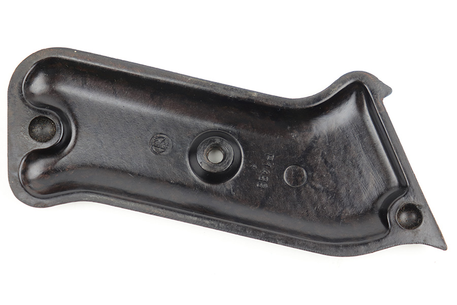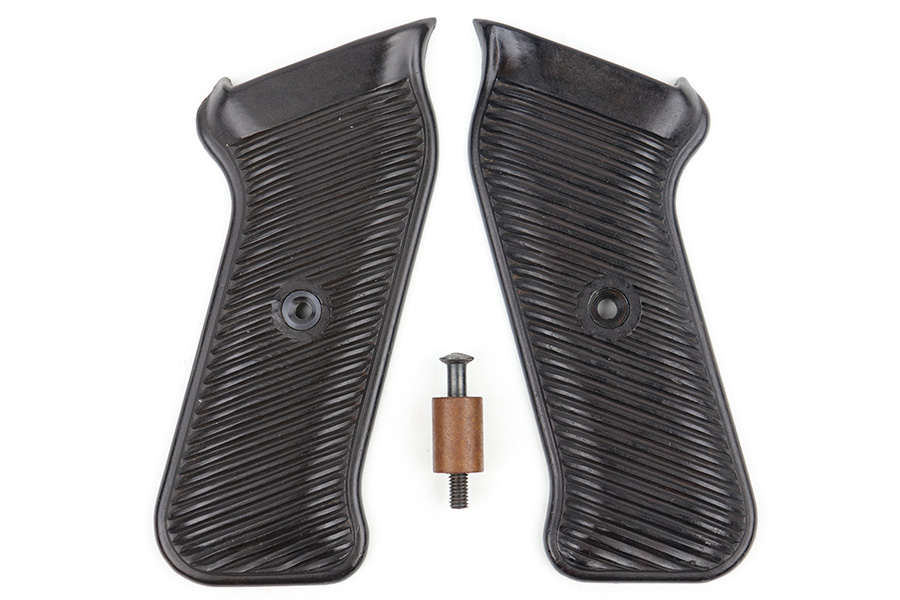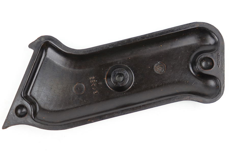 3/29/23 – This is an original WW2 production pair of bakelite MP 40 submachine gun grips. The grips come with an original screw, and a wood buffer that keeps the grips separate when not attached to a firearm. Each grip panel is clean with no cracks or chips, and is stamped on the interior with a formula code, and P 1488 with a “4” underneath. The screw has some light wear from previous use but is in great overall condition.