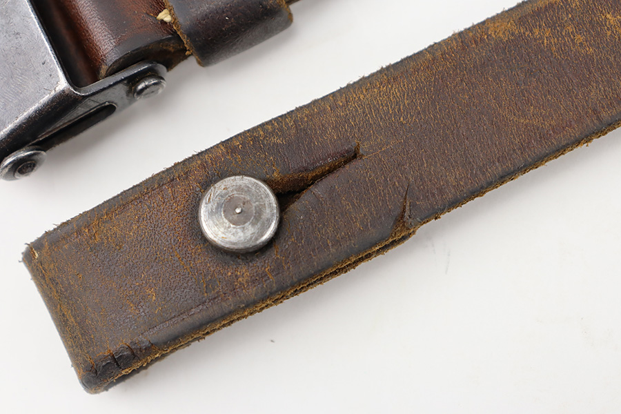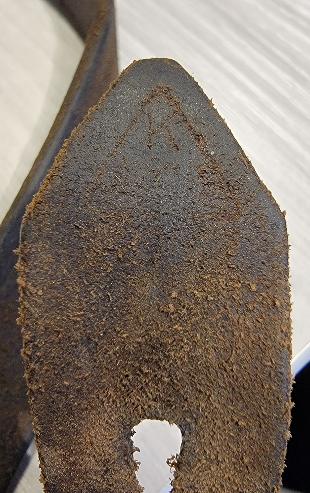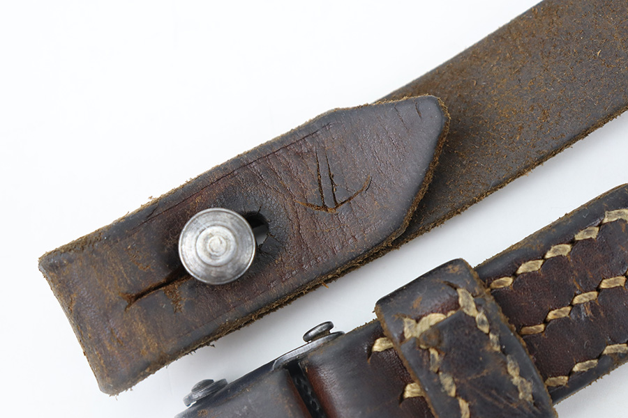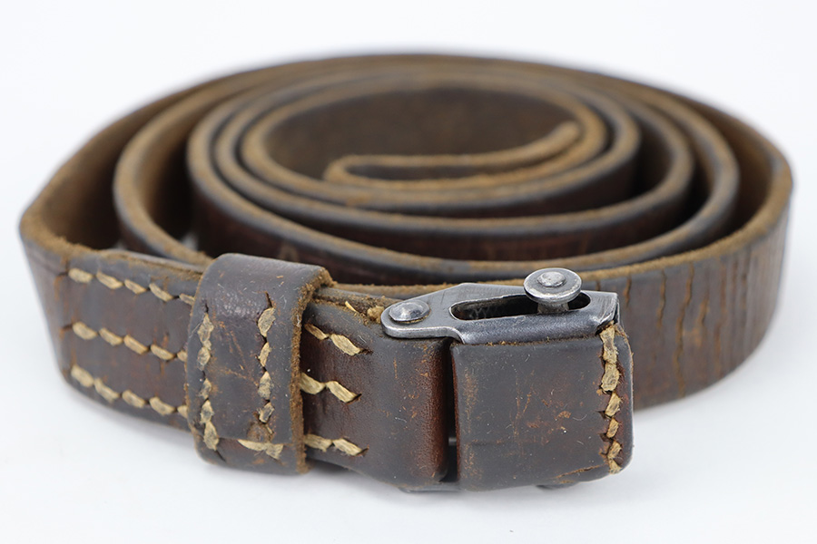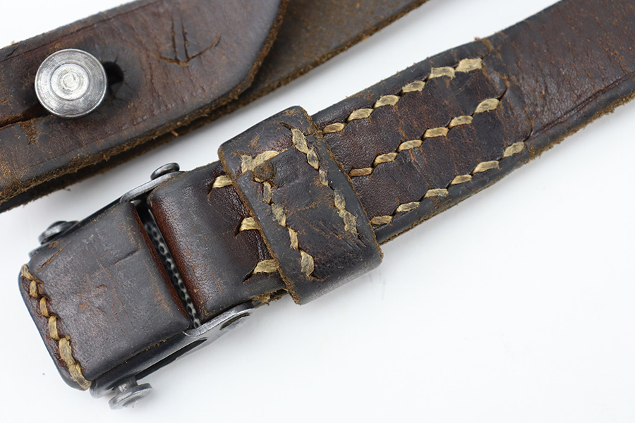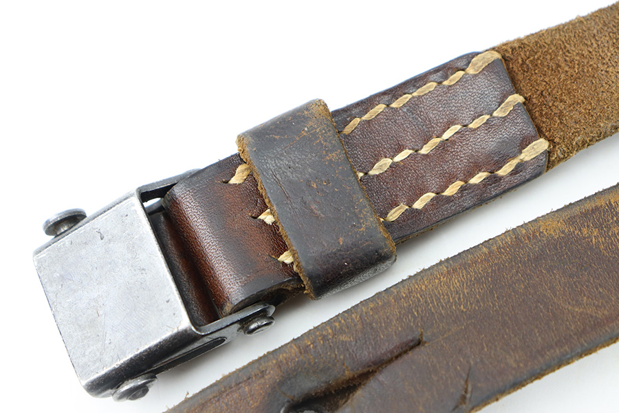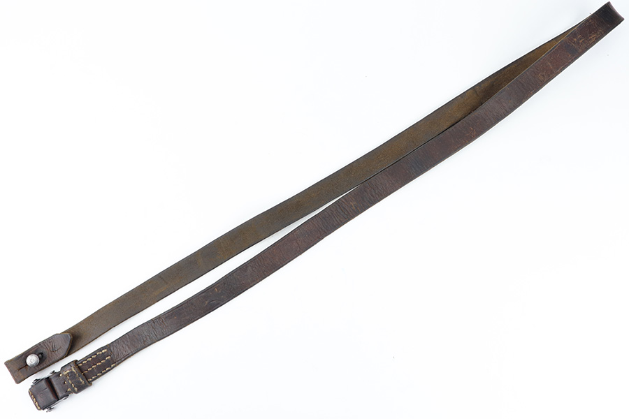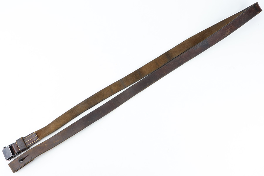 11/30/23 – This is an original MP40 leather sling for the famous German submachine gun. The sling is marked on one end with a faint triangular shaped maker stamp, where only a “K” is visible. The sling is in great overall condition with some natural aging and wrinkling throughout. The leather is soft but completely intact and has no cracks or major issues.