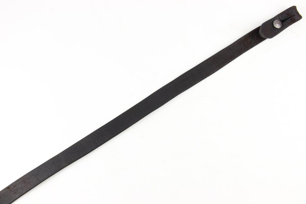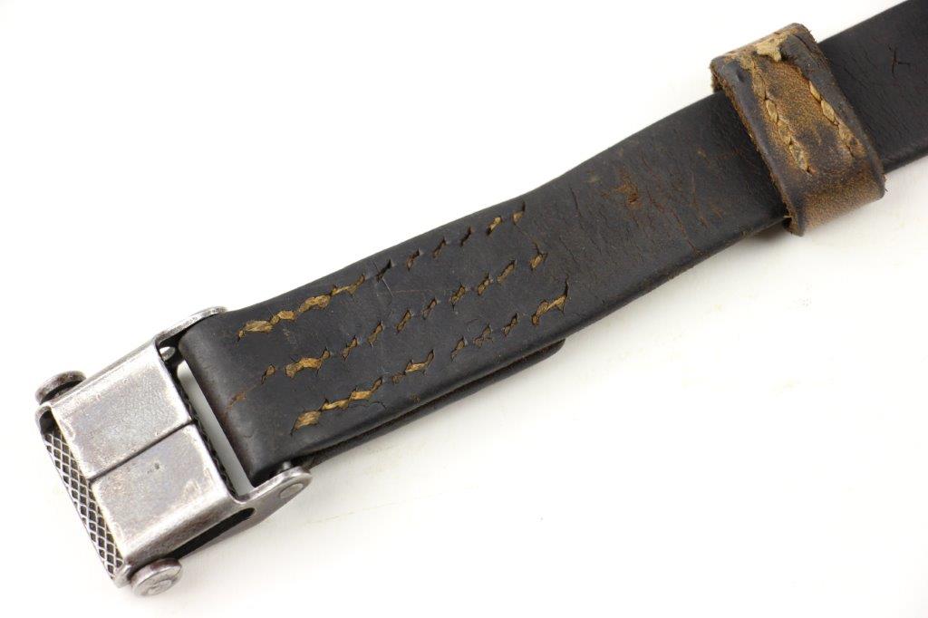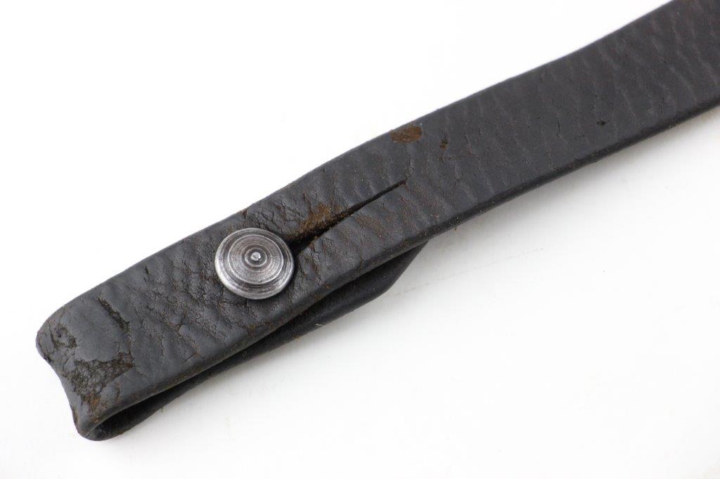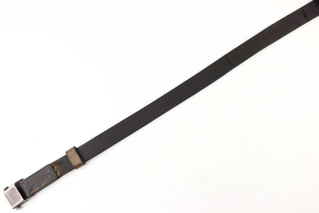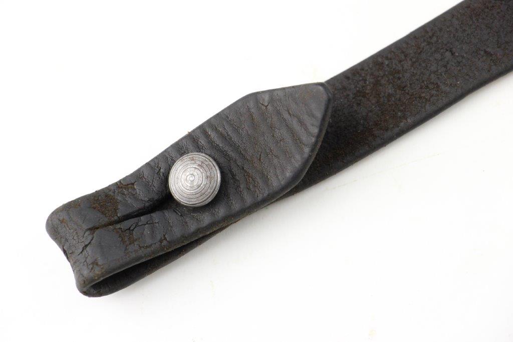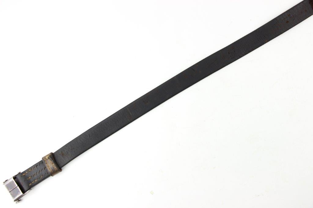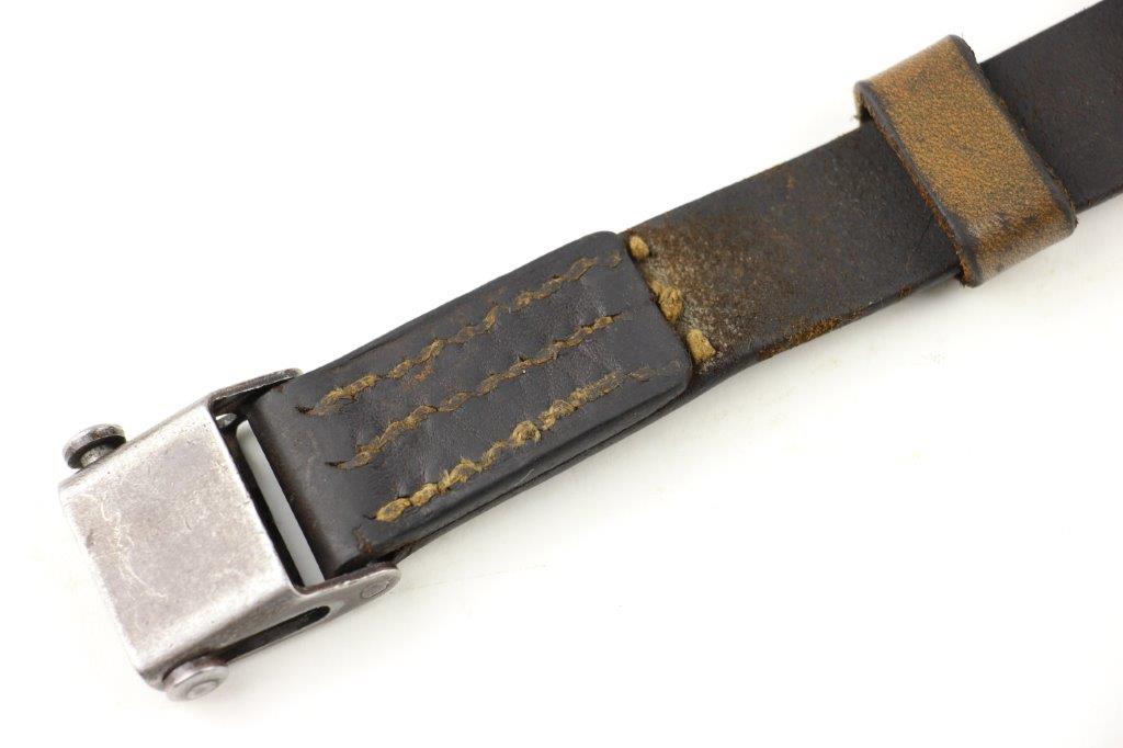 6/16/24 – This is an original WW2 era production leather MP40 sling. The sling is unmarked with normal use and age wear throughout the surface of the leather. There’s a few light scuffs and mild cracking but the leather is completely intact and structurally strong. The stitching is all original with a few loose stitches, but this doesn’t affect functionality or structural integrity. Steel fixtures, correct for wartime production.