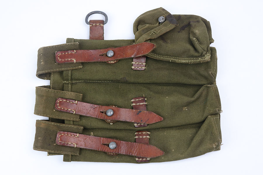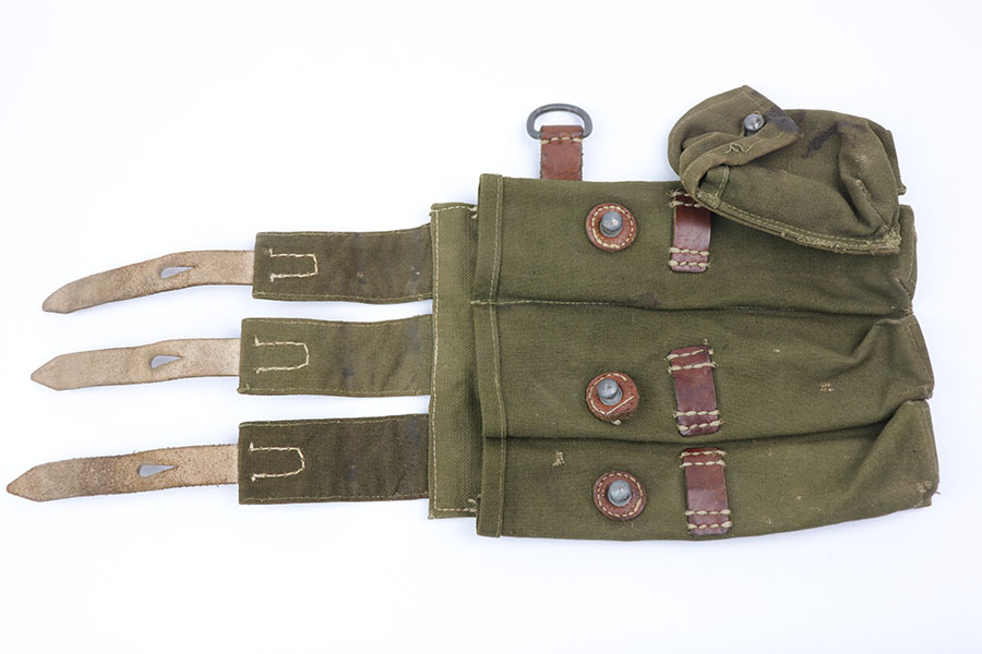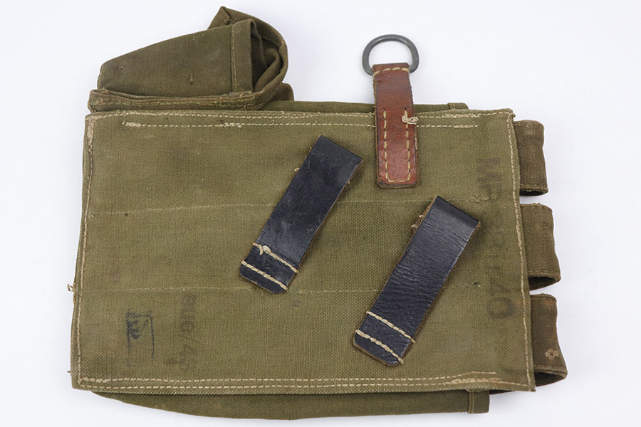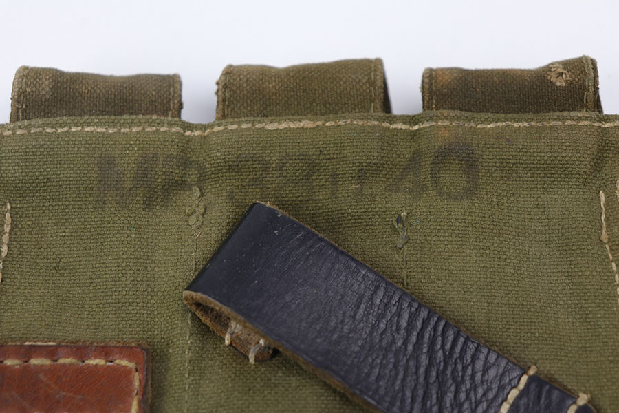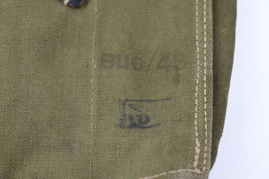 10/15/20 – This is a very rare and desirable MP 40 magazine pouch. Canvas construction with all stitching in tact and no notable flaws. The back of the magazine pouch is maker stamped “eue” and dated “43” with an eagle proof ink stamp underneath. These are faint, yet visible stamps. There’s also a “MP 38u. 40” ink stamp at the top. See photos. These are extremely rare and highly sought after !