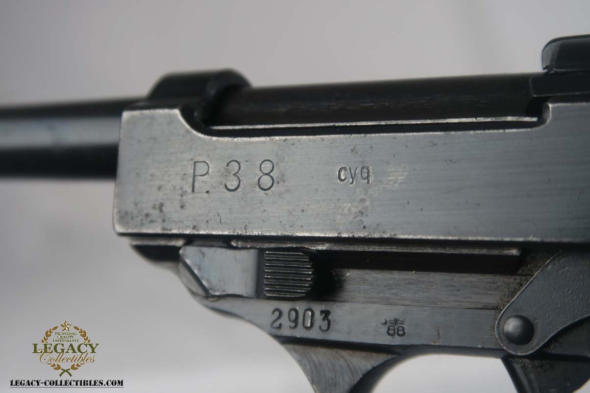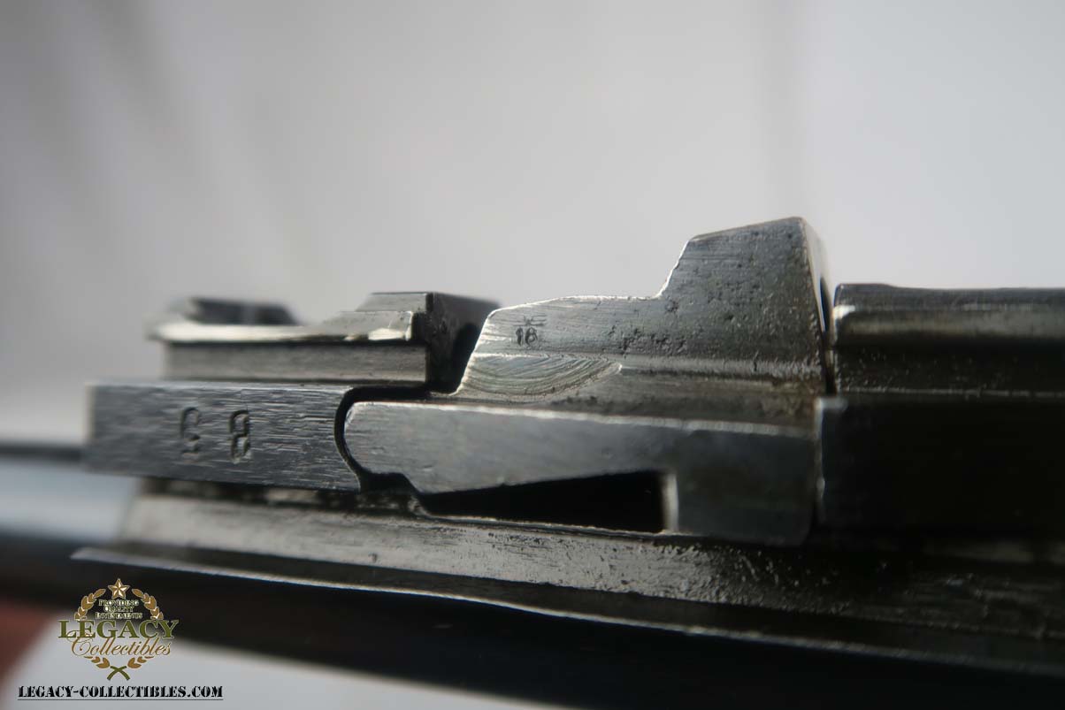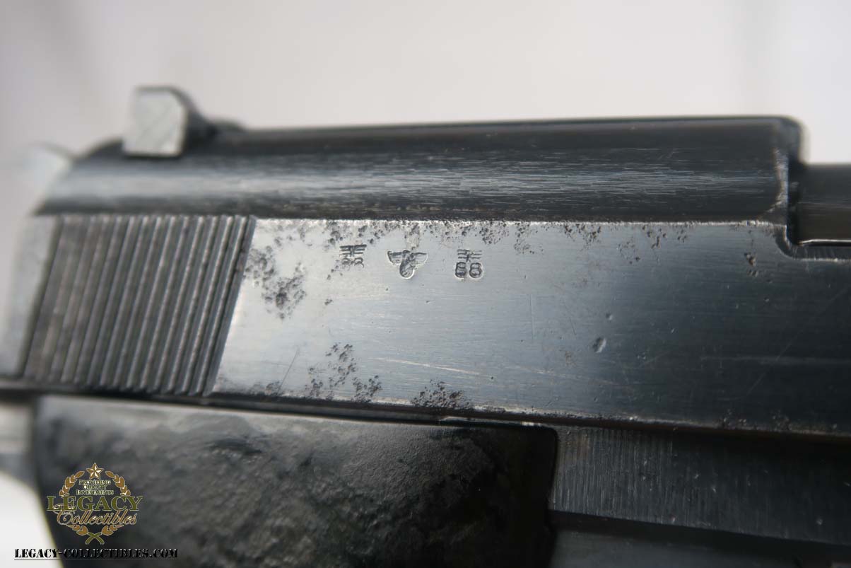 3/23/17 – This is one of the very early CYQ P.38’s with no letter suffix, made in the first month of production at Spreewerke plant. It has all original finish and would be a really nice gun but sat on something corrosive as can be seen as pitting on the back, right side. You will notice that even the top of the grip is corroded a bit. The gun is all matching, but the mystery on this gun is found on the locking block. It has an eagle 18 proof – very small. As reported on the P38 forum this is only found on 7 (now 8) reported guns. I would not have know to look for it except due to my reading about it on the forum. (thanks guys). They are all found in the early CYQ serial range. At this point I don’t think any one knows the meaning for origin of the Eagle 18 proof. Bore is a 6/10, with decent rifling but some frosting/freckling.