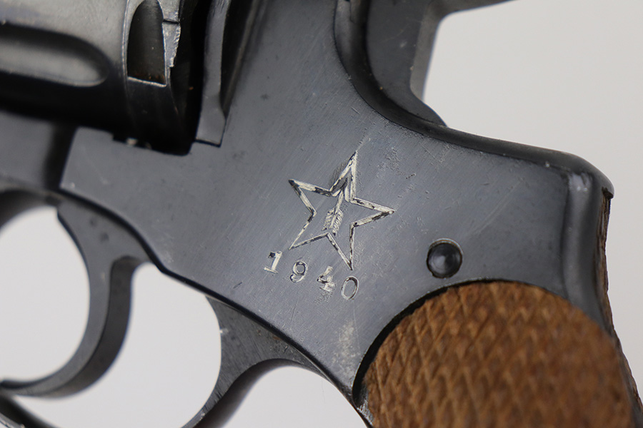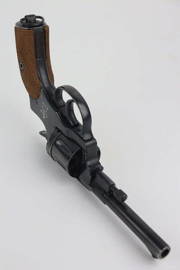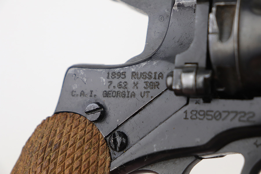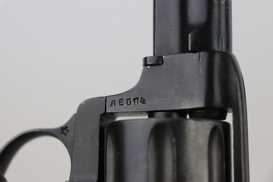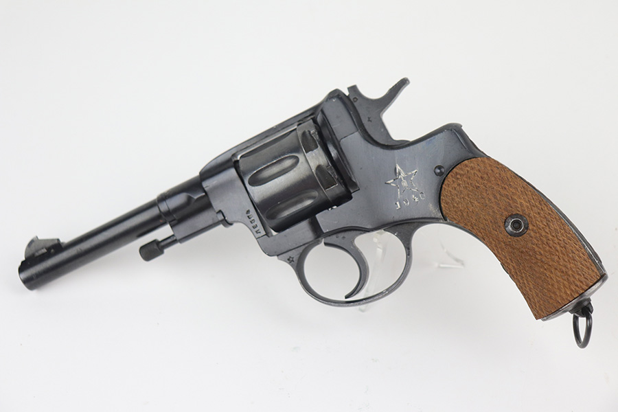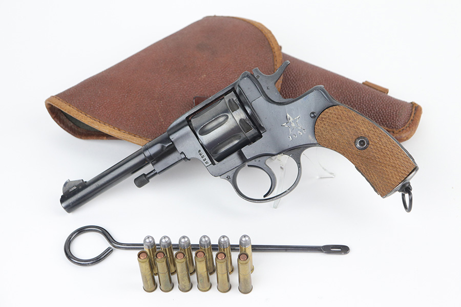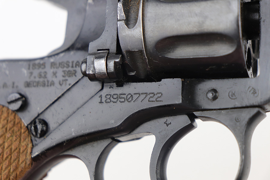 11/19/21 – This is an excellent example of a Russian Nagant Model 1895 revolver manufactured in 1940. It is all matching and has the proper Russian proofs throughout. There is an import mark and an added serial number on the right side of the frame. It comes as a rig with a proper holster (looks like it might be dated 1930), cleaning rod, and 12 cartridges (not dated). The entire gun has been arsenal-refurbished. It has retained about 97% of its bluing. There are small areas of splotchy discoloration here and there, most noticeable on both sides of the frame and on the cylinder. There is what looks like black paint on the right side of frame that is starting to chip away. Comes with minty wood grips. The bore is excellent with strong rifling.